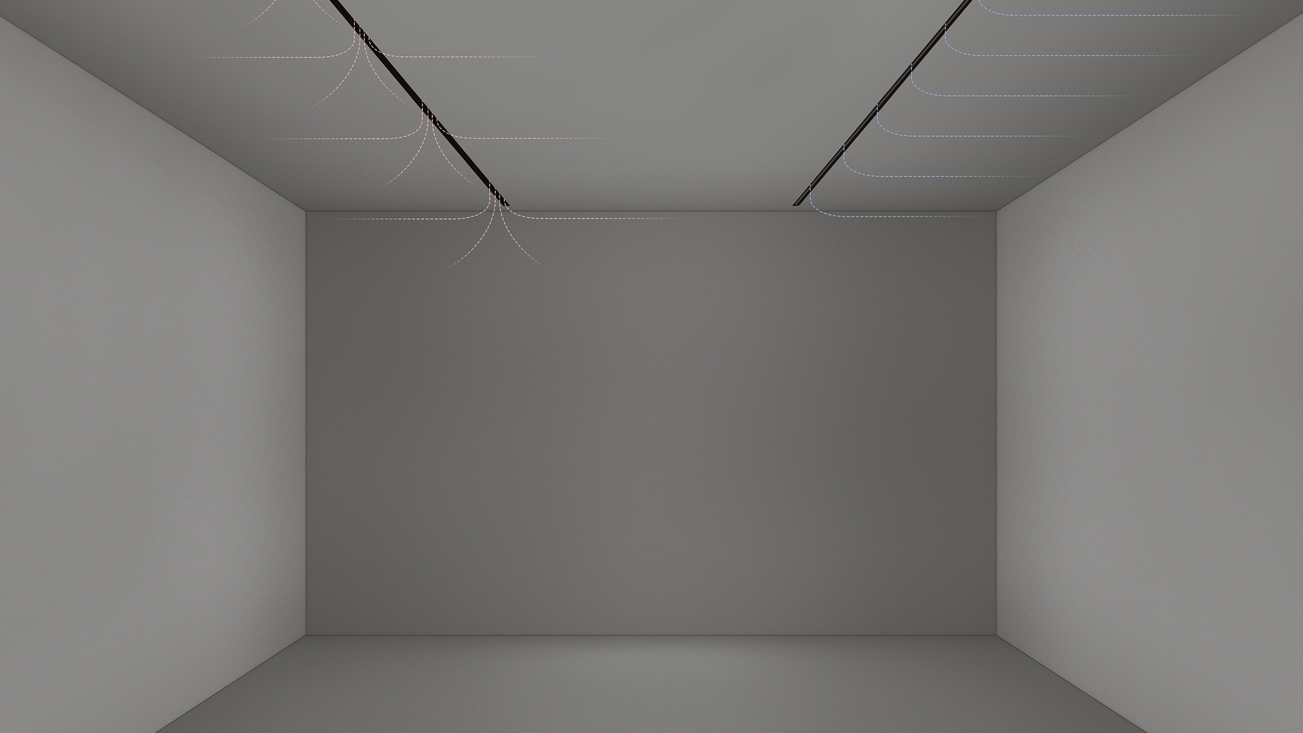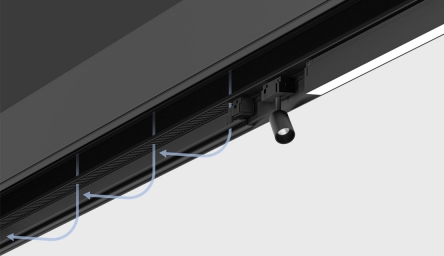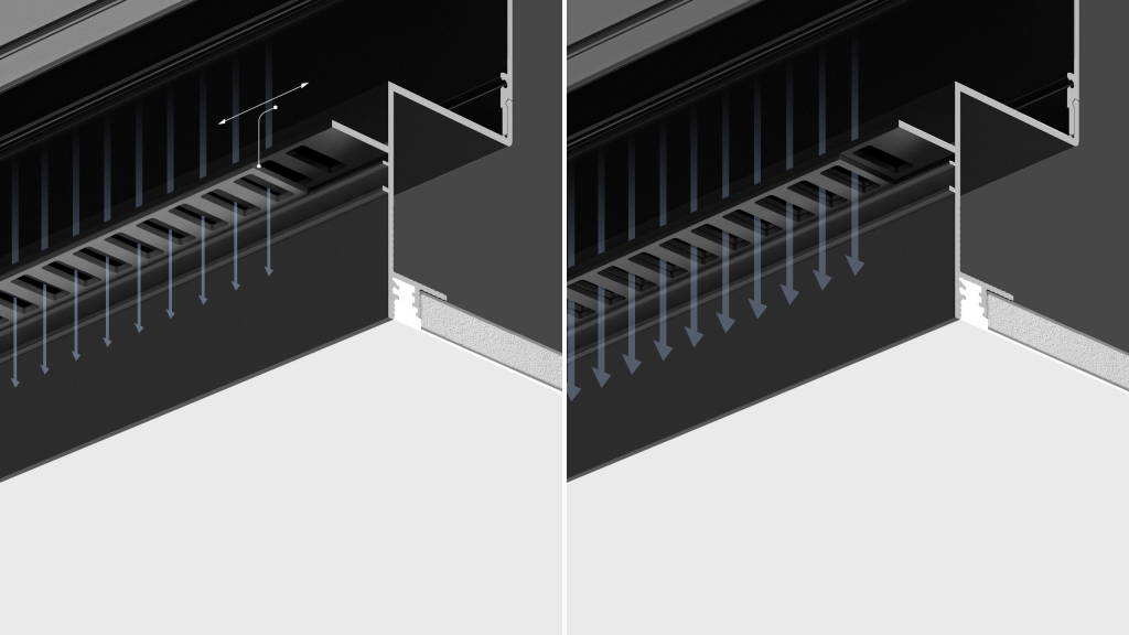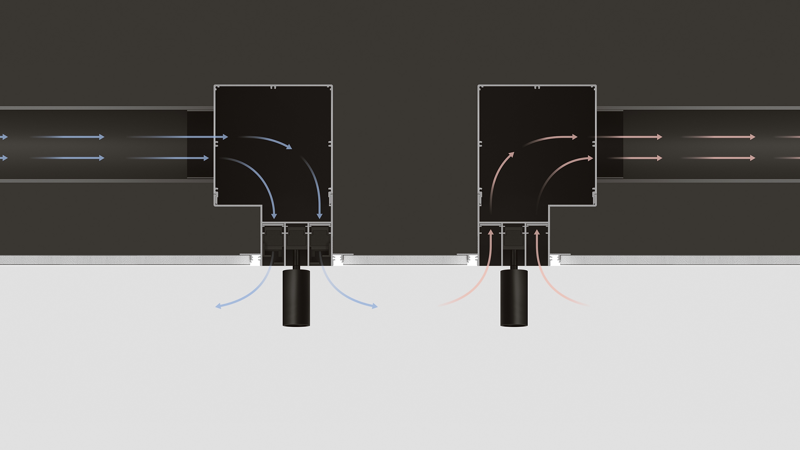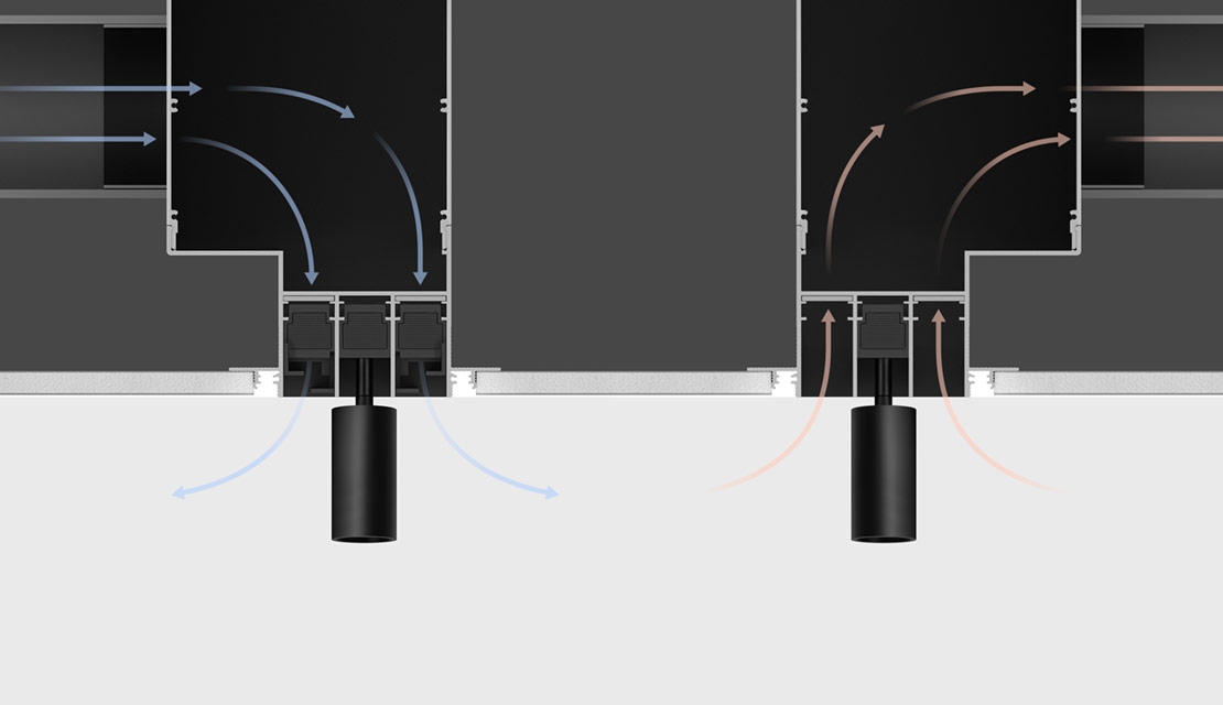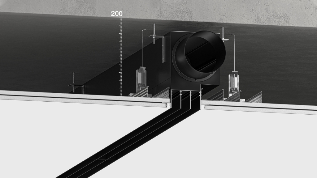 All-in-one solution. It combines Centrsvet Infinity lighting system and slot diffusers that provide high quality air distribution parallel to the ceiling surface.