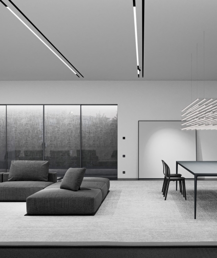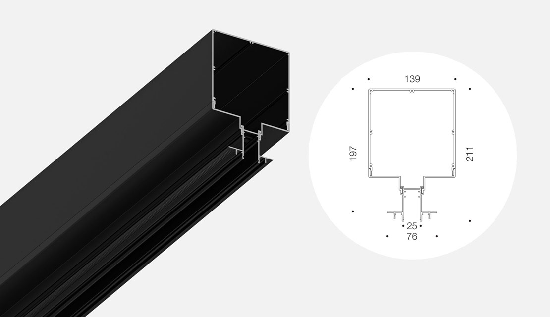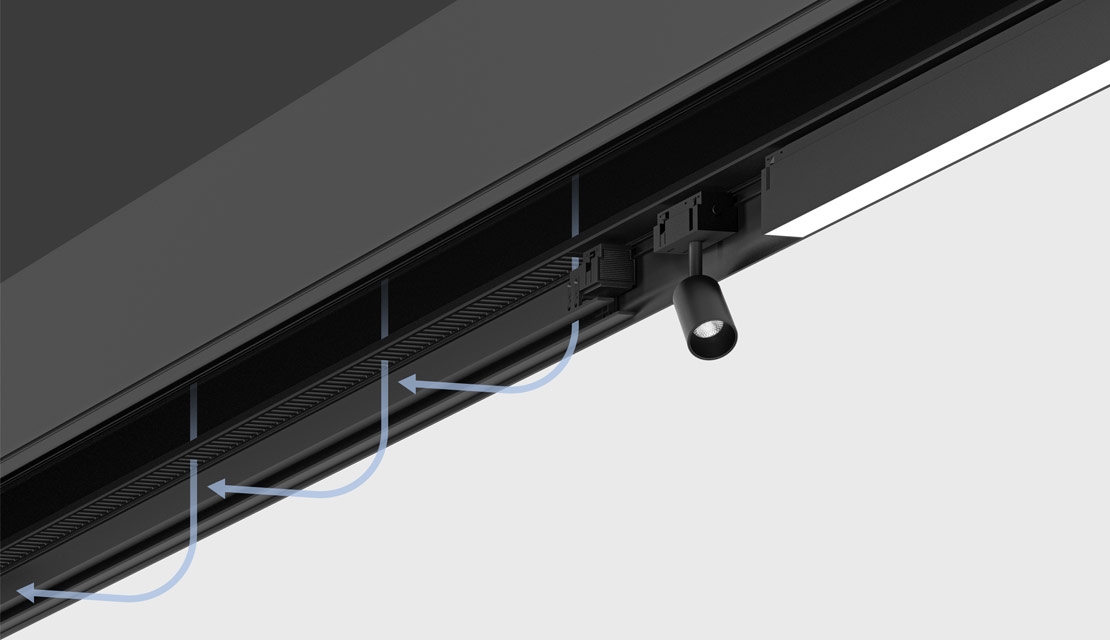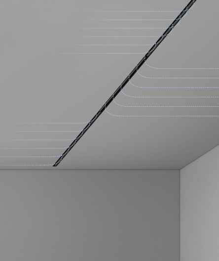 Designed specifically for interiors. The system looks like a fine line. No visible trim. It can be placed both on the ceiling and on the wall.