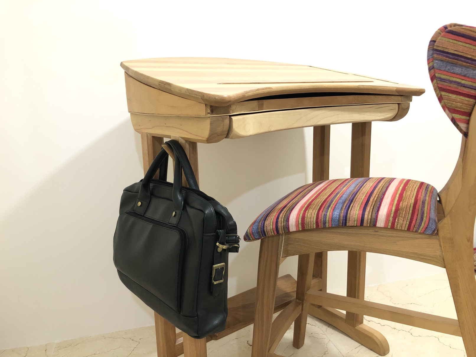 It was also designed to meet students' needs for storage of bags, glasses, paper and pens. On the table, an adapted solution was designed to prevent books and pencils from falling.