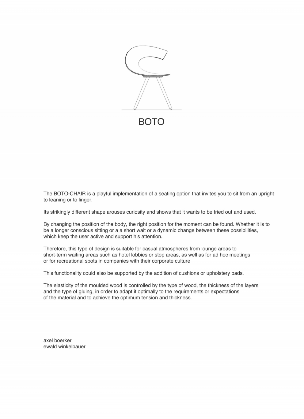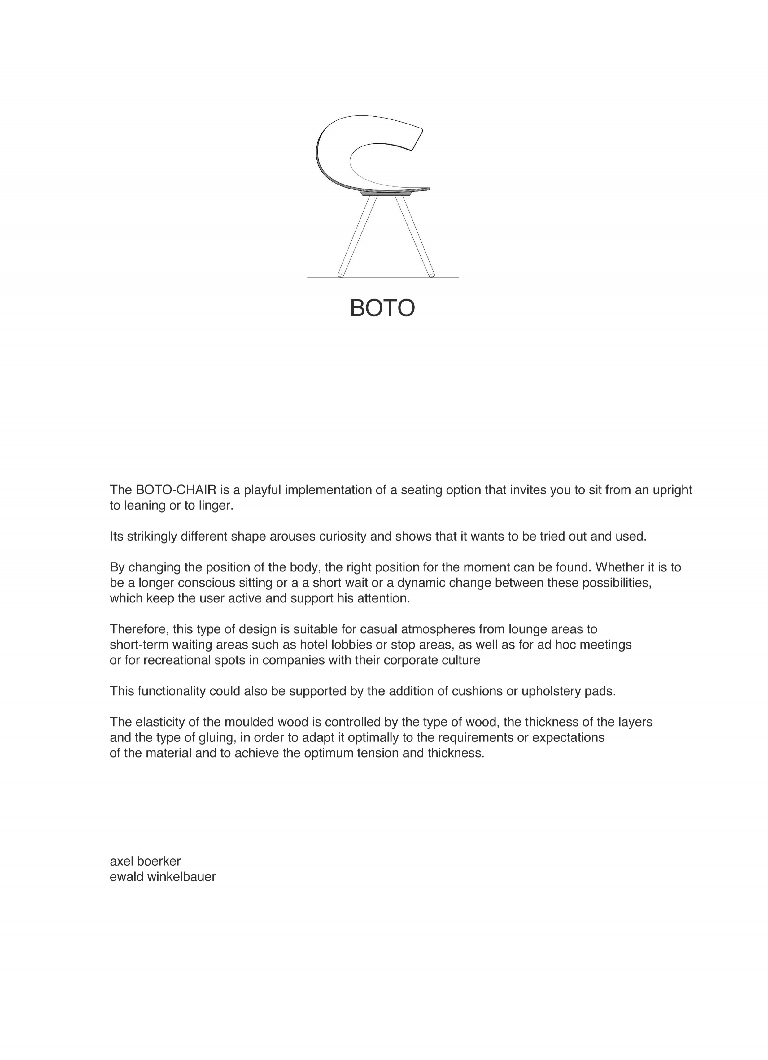 The BOTO-CHAIR is a playful implementation of a seating option that invites you to sit from an upright