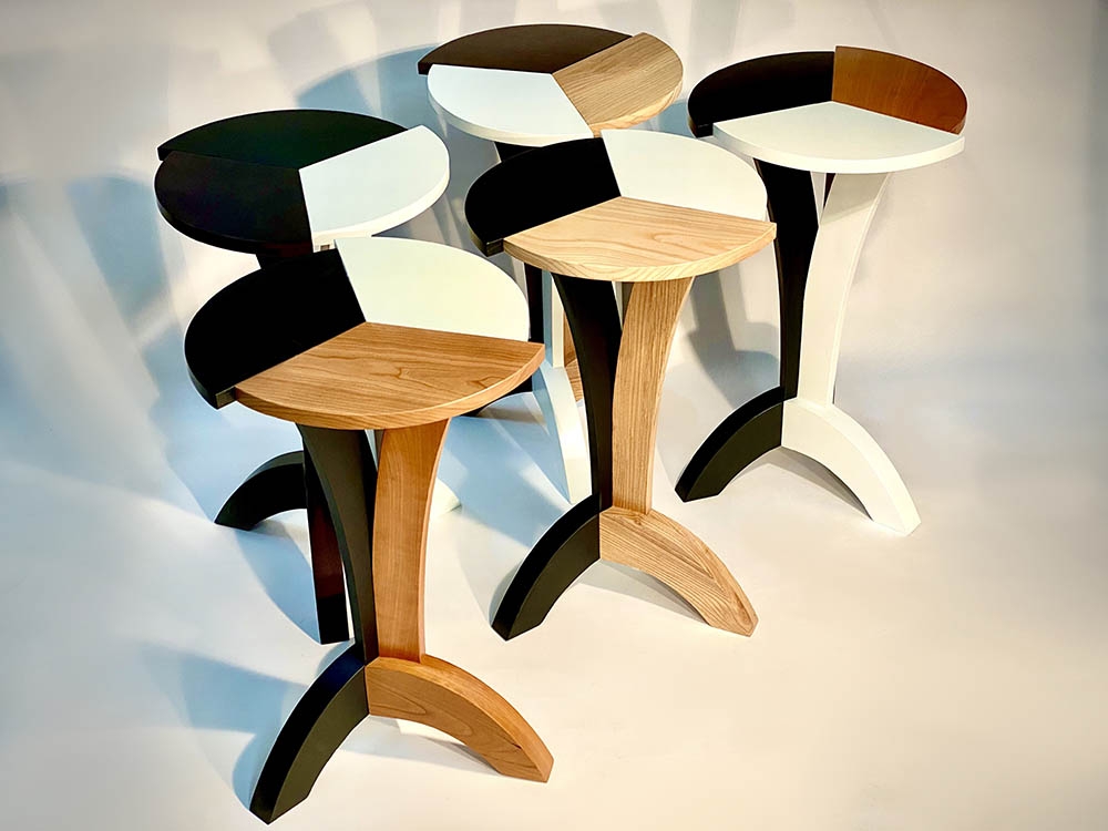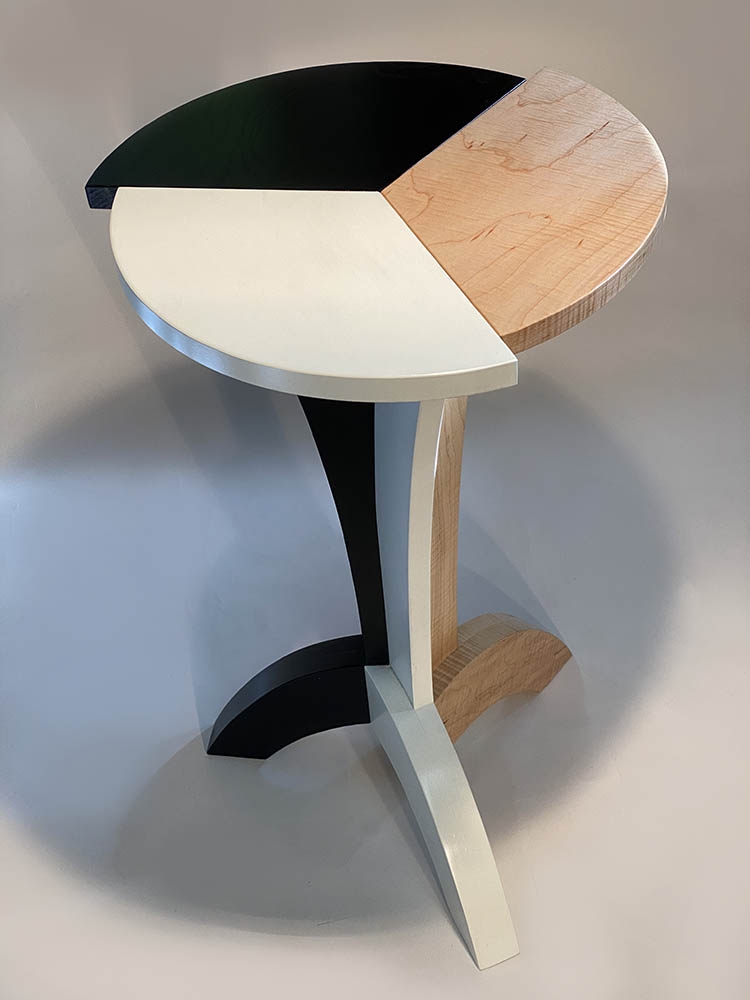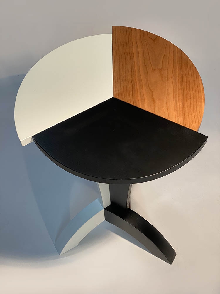 Like the base, the top is composed of 3 interconnected parts that also have their own different characters. An inert white lacquered section (hard maple), a black lacquered section with masked prominent grain (white ash) and a clear lacquered natural section (white ash, maple, cherry or walnut) as a refreshing juxtaposition. It’s no coincidence that the slightly menacing offset corners reach out as the design rotates.