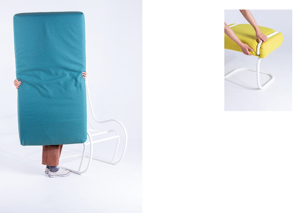It includes two parts, in soft and hard. The basic structure is made with one steel tube. It forms the overall shape. The cushions are squeezed into ergonomic shapes for human body. The contrast between materials achieve balance in some point. People are free to choose the color they like to finalise the design. It is a kind of joy.