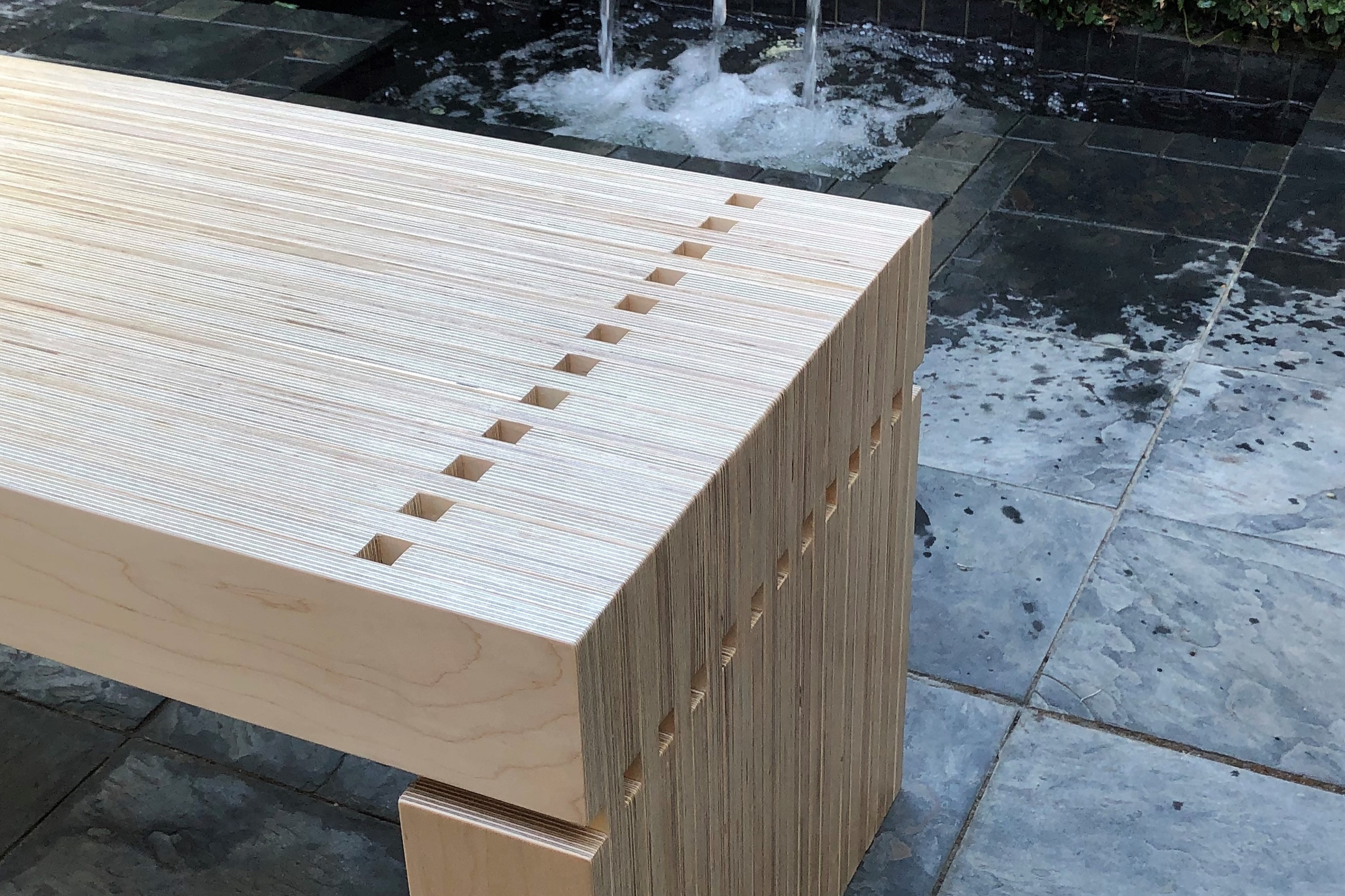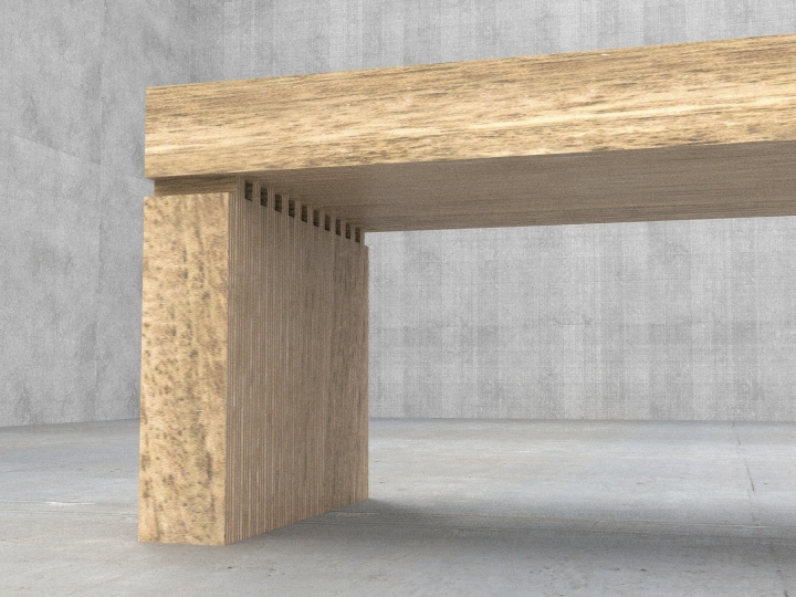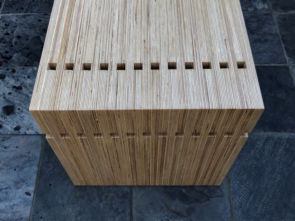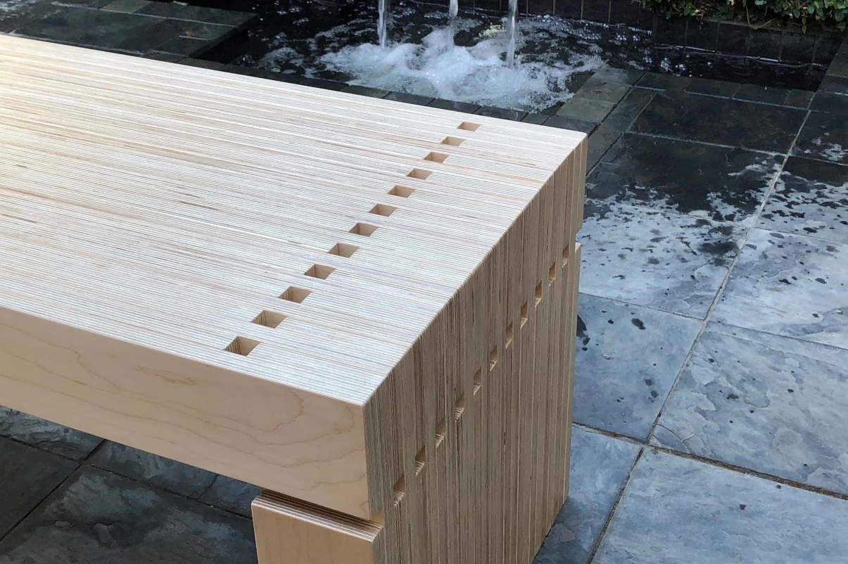 Many perceive plywood as a commodity material used in applications such shear walls in wood frame buildings and for temporarily boarding up broken windows. The designer sought to take on the challenge of creating a high-end piece of plywood furniture that would overcome the stigma of conventionally used plywood. Focusing on plywood’s distinctive laminated plies, the 2323 Bench’s top, bottom and side surfaces emphasize the material’s alternating contrasting layers.
