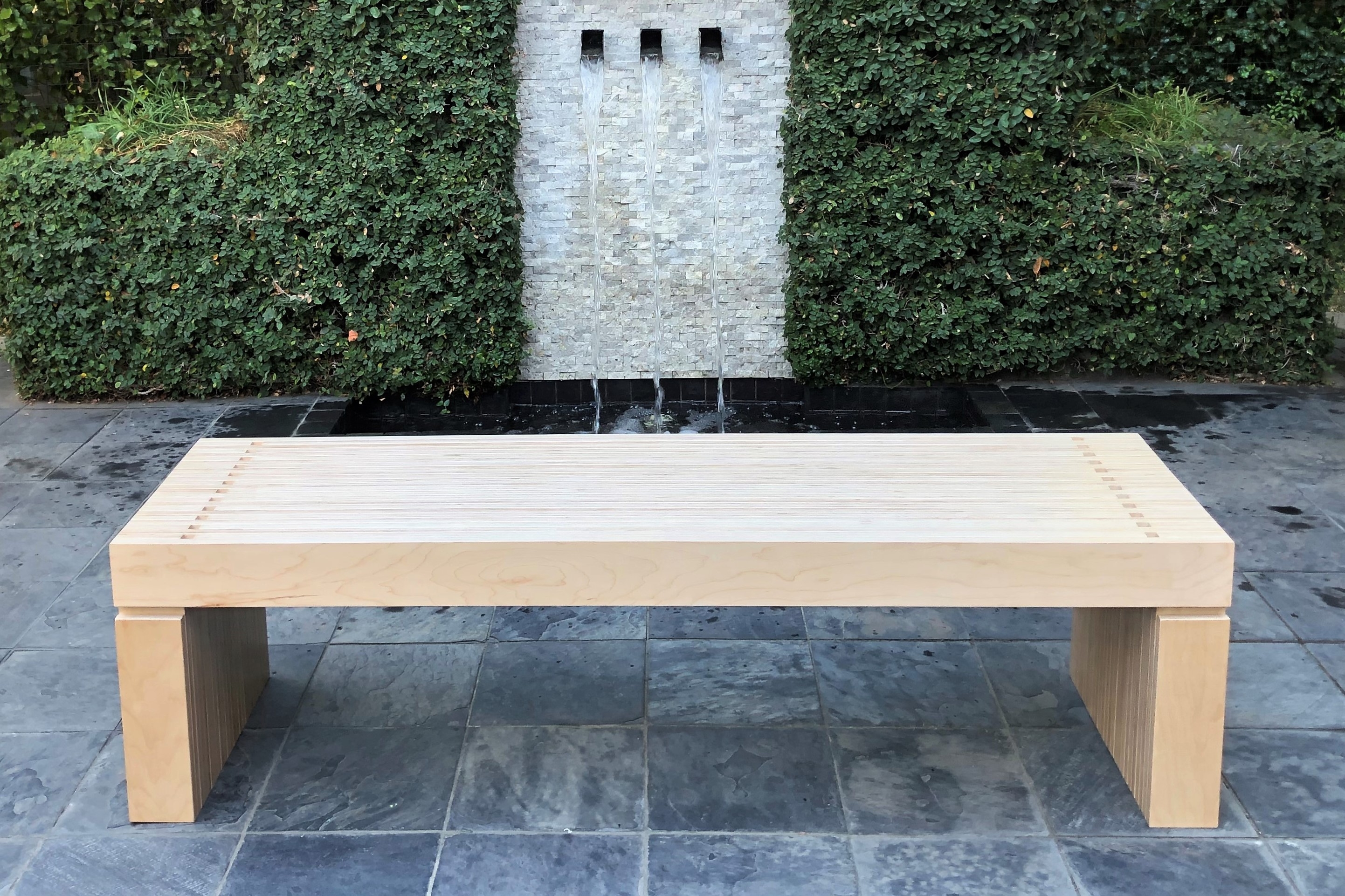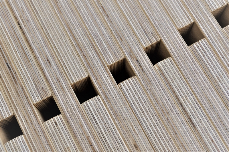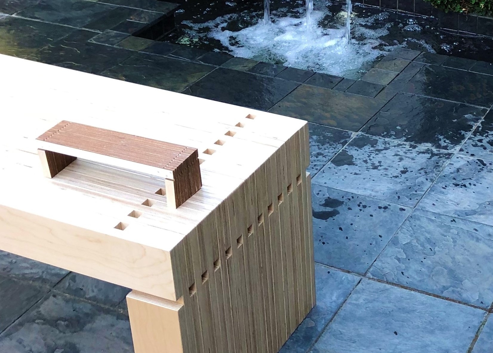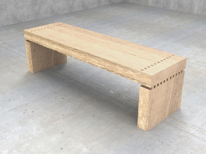 Many perceive plywood as a commodity material used in applications such shear walls in wood frame buildings and for temporarily boarding up broken windows. The designer sought to take on the challenge of creating a high-end piece of plywood furniture that would overcome the stigma of conventionally used plywood. Focusing on plywood’s distinctive laminated plies, the 2323 Bench’s top, bottom and side surfaces emphasize the material’s alternating contrasting layers.