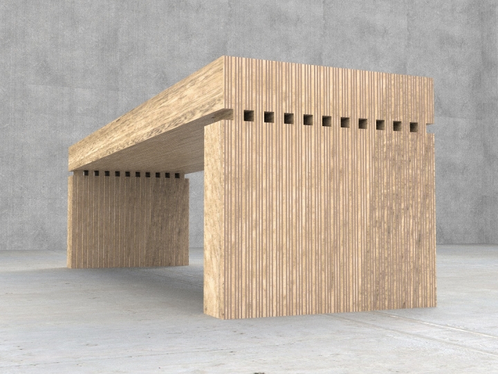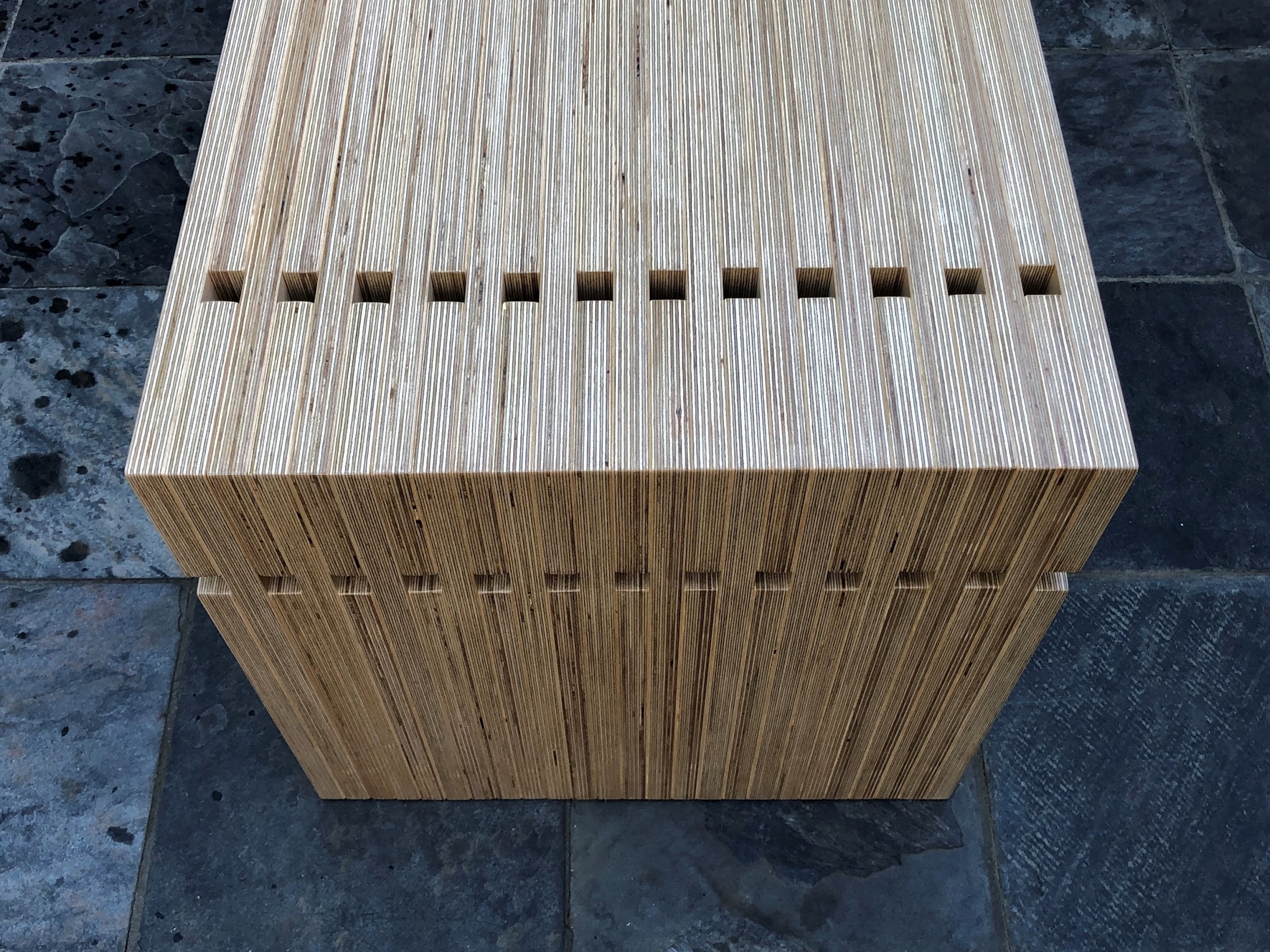 The 2323 is made from seventy-five 4” (100mm) wide maple plywood planks that intersect at its exterior edges. The “legs” and horizontal members consist of alternating shorter and longer parts. The shorter parts extend to a dimension of one plywood thickness from their corresponding mating parts, resulting in the 23 square perforations on each side of the bench, the detail that led to the bench’s 2323 naming.