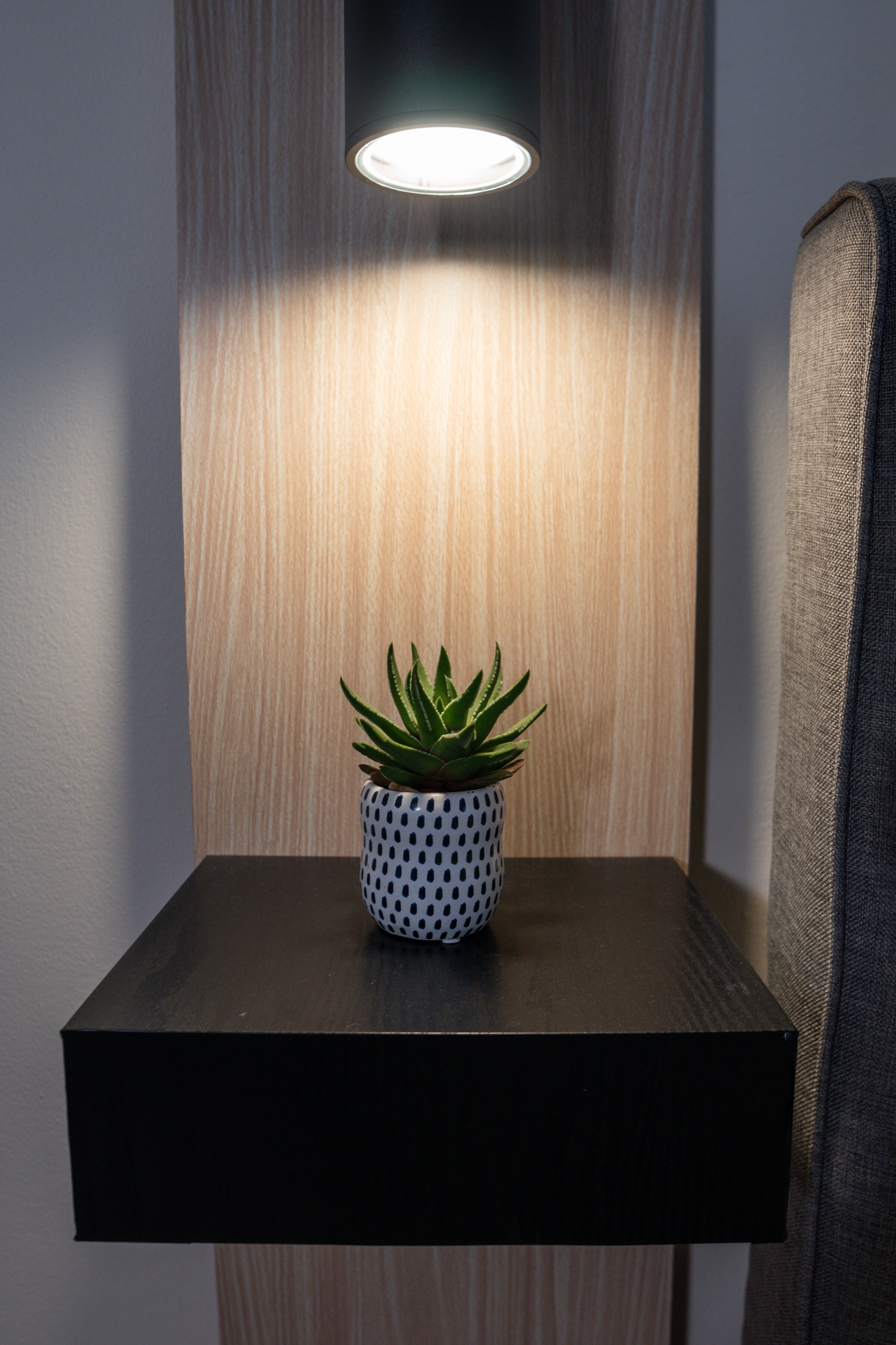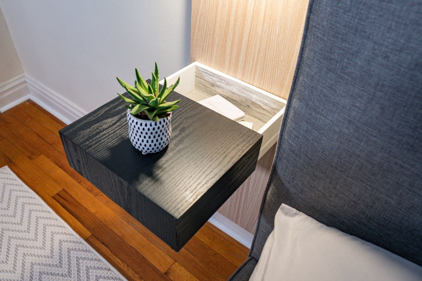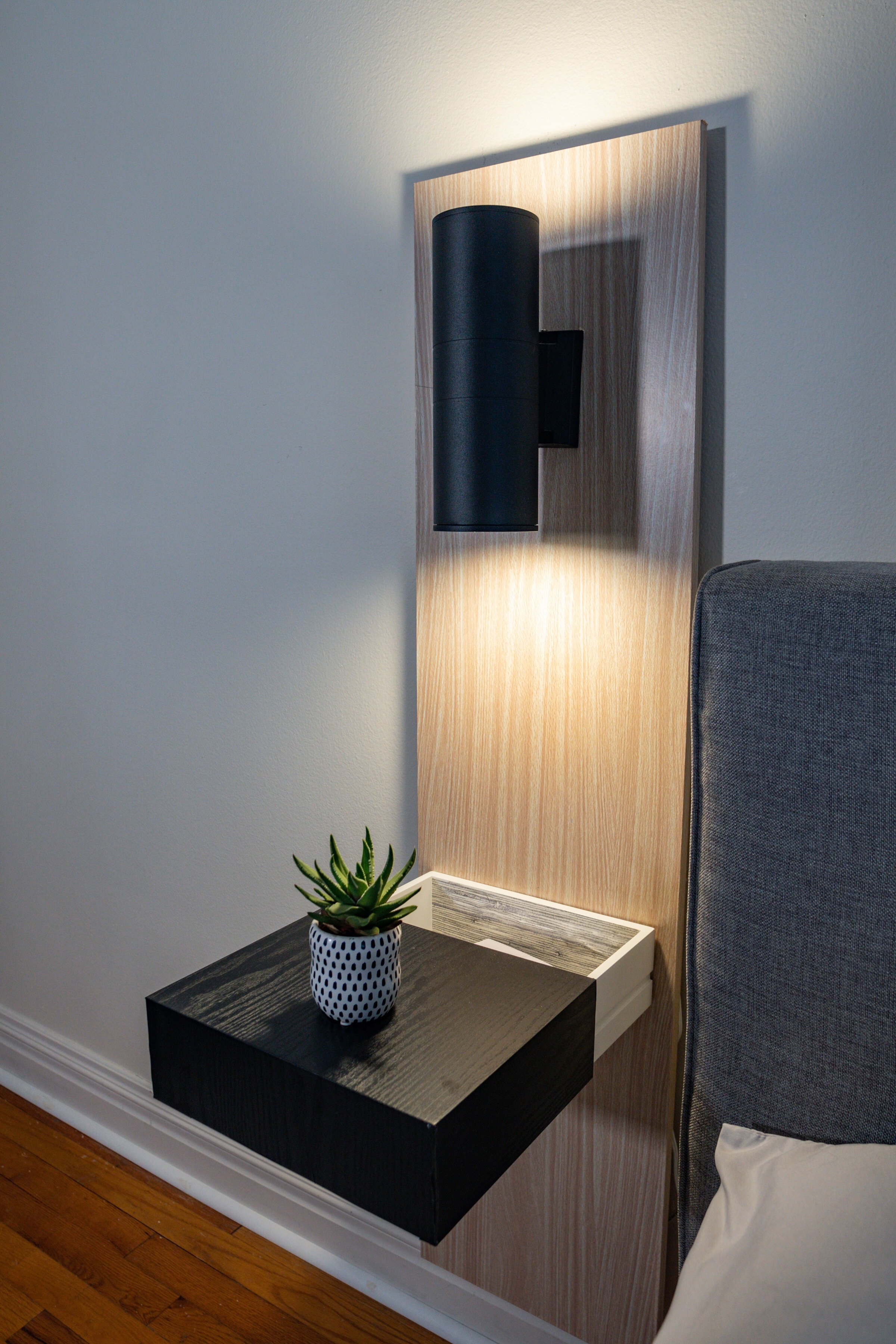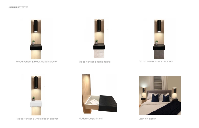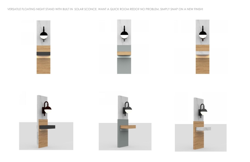 Inspired by the versatility of design through traveling, Lisanin is a versatile floating nightstand with hidden drawer and solar sconce in one. Want a quick room redo? No problem, simple snap on a new finish! Having to purchase a new nightstand, sconce, and having to hardwire the lighting is now a thing of the past. Lisanin provides an easy alternative for do it yourselvers who want a quick makeover for the fraction of the price. Simply attach the panel onto the wall you desire. Tired on the same finishes? No problem, with Lisanin's versatility you can easily snap a new finish onto the panel.