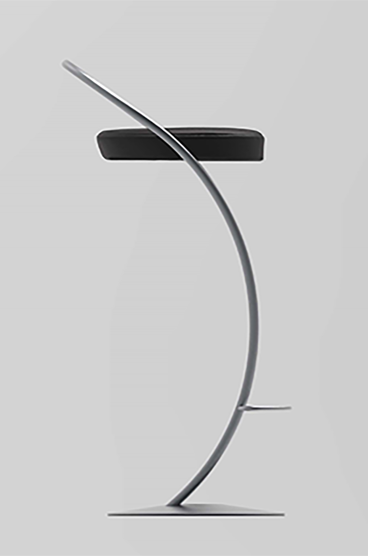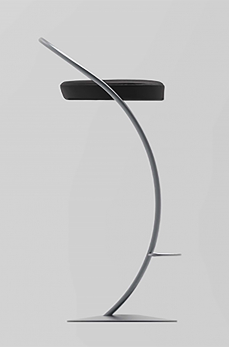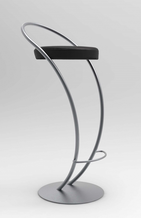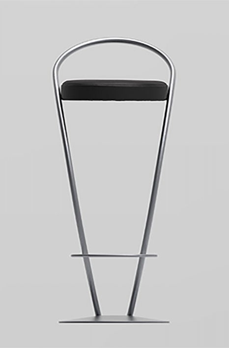 Significant sign of the stool is the one and only piece of a free curved and symmetric steel pipe, which in one builds the whole static support system for a back- and the footrest as well as a padded seat holding by two suspension points.