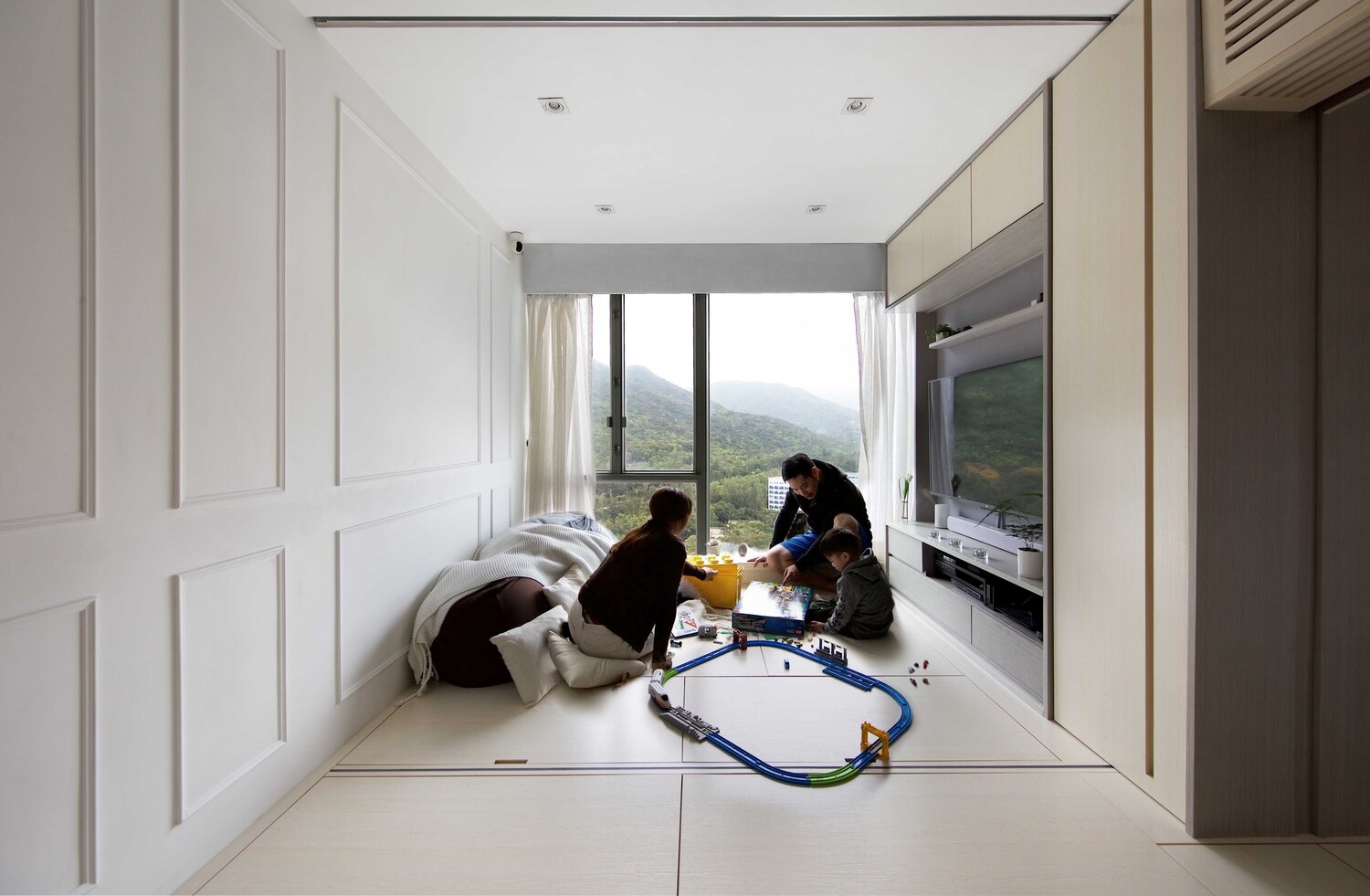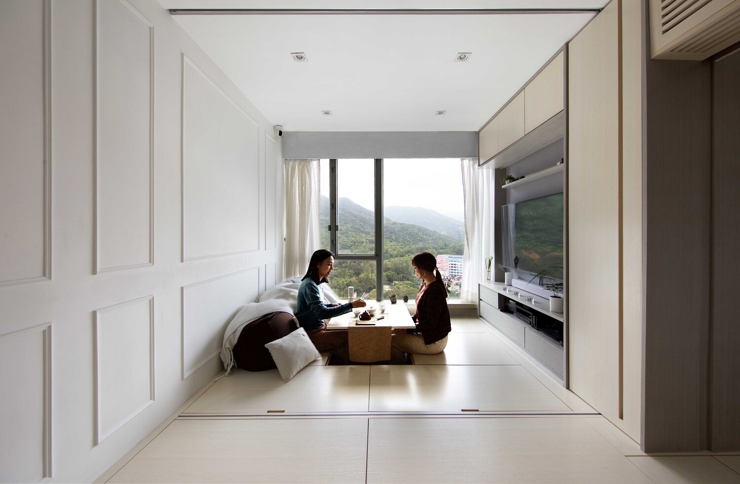 The owner of the apartment is a busy young couple, Eric and Lory. Sim-Plex uses the concept of the Zendo to bring the view of the scenery outside the window into the house. The integrated TV cabinet wall and the wooden floor platform are plain and warm, but yet there were a large number of intelligent devices hidden by.The design is also integrated to the traditional Feng Shui doctrine, to create a spiritual space where tradition and technology,people, and scenery are combined.
