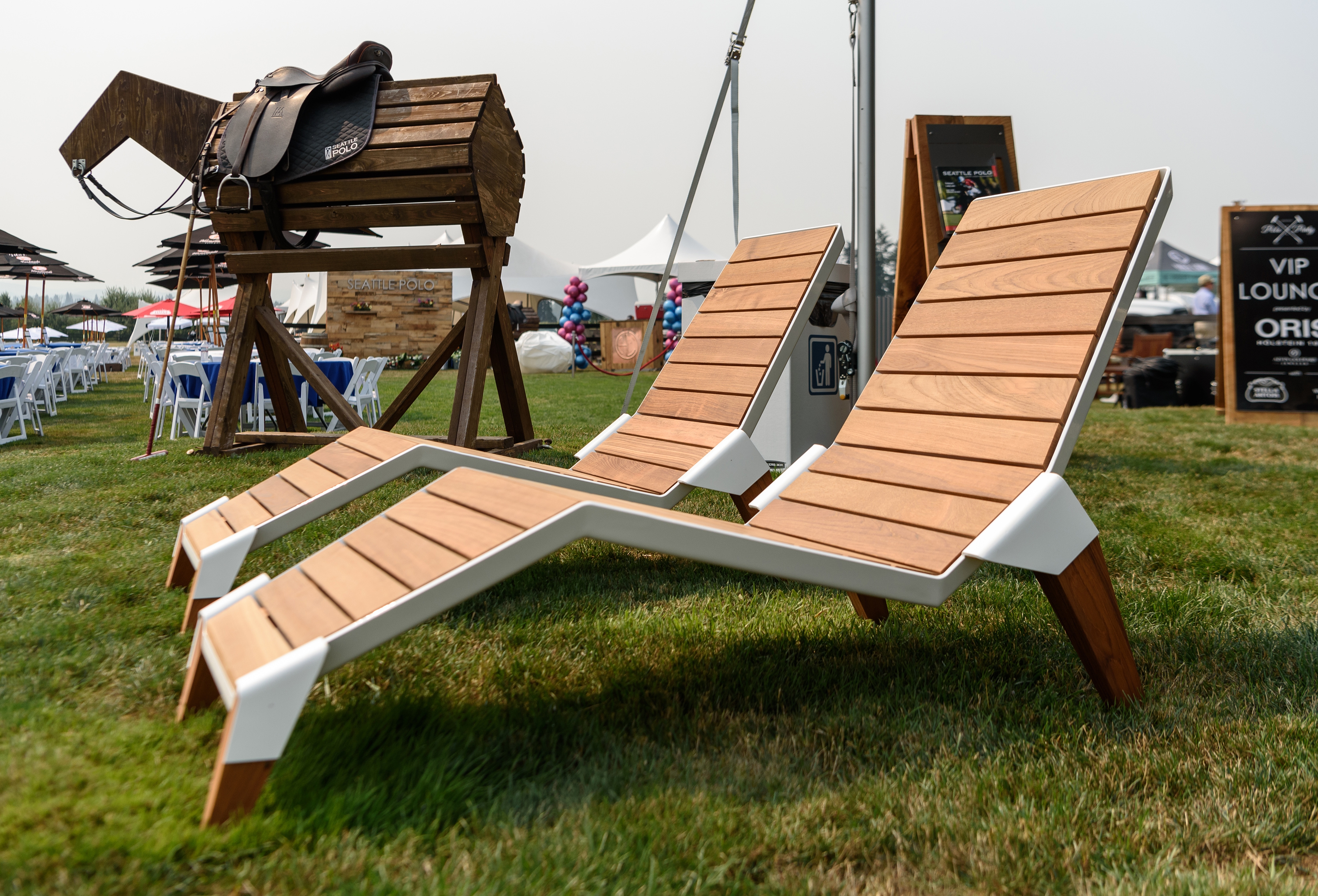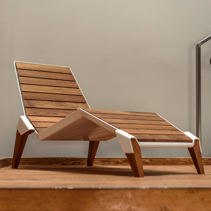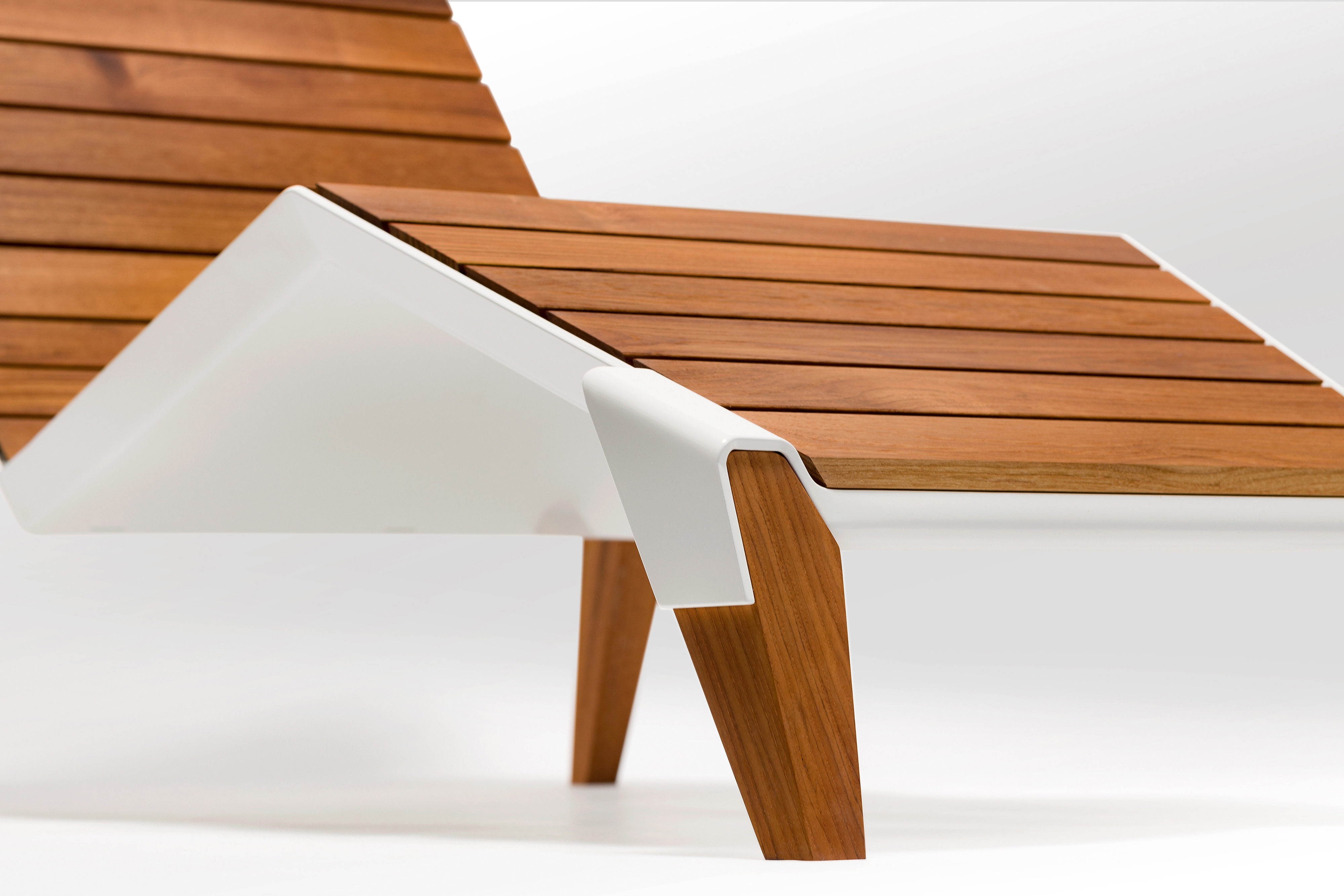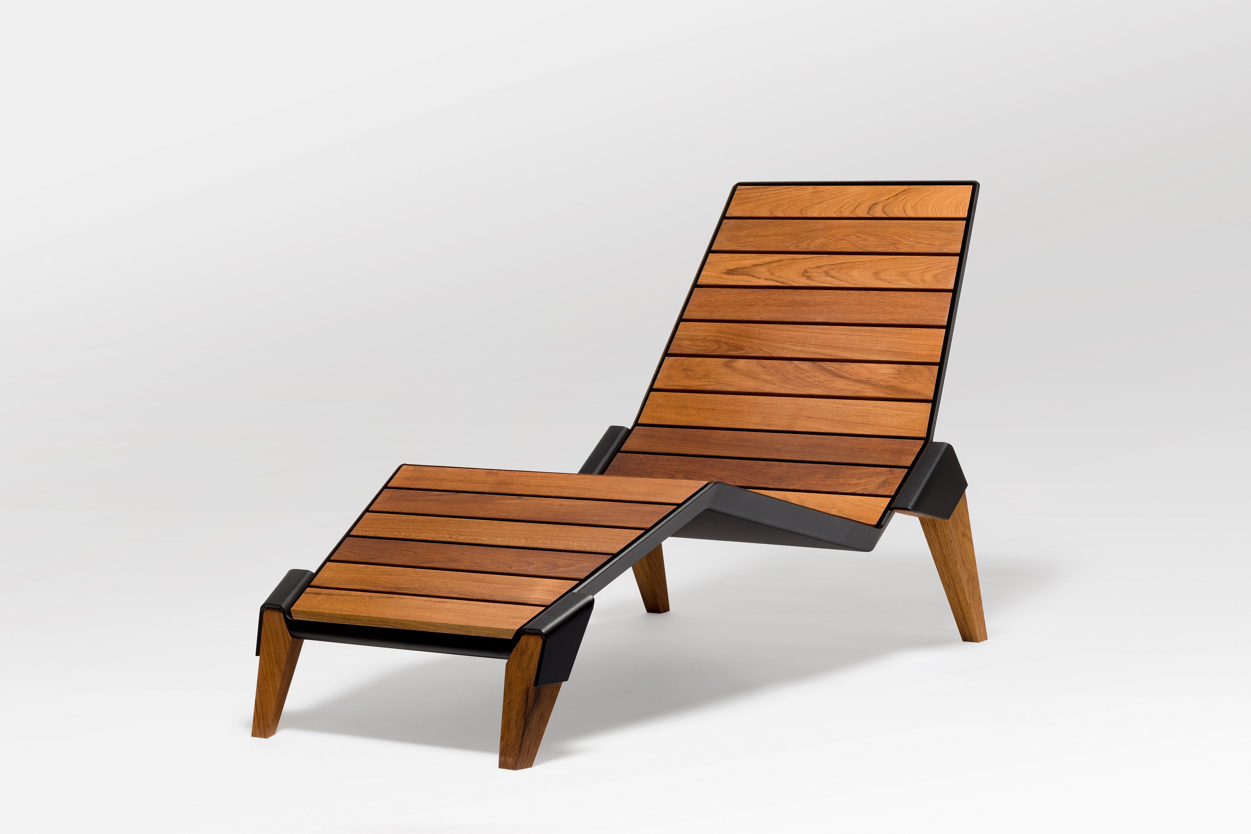 The bent legs create a shorter lounge chair that fits in smaller spaces while the upright position promotes interaction with others. The use of powder coated aluminum sheet metal and teak provide ample protection to the elements in an outdoor environment.