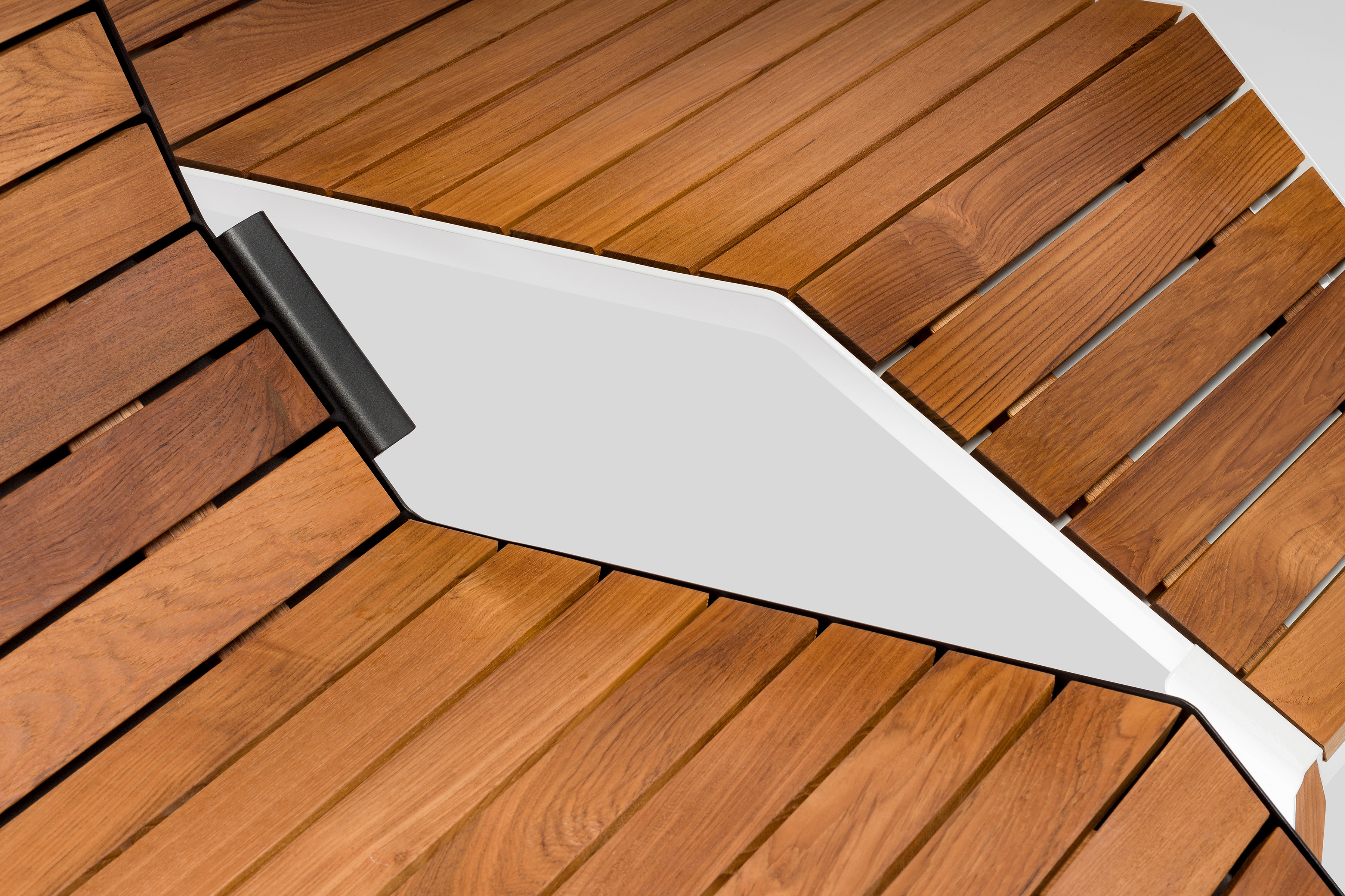The frame is fabricated in sheet aluminum and powder coated with various color options. The teak slats fit interior to the frame and can be easily removed for cleaning and maintenance. With teak finishes in natural or weathered and multiple color options for the frame, the Arms lounge chair provides flexibility to fit any outdoor environment. An optional fabric cushion provides added comfort and flexibility to create looks to match any environment.