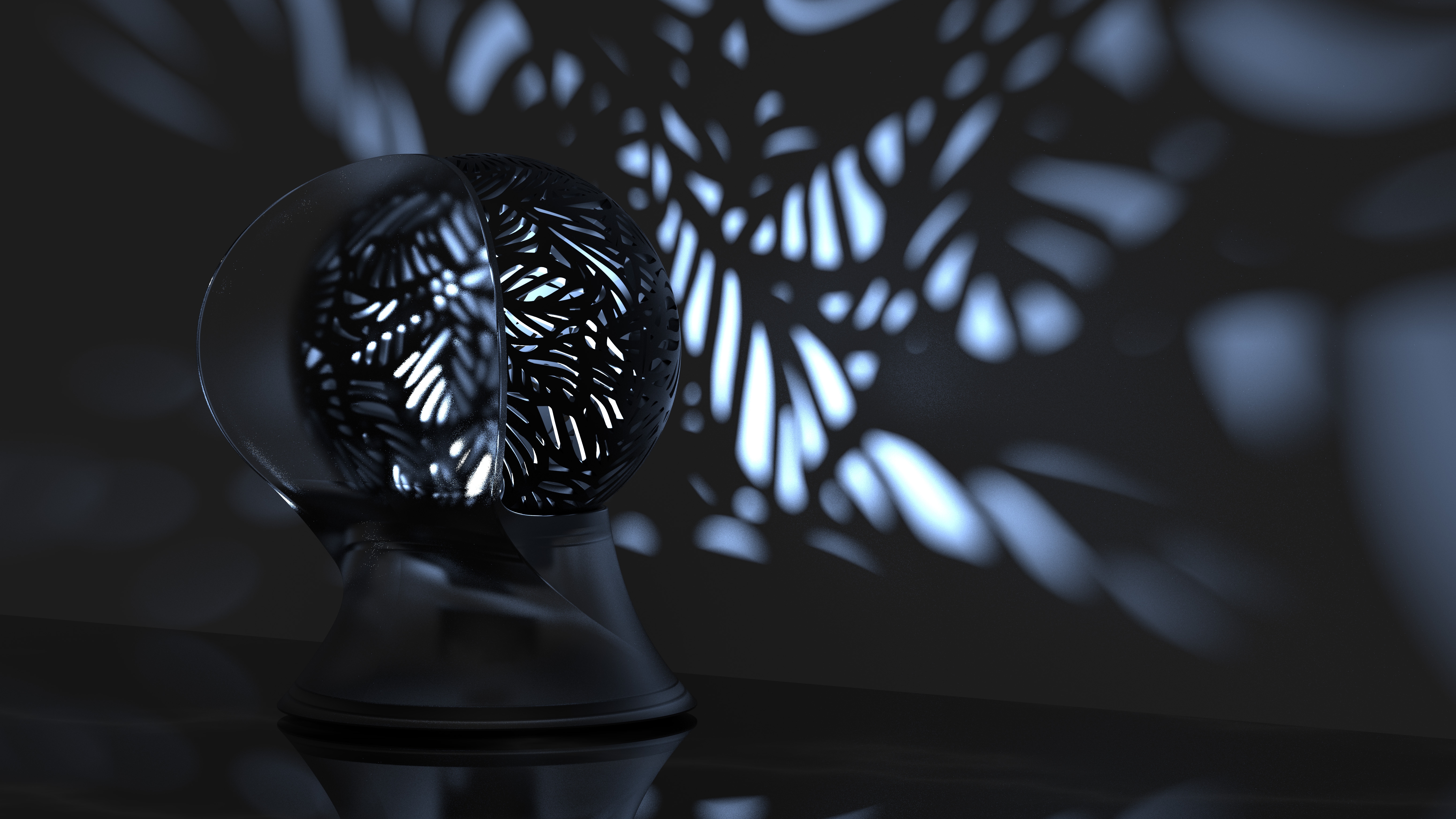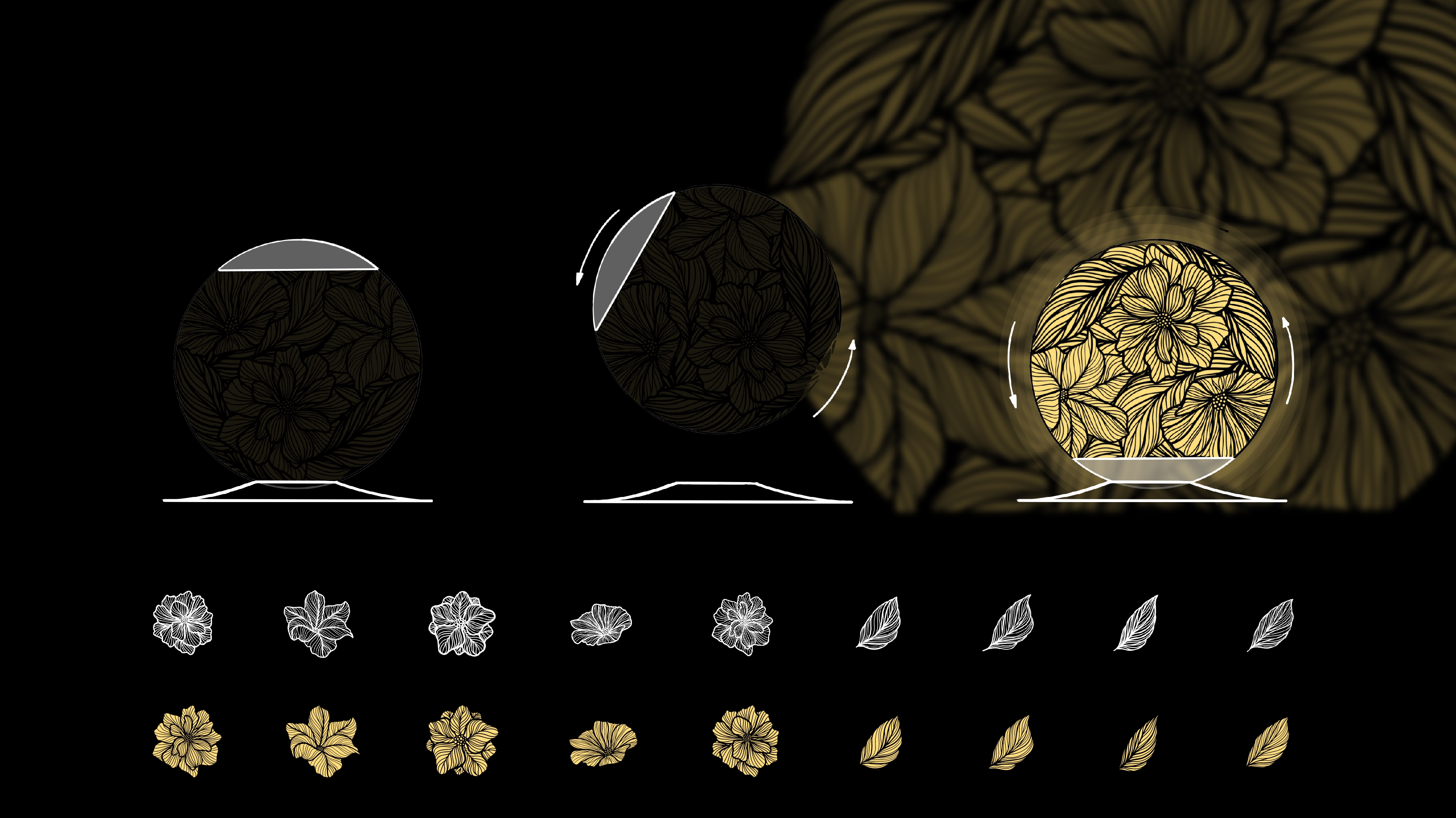Divine is a decorative table lamp whenever lit up or off. By creating the magic relationship between light and shadow, corners will be filled with elegant floral patterns. It is a portal to bring us to a new divine world.