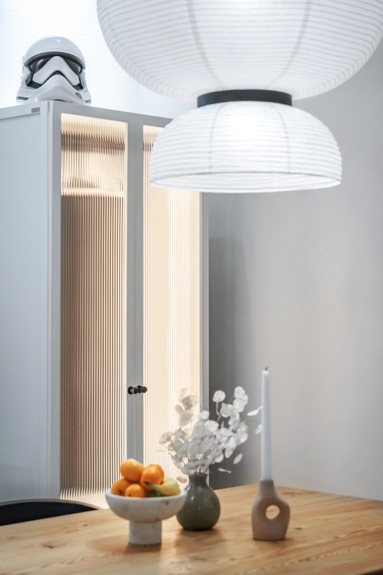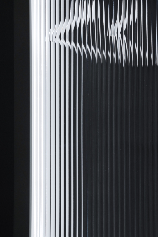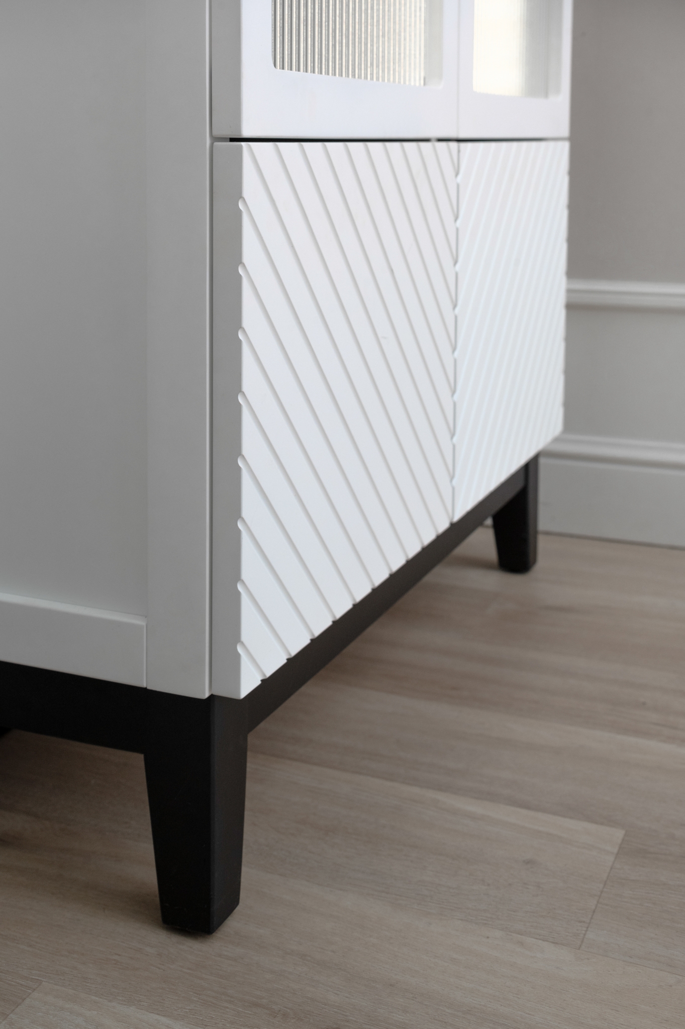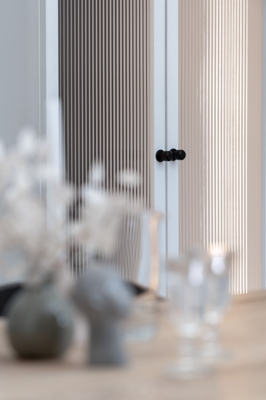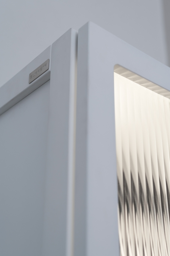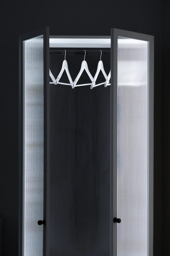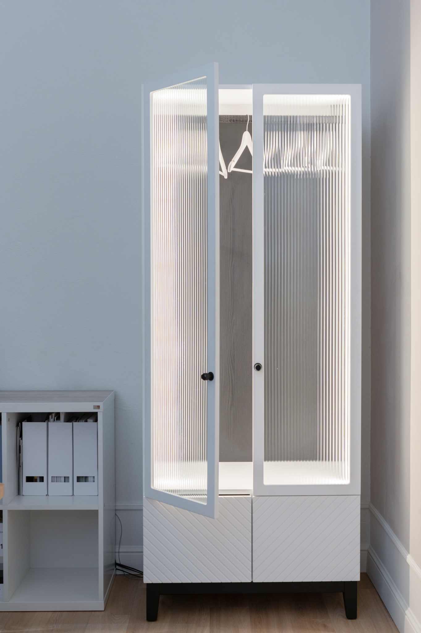 This cabinet combines minimalism and elegance of modern decorative technologies. It can become the main character in the interior or harmoniously complement it. The design is inspired by the nature of the Carpathian forests in western Ukraine. The elegance of the snowdrop is in its basis. Fluts glass and lighting inside create the effect of sunlight breaking through the ice crust. The back wall and legs are made of ebony. They resemble the wood shadow and add depth to the composition. The wardrobe is very spacious, but thanks to the design it looks very light and elegant.