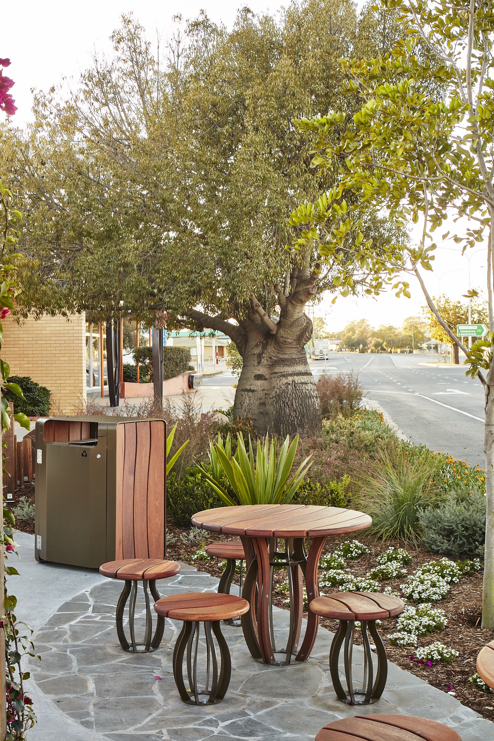 Miles is a country town in outback Queensland , Australia . It features Baobab Trees ( bottle trees ) and so these were chosen as the basis of Designed forms for the project , not withstanding the need for function. Working in collaboration with a Landscape Architect firm the Designs compliment their general vision for the site. Intricate but simple shapes were created to represent the bottle tree forms, especially apparent in waste bins and Seats.