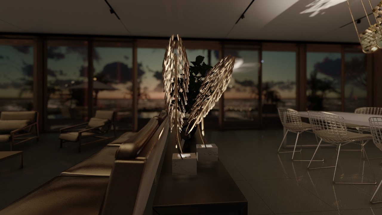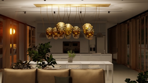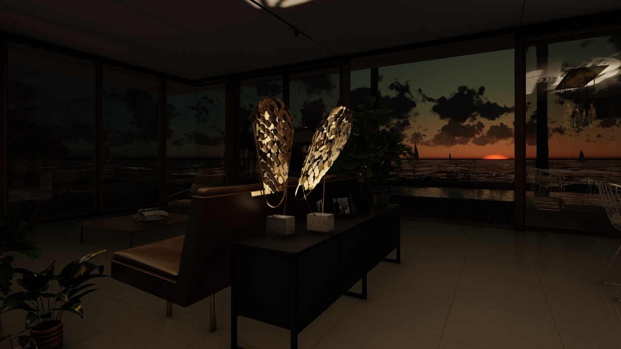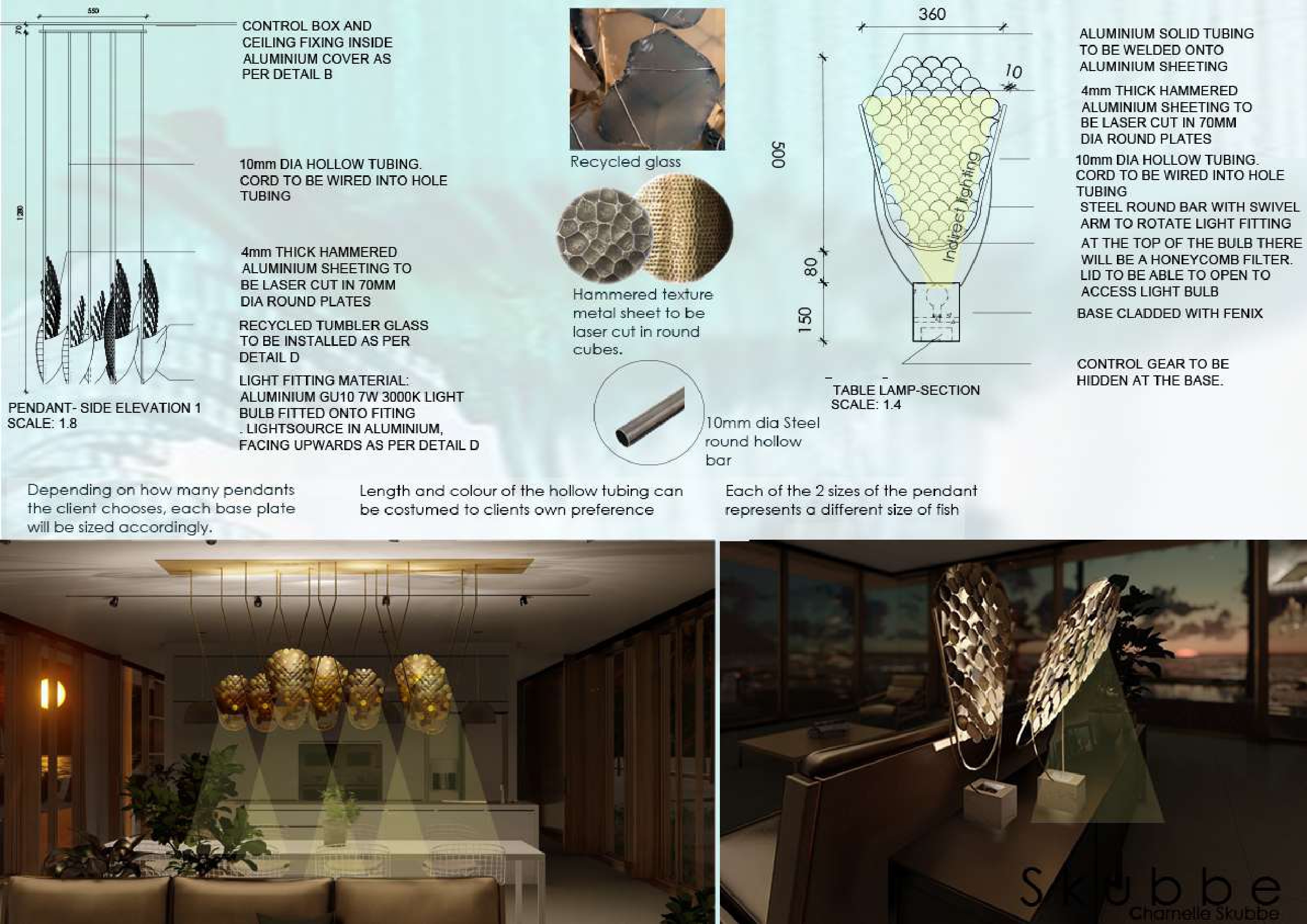 The luminaire is suitable for any contemporary residential interior. I have chosen the material to represent the sea and metal fish skin is a representation of the fish swimming in the water.