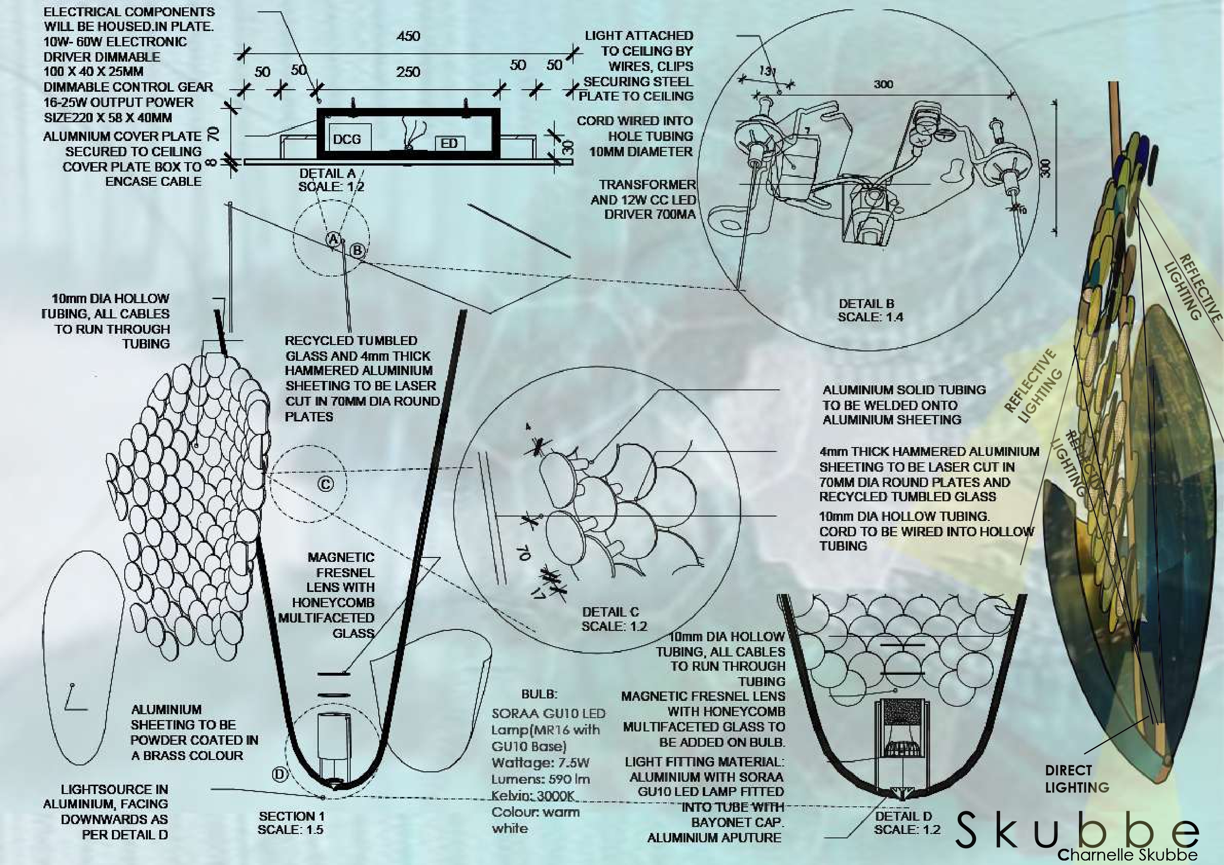 II have chosen recycled glass as a material to represent the sea and metal sheeting for the fish scales, My luminare is a representation of the fish swimming in the water. In my design, I used metals of various sizes and colours to represent different types and sizes of fish. The gold/brass lining in the fish's eyes led me to choose a brass-colored design