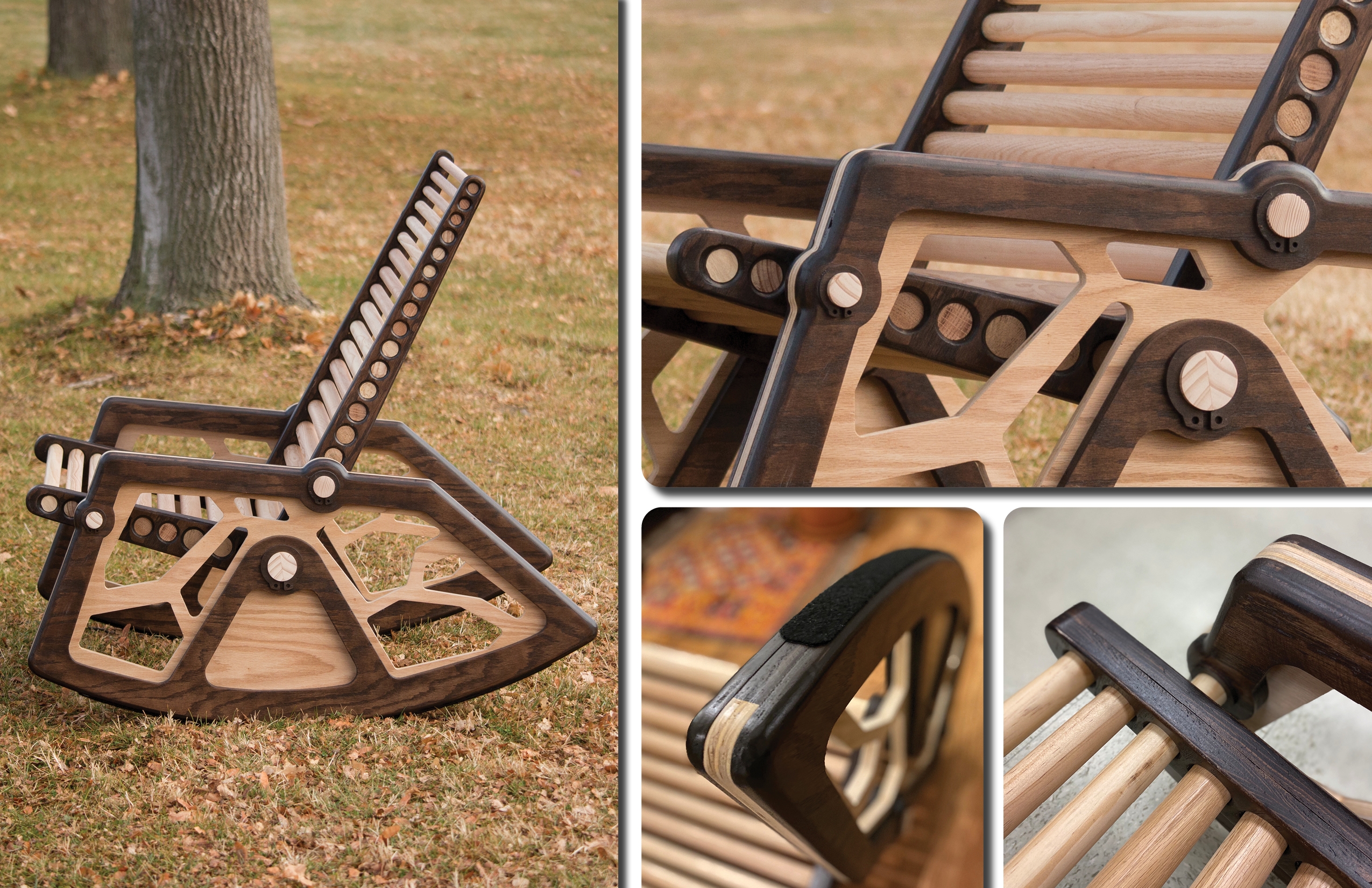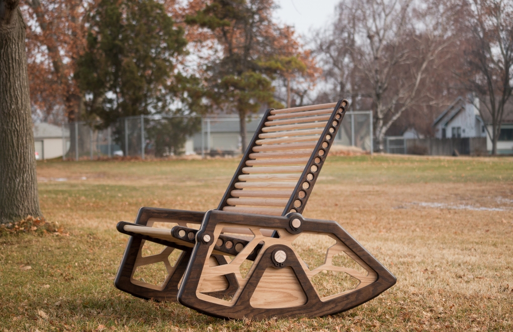 Designed and built during a CNC furniture class. The Swiss rocker is made from red oak dowels that vary in size from 2" diameter down to 0.75". The rocker rails are cut from high-quality red oak plywood.