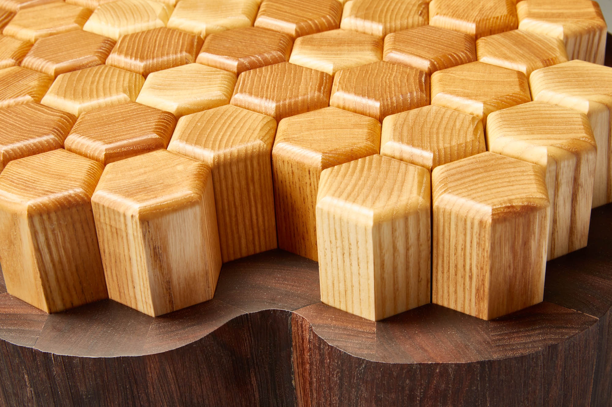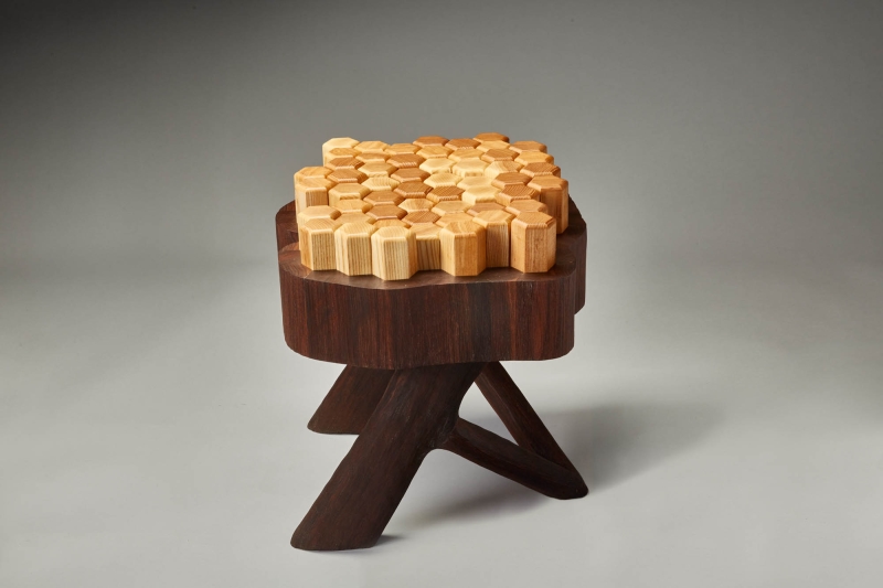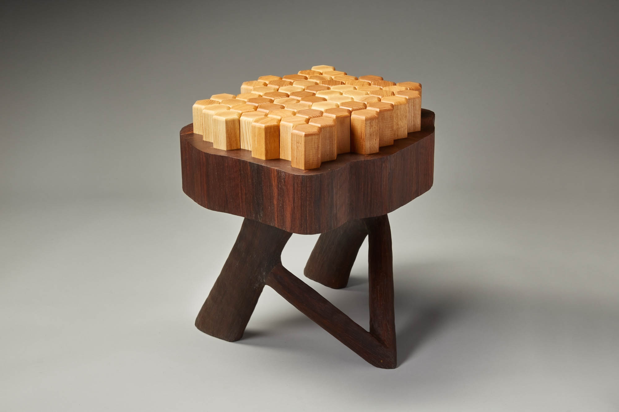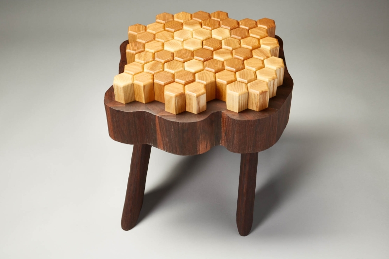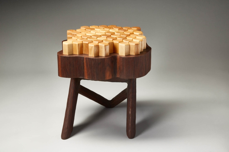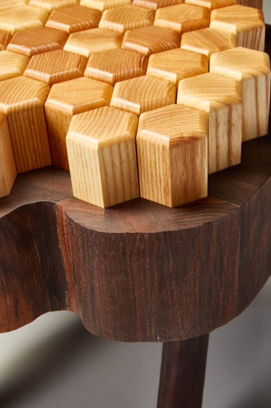 Stump 2.0 is a reimagined version of the all purpose tree stump. The interlocking hexagon white ash pegs rest on memory foam that provides a soft seat or footrest while still being sturdy enough to support a beverage or laptop. The walnut base and legs are textured to resemble the touch of bark.
