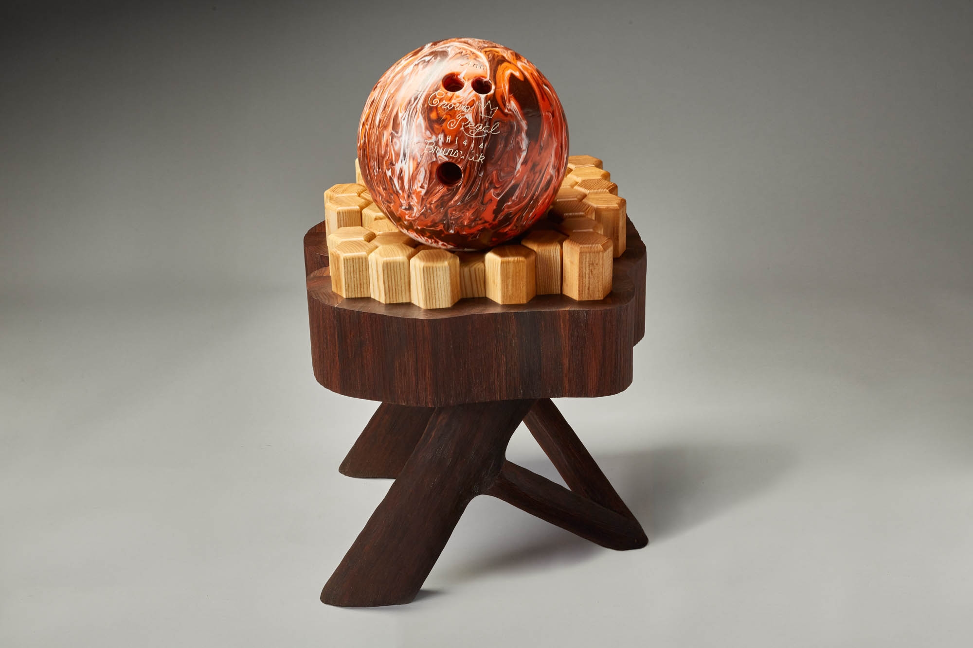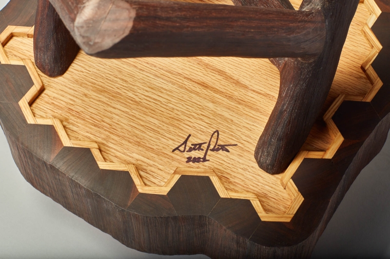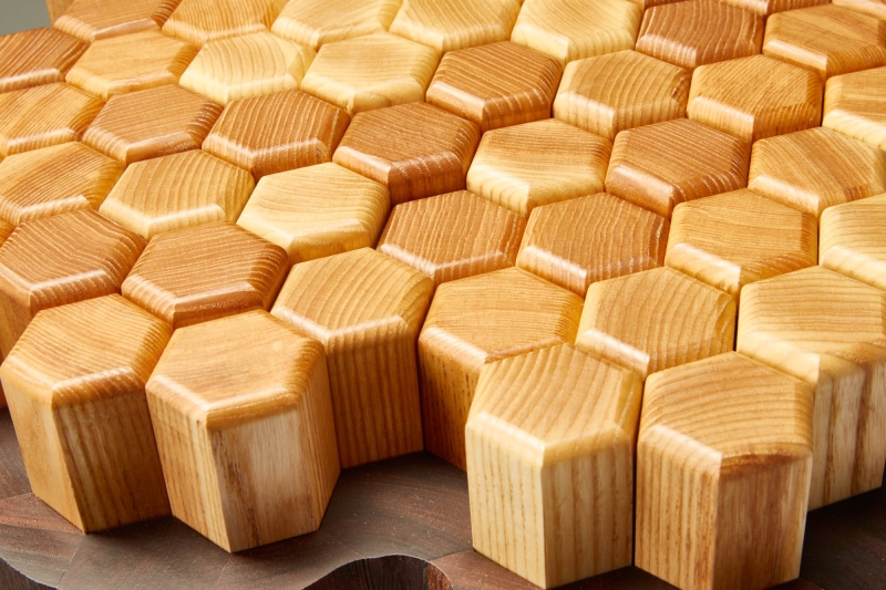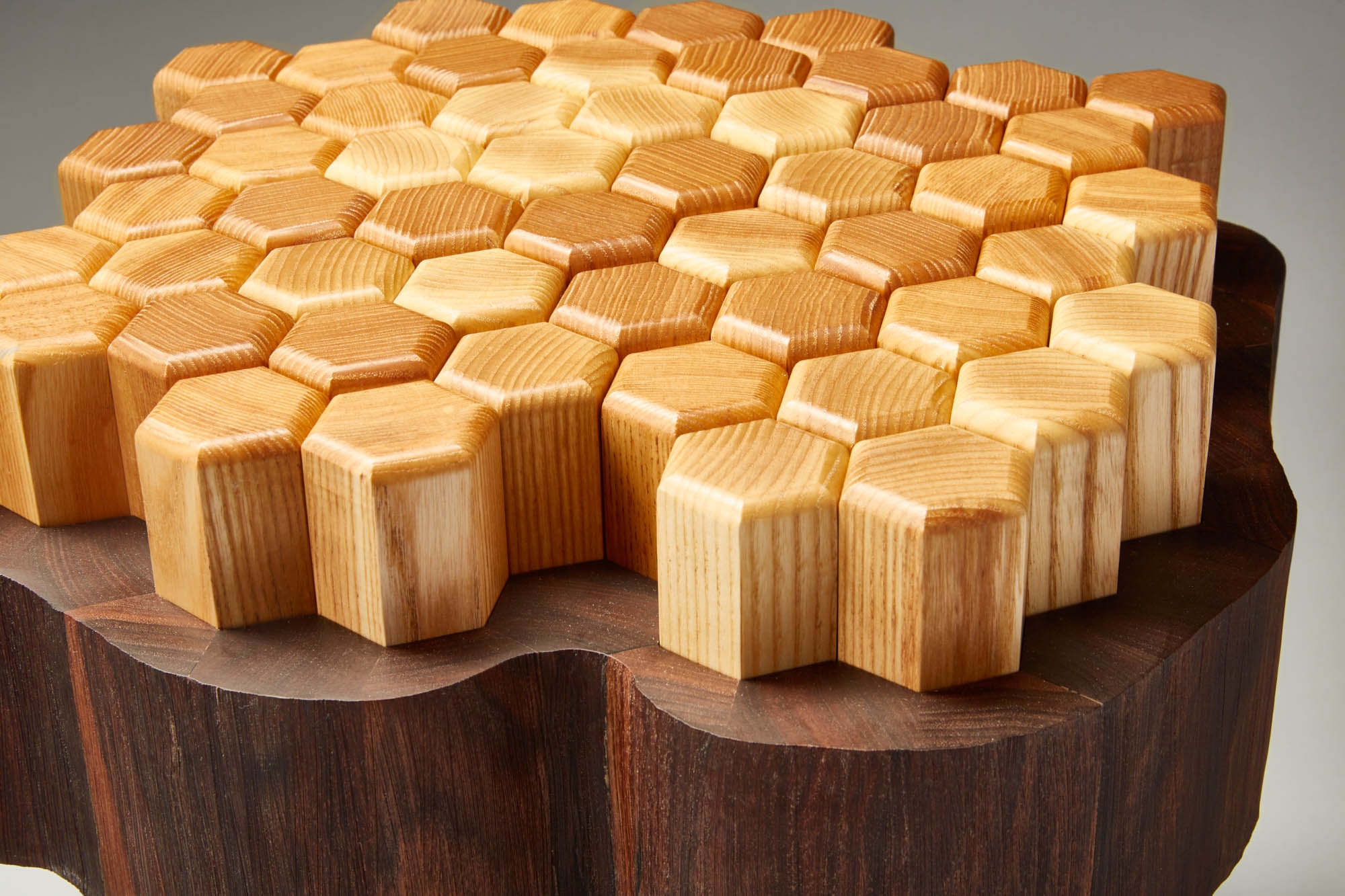 Stump 2.0 is a reimagined version of the all purpose tree stump. The interlocking hexagon white ash pegs rest on memory foam that provides a soft seat or footrest while still being sturdy enough to support a beverage or laptop. The walnut base and legs are textured to resemble the touch of bark.