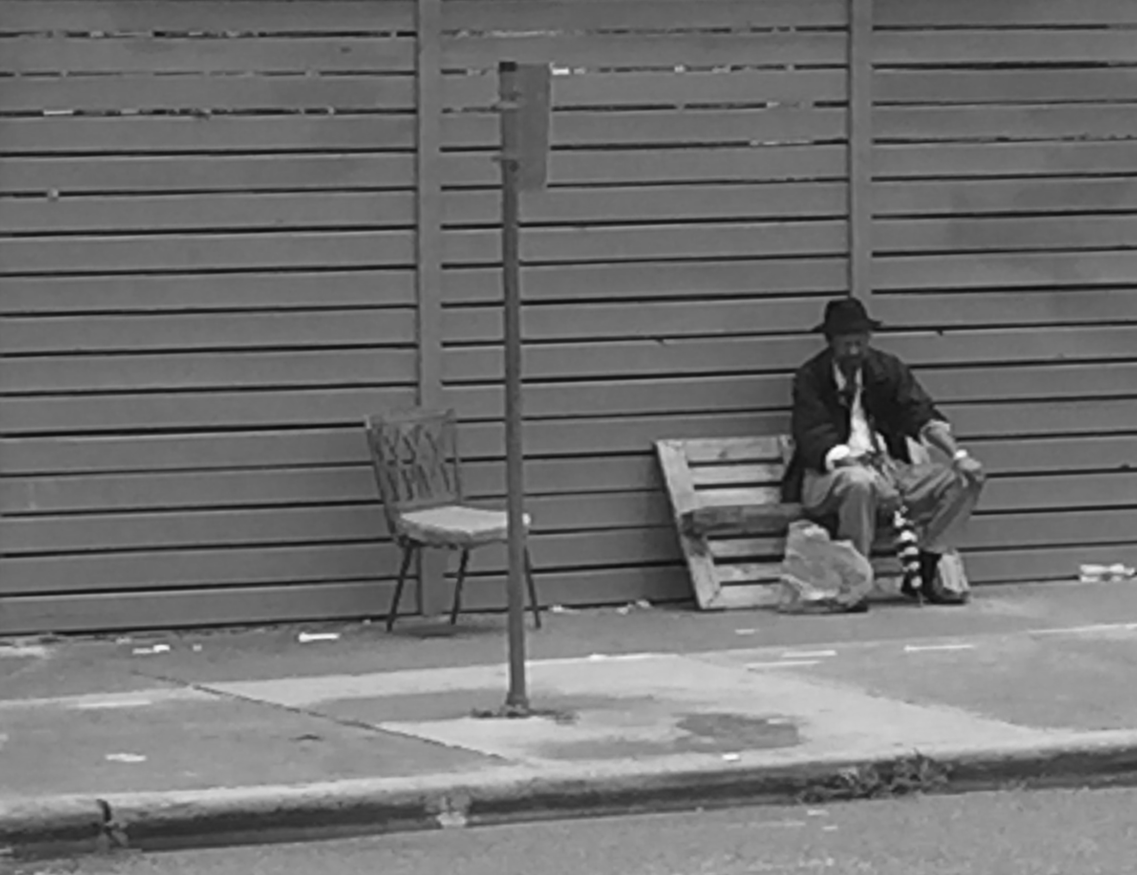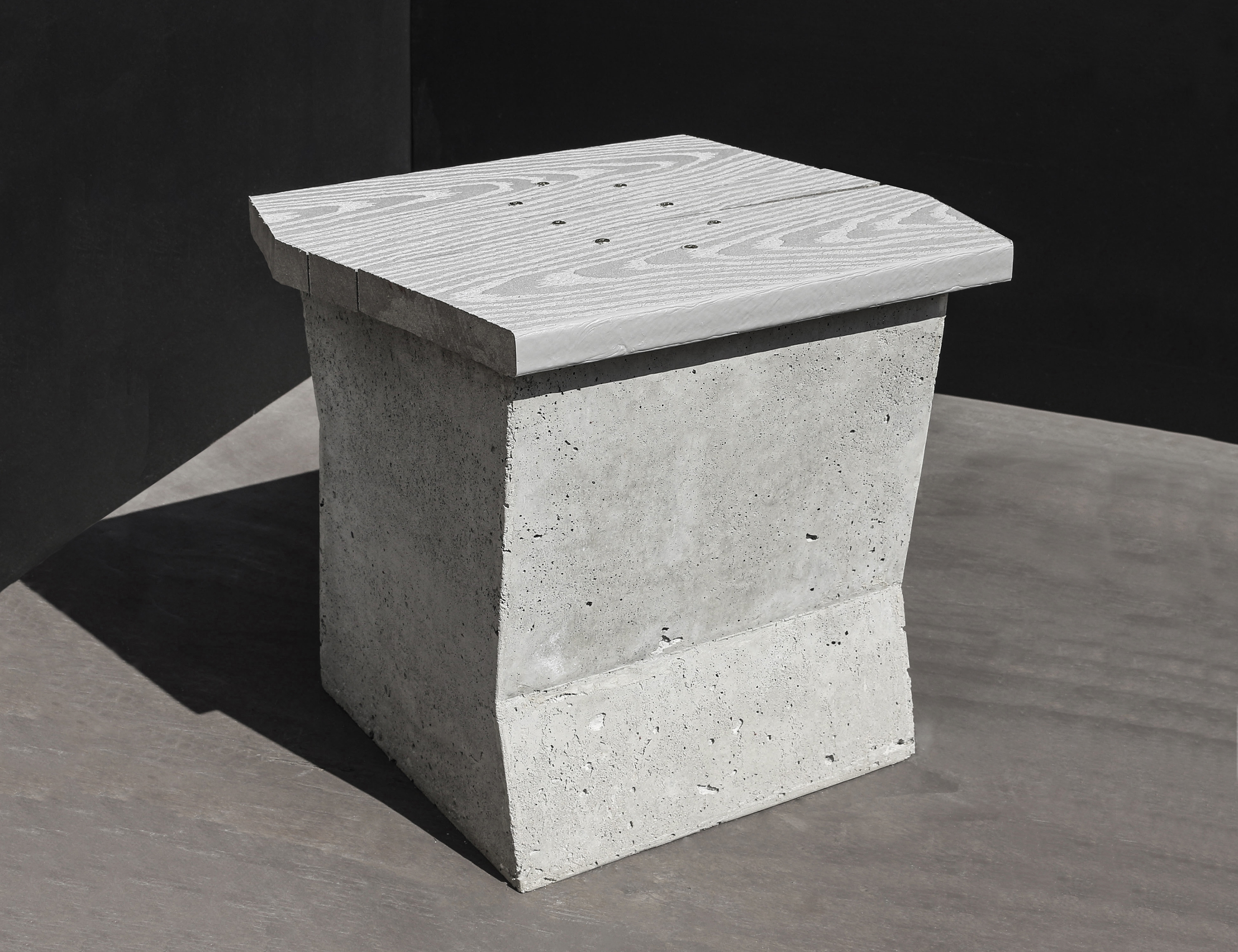 The concept and design of this stool originated from months of observing people using the public bus stop across the street from our studio. We noticed the use of found objects to accommodate the need to sit and wait for the next bus to arrive in as comfortable a position as possible, often for extended periods of time. The choice of seating, most often, was wooden pallets, but also included discarded mattresses, three-legged chairs, or milk crates.