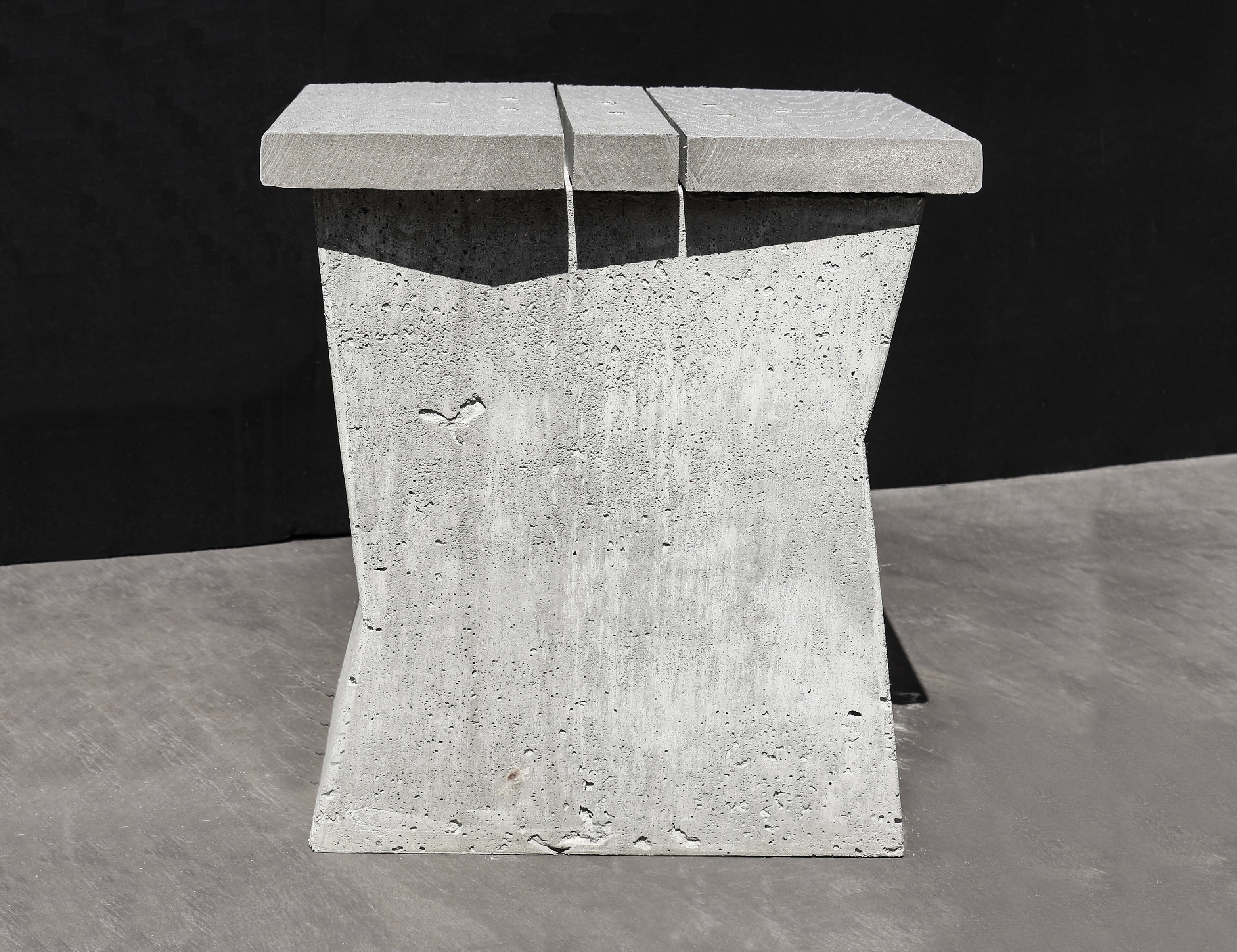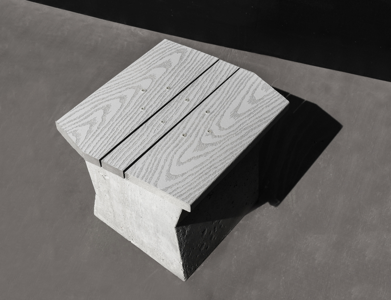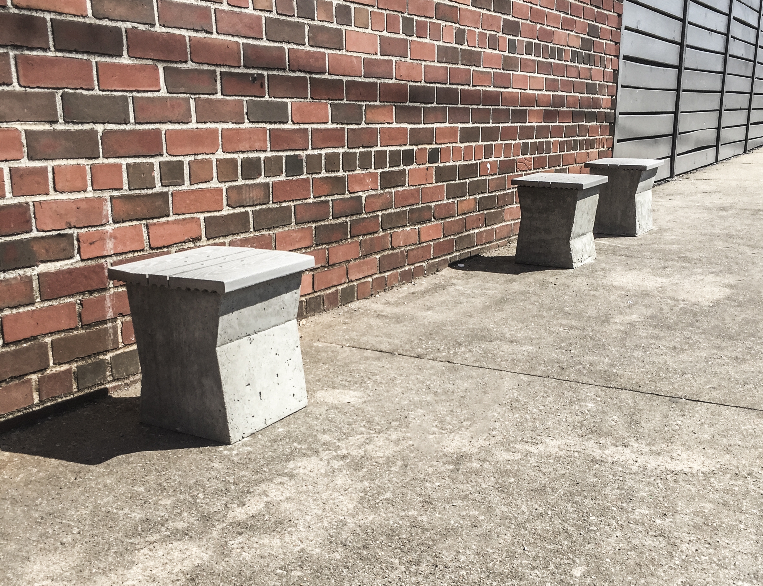 Exploring durable materials that would hold up over time, would not collect heat on a hot summer’s day, and would deter thievery, composite decking was chosen for the seat and formed concrete for the base. Concrete met the requirements of durability and created a substantial mass (120 pounds / 54 kilograms) that would dissuade someone from moving them away from their intended purpose and location.