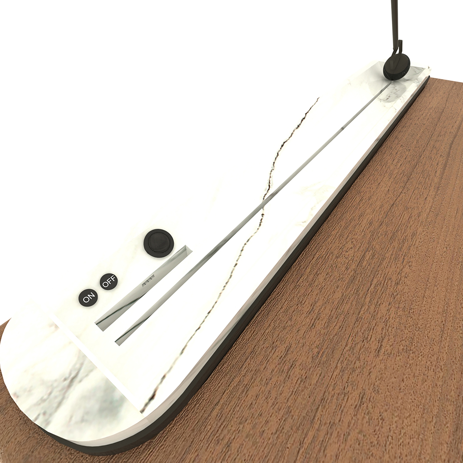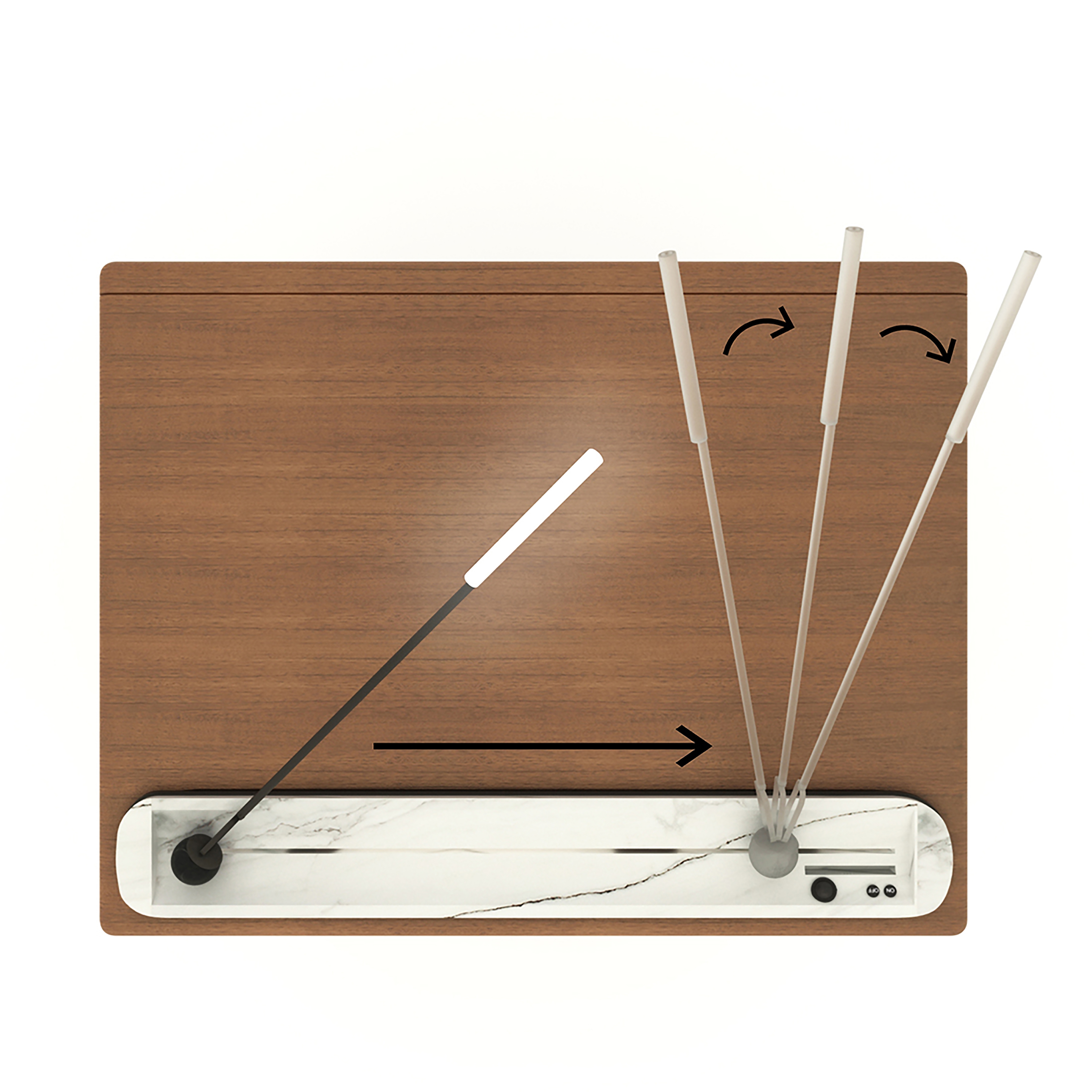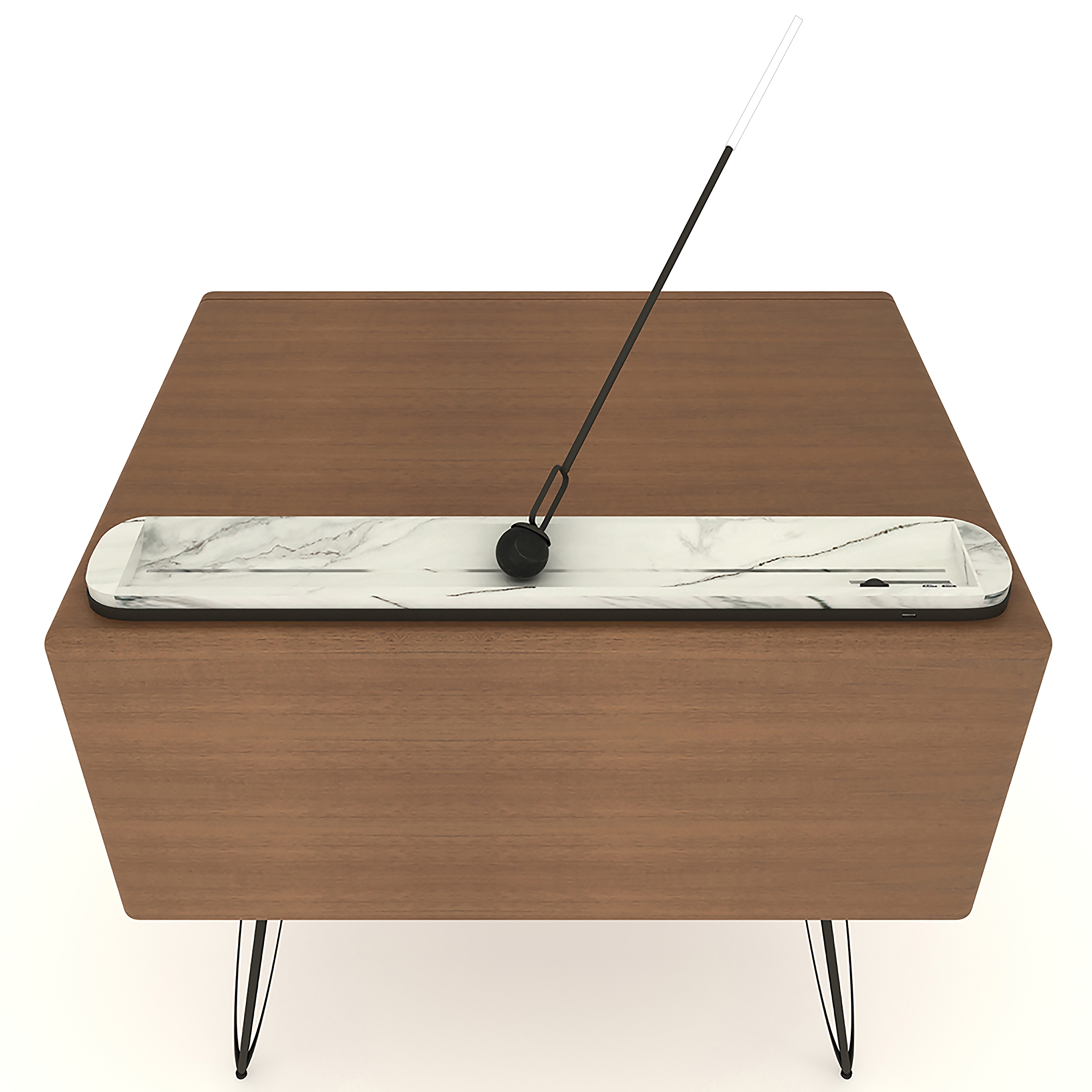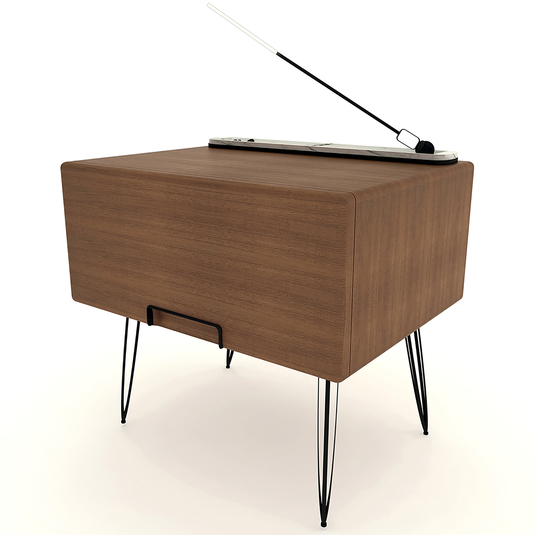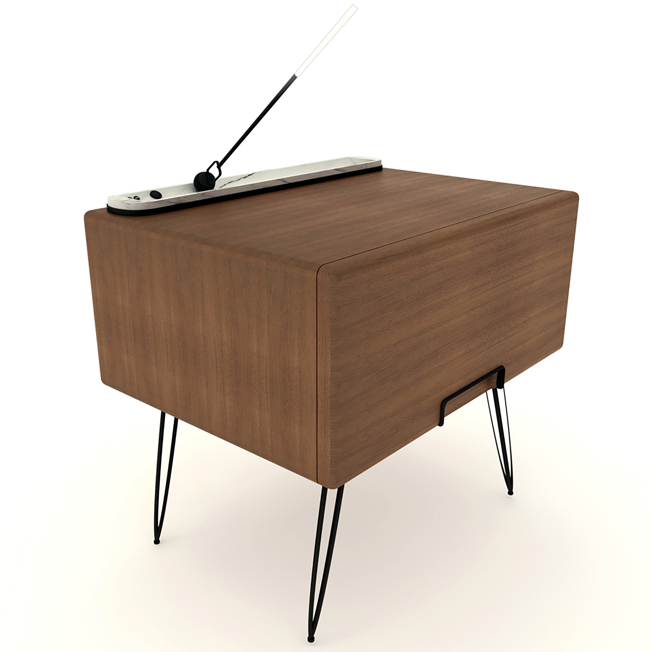 While R-dio was designed, it was inspired by the radios used 20-30 years ago. It is a retro-style design that is gaining popularity again today. In particular, a reference was made to the radio with its soft lines and an antenna-like lighting fixture. Apart from all these, it has a compact structure and offers the user more space to use next to the bed, as it has a phone holder on a plate, a sound system, and an elegant lighting element. The massive body is painted with wood oil (wax oil). Handle recess was obtained by carving wood, It was carried out to take the mold in one piece. On the top surface of the bedside table, a marble plate is carved from a single piece and there is a channel in the middle of it. The material of the lighting fixture (with white plexiglass lighting cap) and legs is black textured colored metal. It has a channel inside the marble plate on the top of the nightstand that allows the lighting fixture to move left and right and rotate 360 degrees. However, if the lighting fixture is far from the bed, the keys to turning the lighting on and off, the phone socket, and the speaker that works with Bluetooth are located on the left side of the marble plate.