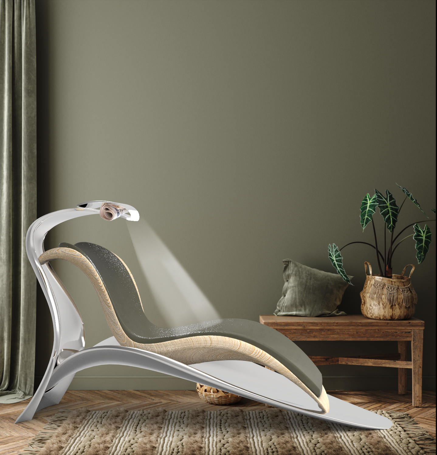 The "Lazy Cat Lounge Chair" is a comfortable, casual chair. The overall shape of this chair resembles a lazy cat with its tail stretched up. The chair is equipped with an LED light, which can provide lighting for reading. And you can put books and newspapers on the "cat's tail".