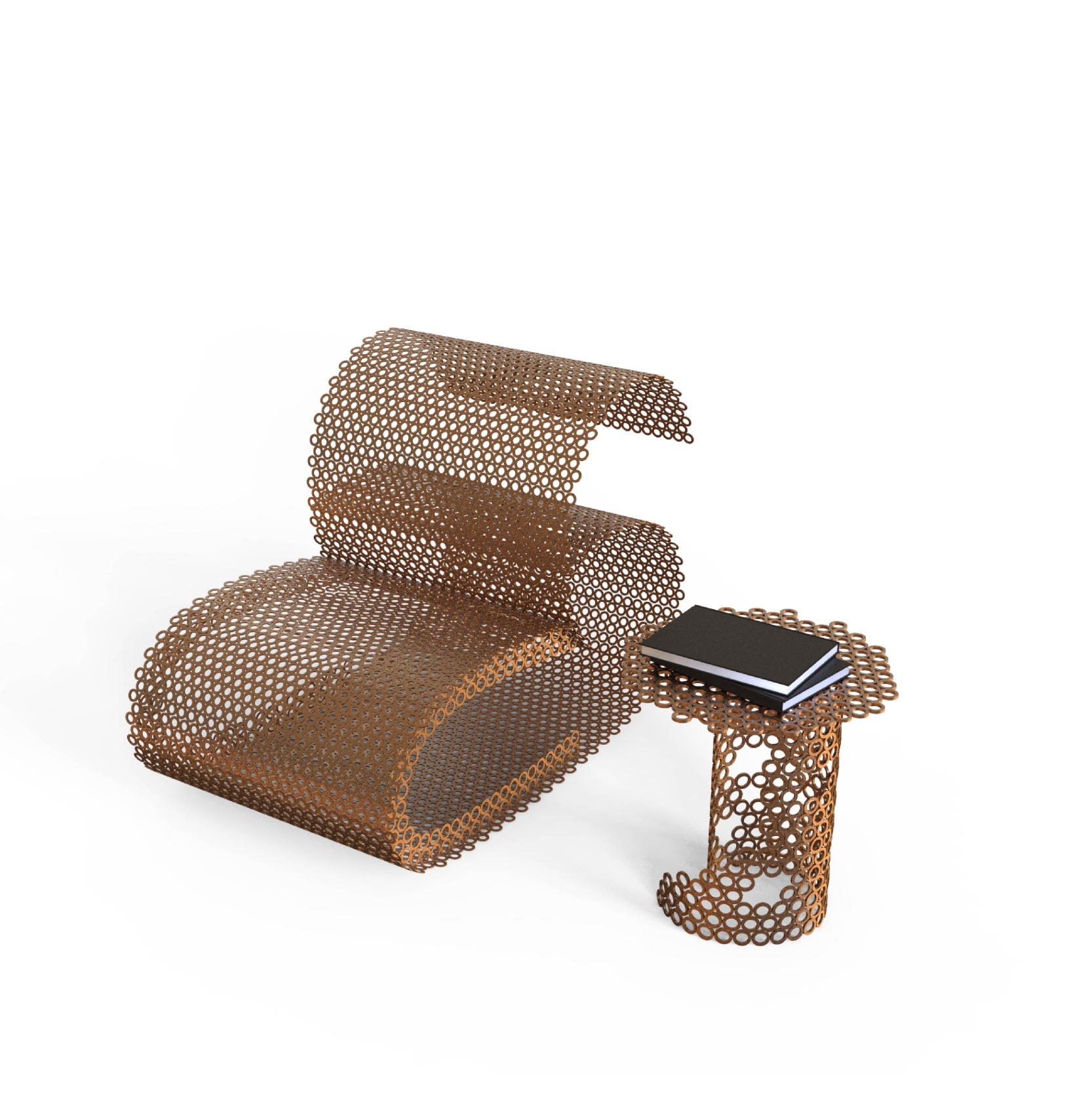 Curvy is a garden furniture set made entirely of corten metal.