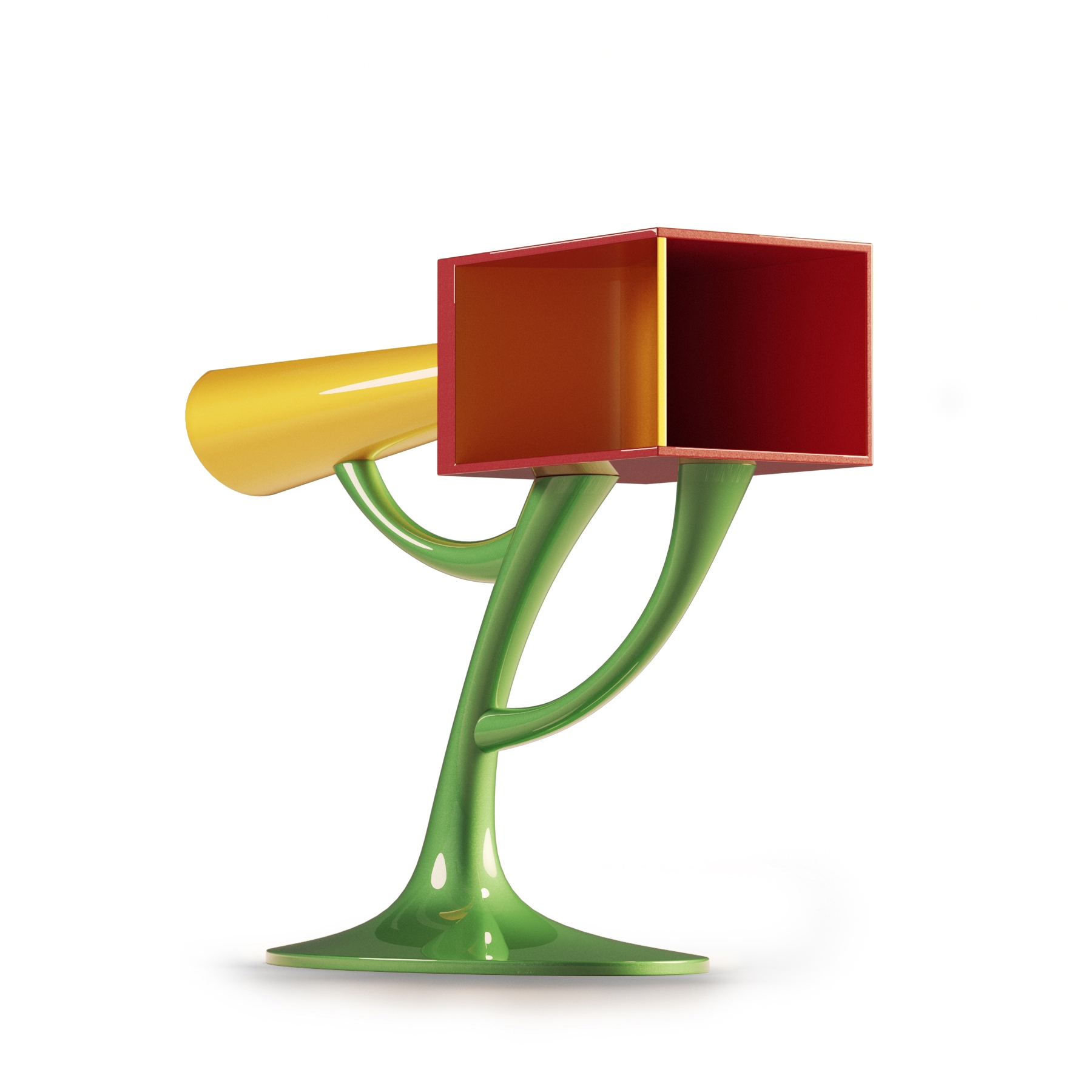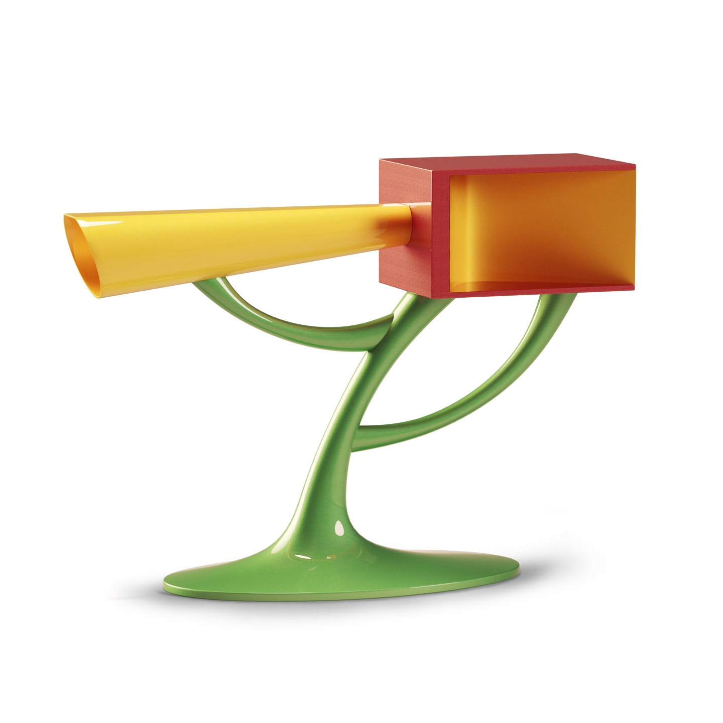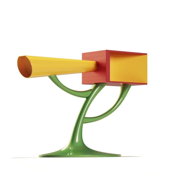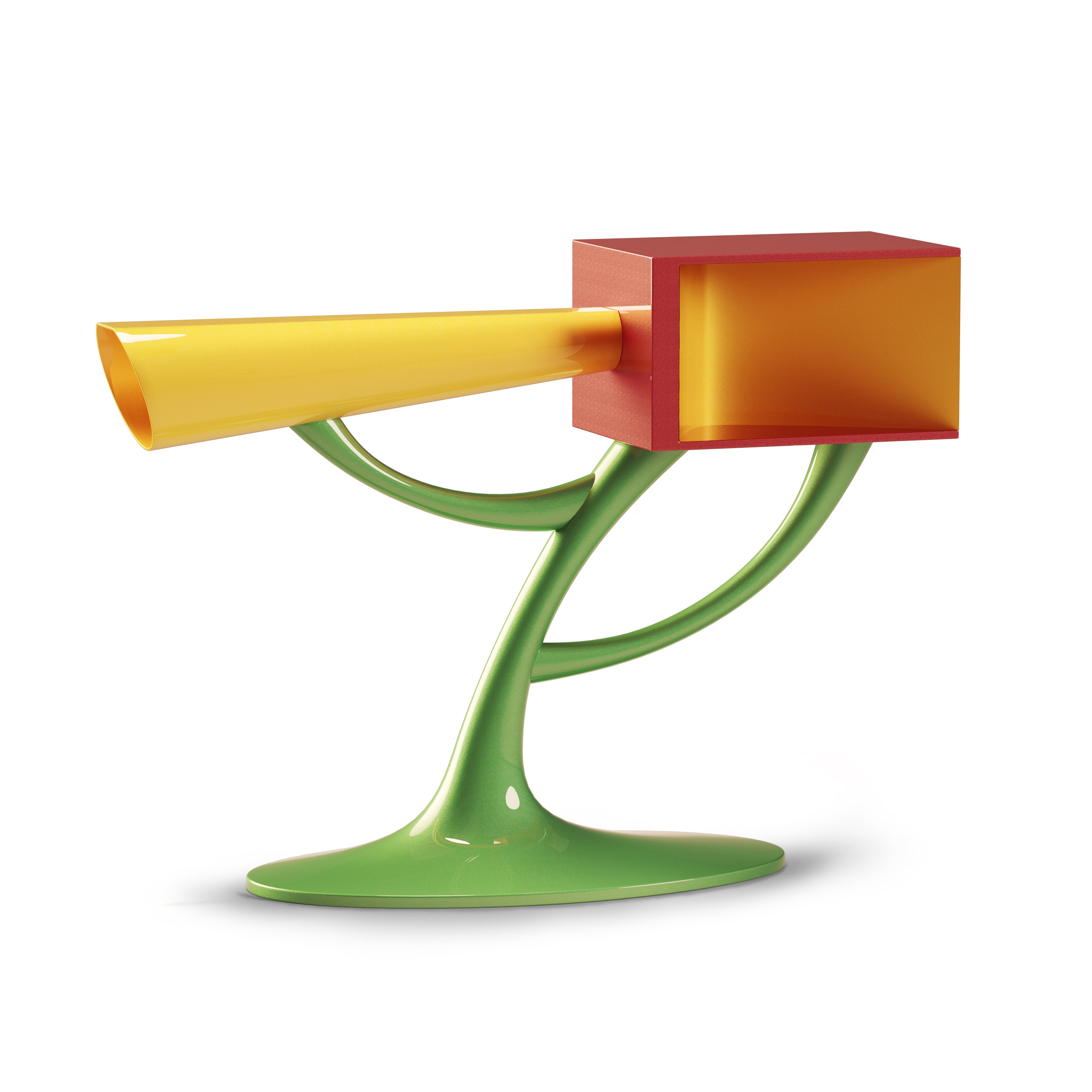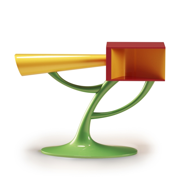 This artwork was specifically designed to function as an entrance table, providing both beauty and practicality to any space it occupies. The artistic form is an explosion of unique and intricate forms and shapes, deliberately crafted to generate feelings of joy and serendipity in the spectator. This, in turn, creates a positive and uplifting energy that is felt throughout the room.The materials used in the construction of the piece are both durable and visually appealing. The combination of fiberglass, metal, and wood creates a sturdy and unique aesthetic that is sure to impress. The fiberglass provides lightweight yet durable surface that is easy to clean and maintain, while the metal internal structure ensures that the piece remains secure and stable. The interplay of forms and textures in the design is what truly sets this piece apart. The shapes and forms are arranged in such a way as to create a sense of movement and flow, drawing the eye and creating a dynamic visual experience. The use of color and texture further enhances the aesthetic, adding depth and interest to the piece.