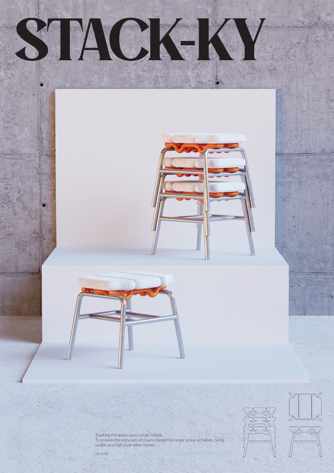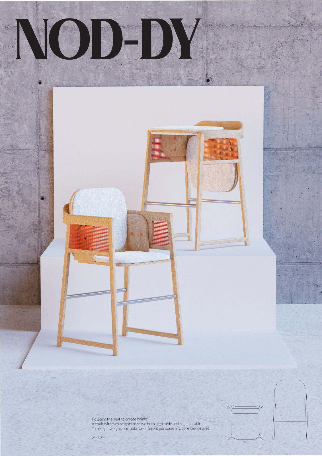 To encourage people to use a public space of Core Z in PolyU, Double-Deng is a project to create a diverse type of chairs to align with the tables in different heights and to cater the different users' needs.