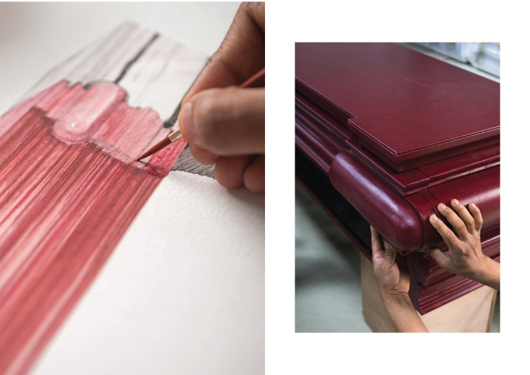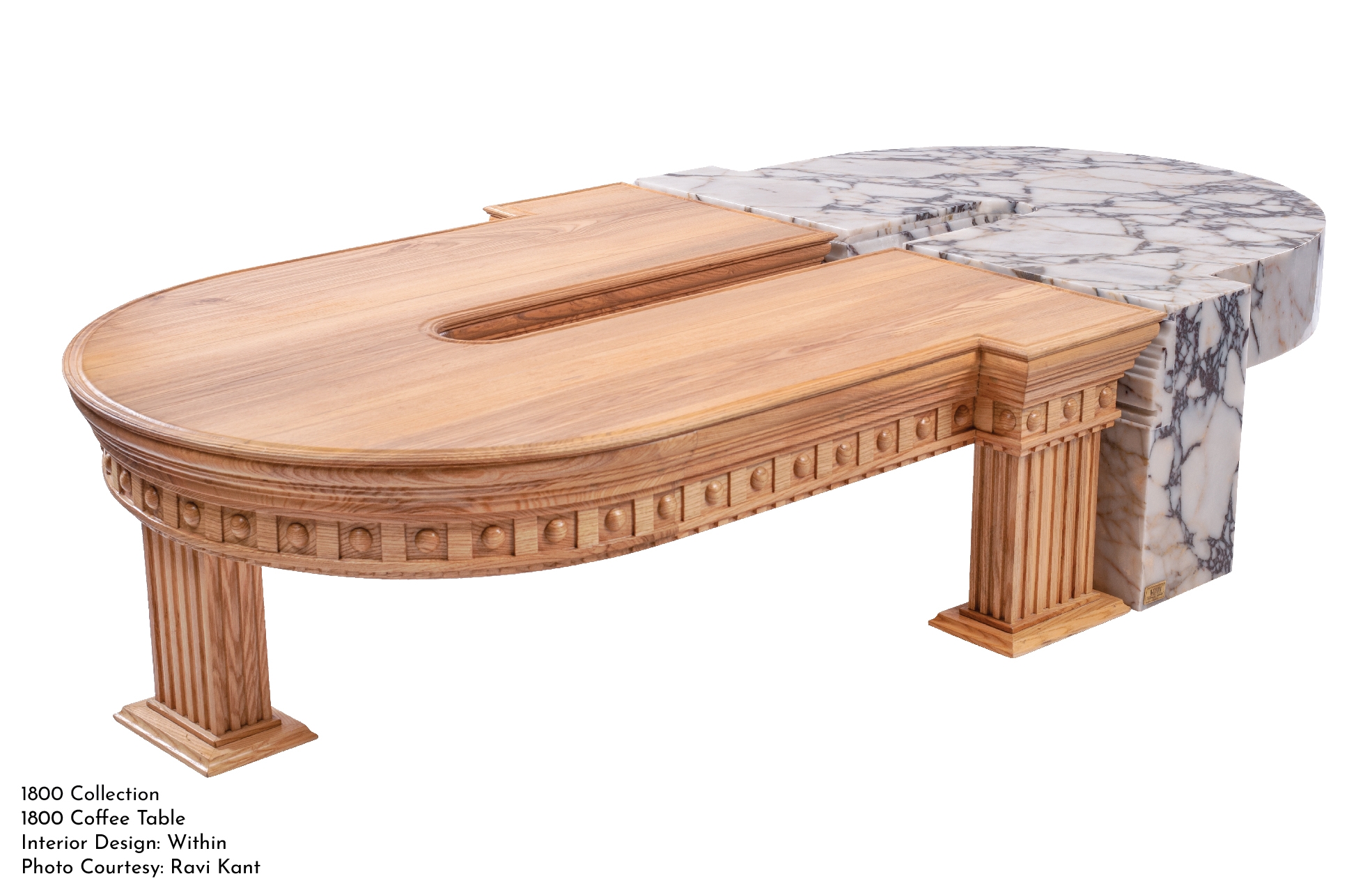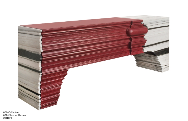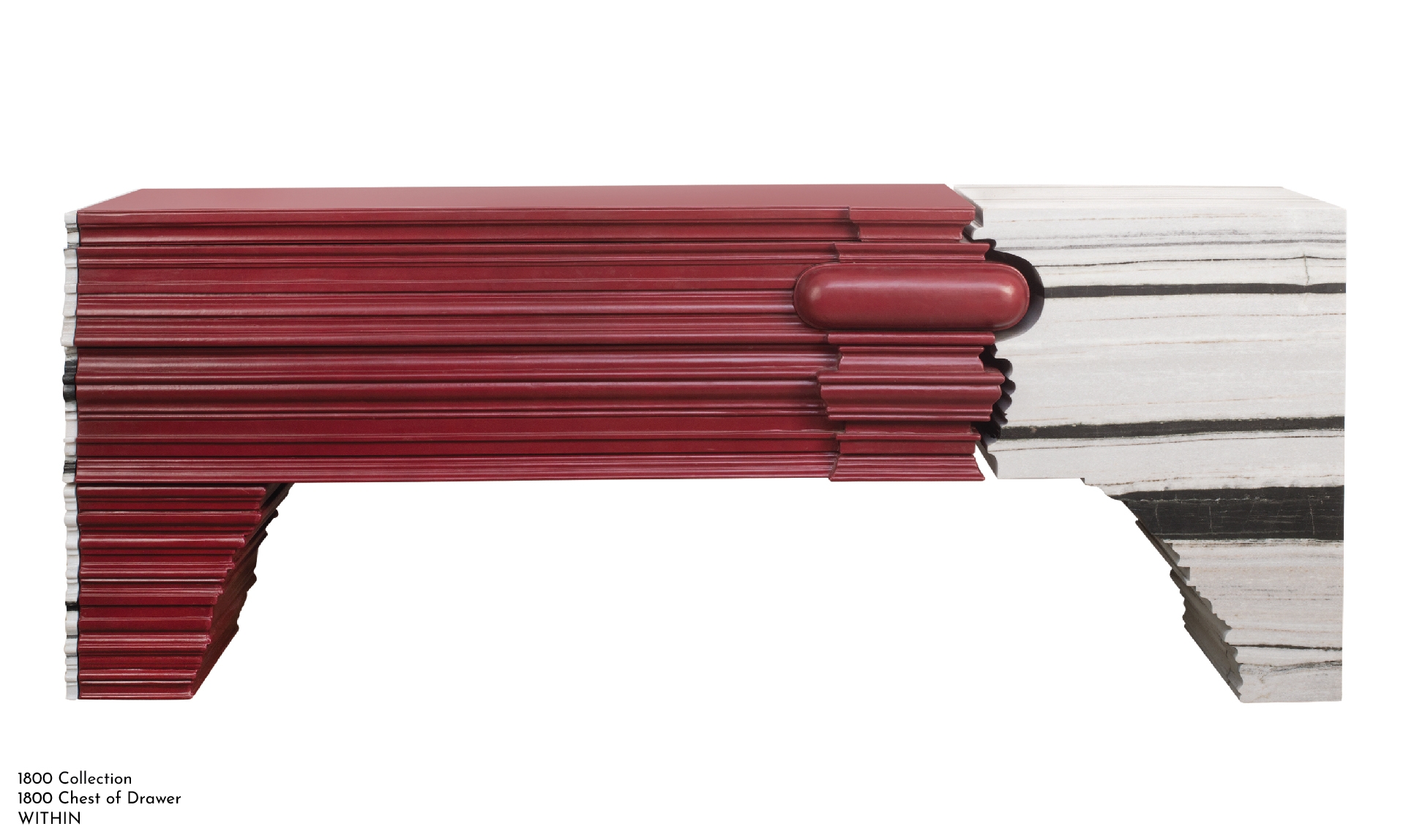 The story of the ‘1800’ chest of drawers goes back to the revolutionary eighteenth century - a stalwart shift from the revival era to the modern movement. Depicted by the juxtaposition of the old and the new language in design, craft and materiality, this masterpiece demonstrates the harmony between the two. The traditional renaissance moldings, handcrafted in wood and enveloped in red Italian leather transition gracefully into the free-flowing lines of Panda white marble, bringing to life the essence of 1800. There is immense beauty in the details of the carvings in wood, which also extend as concealed handles for drawers. The white Panda stone is also crafted thoroughly to bring about the same precision in the carvings as that in wood. With interior lined in white ash veneer dyed black, the drawers in leather provide function to the sculptural form. This collection also has a coffee table.