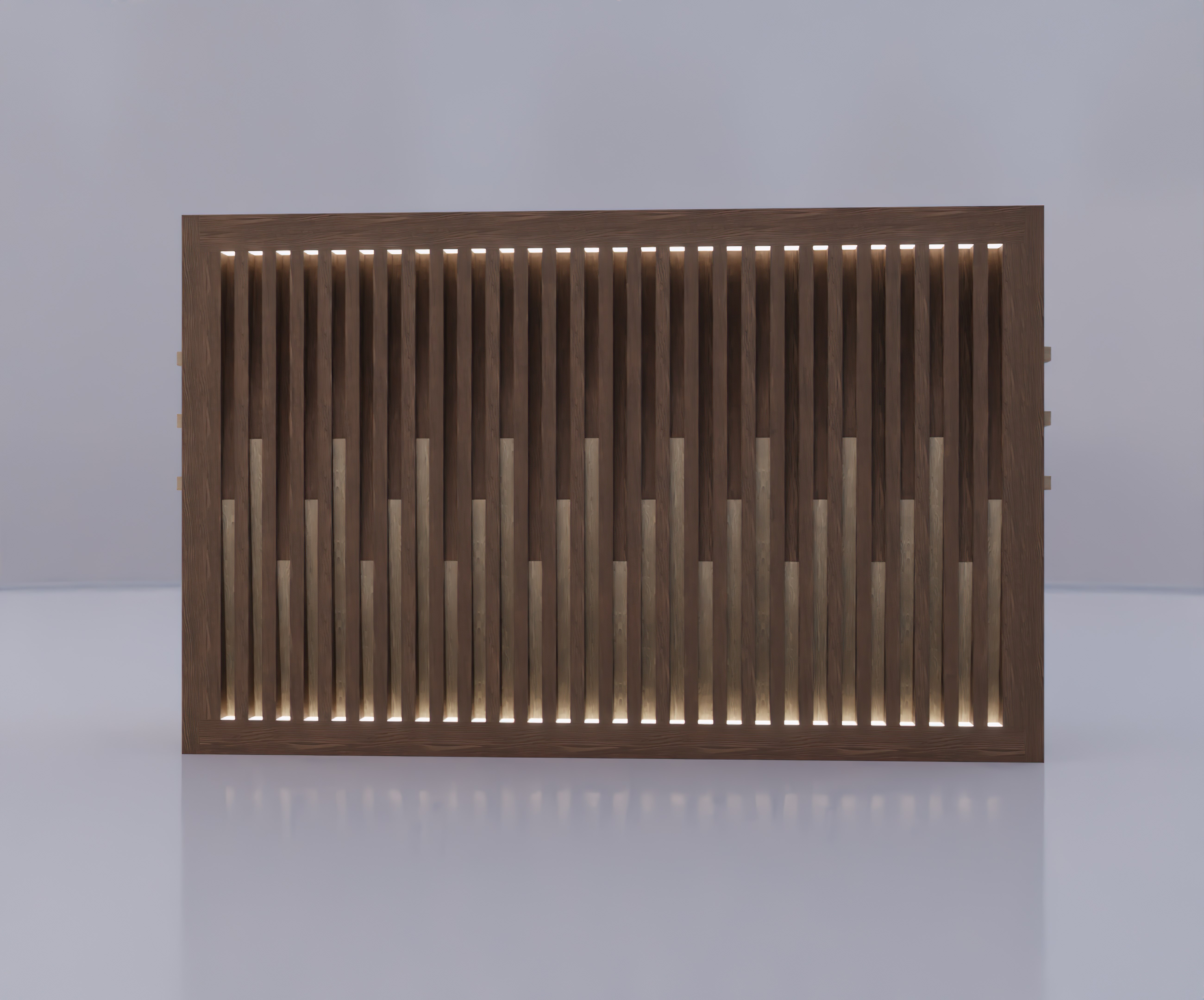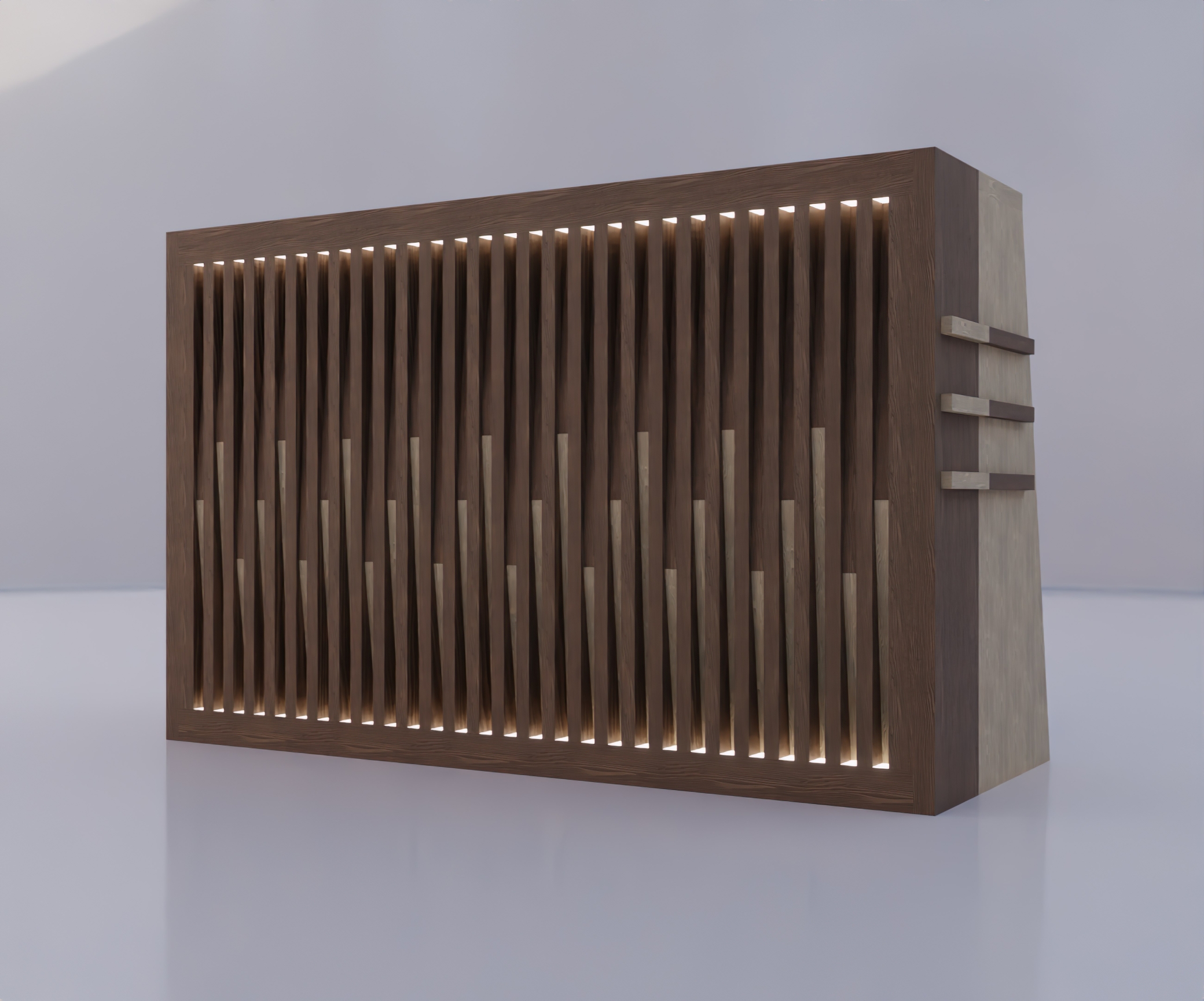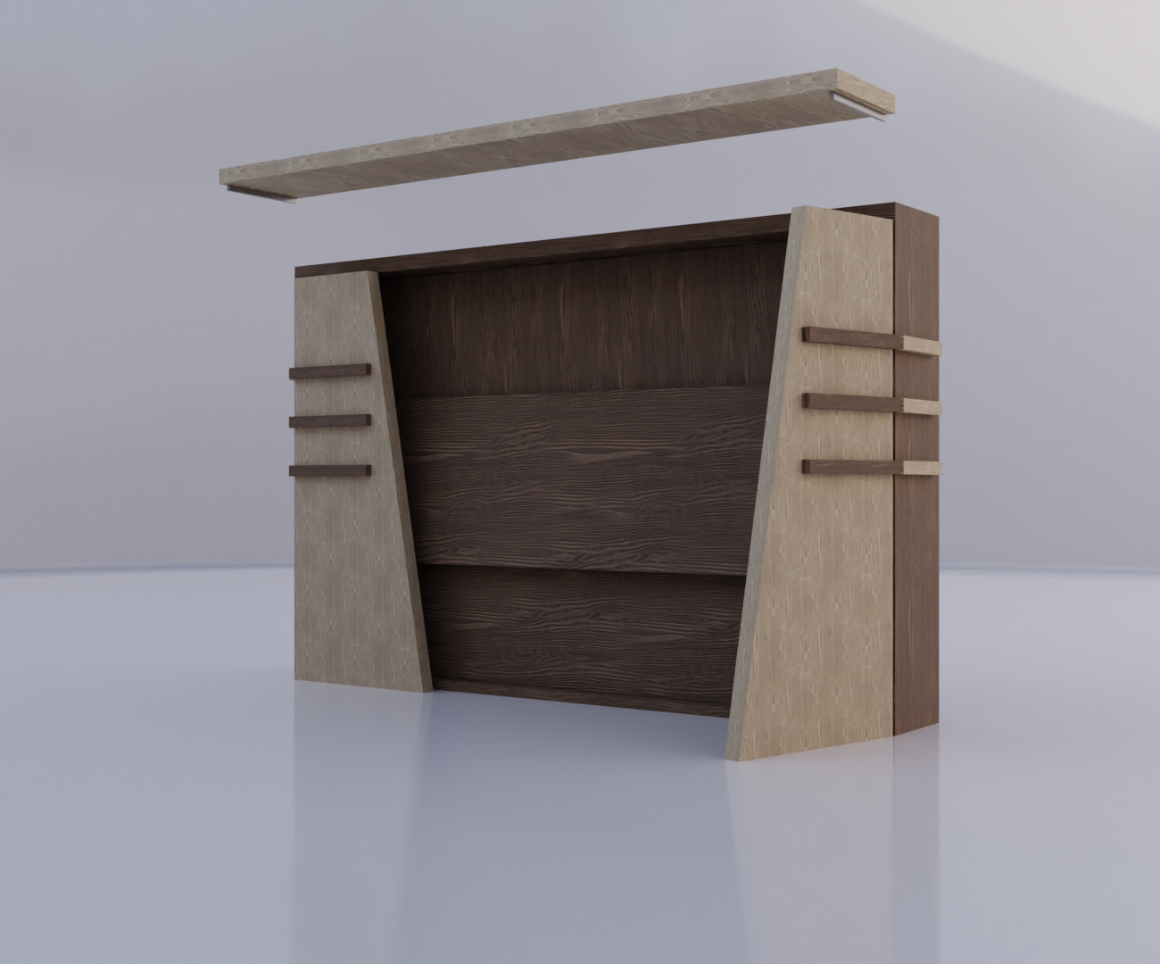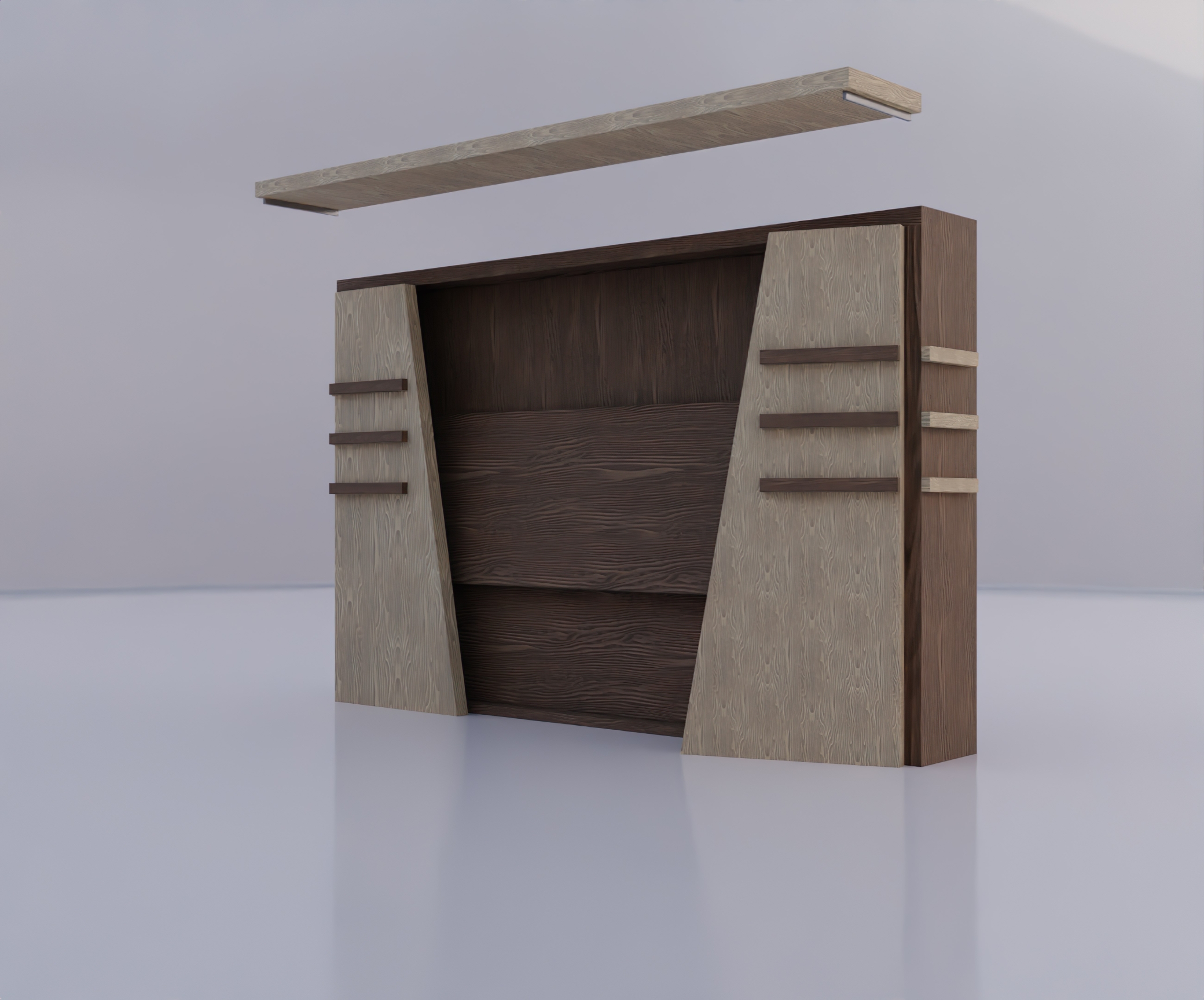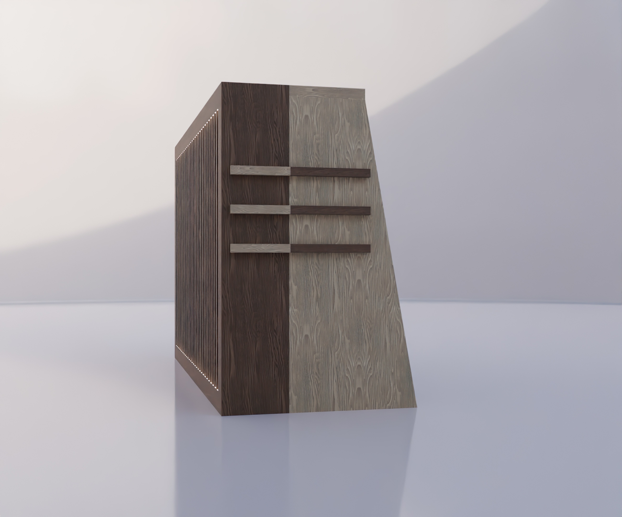 City Lights is a foldable portable bar measuring 182 cm in width, 116 cm in height, and 72 cm in depth. Crafted with the finest materials, it showcases a combination of Brazil Oak and Washed Oak, resulting in a stunning and durable construction. The front panel of this exquisite bar is elegantly adorned with intricate geometric wood inlays, artfully simulating a stylized city skyline. This unique design element adds a touch of sophistication and visual appeal.