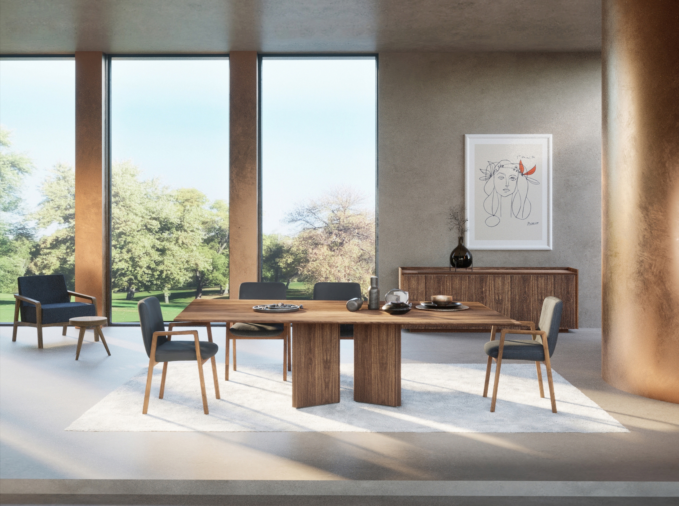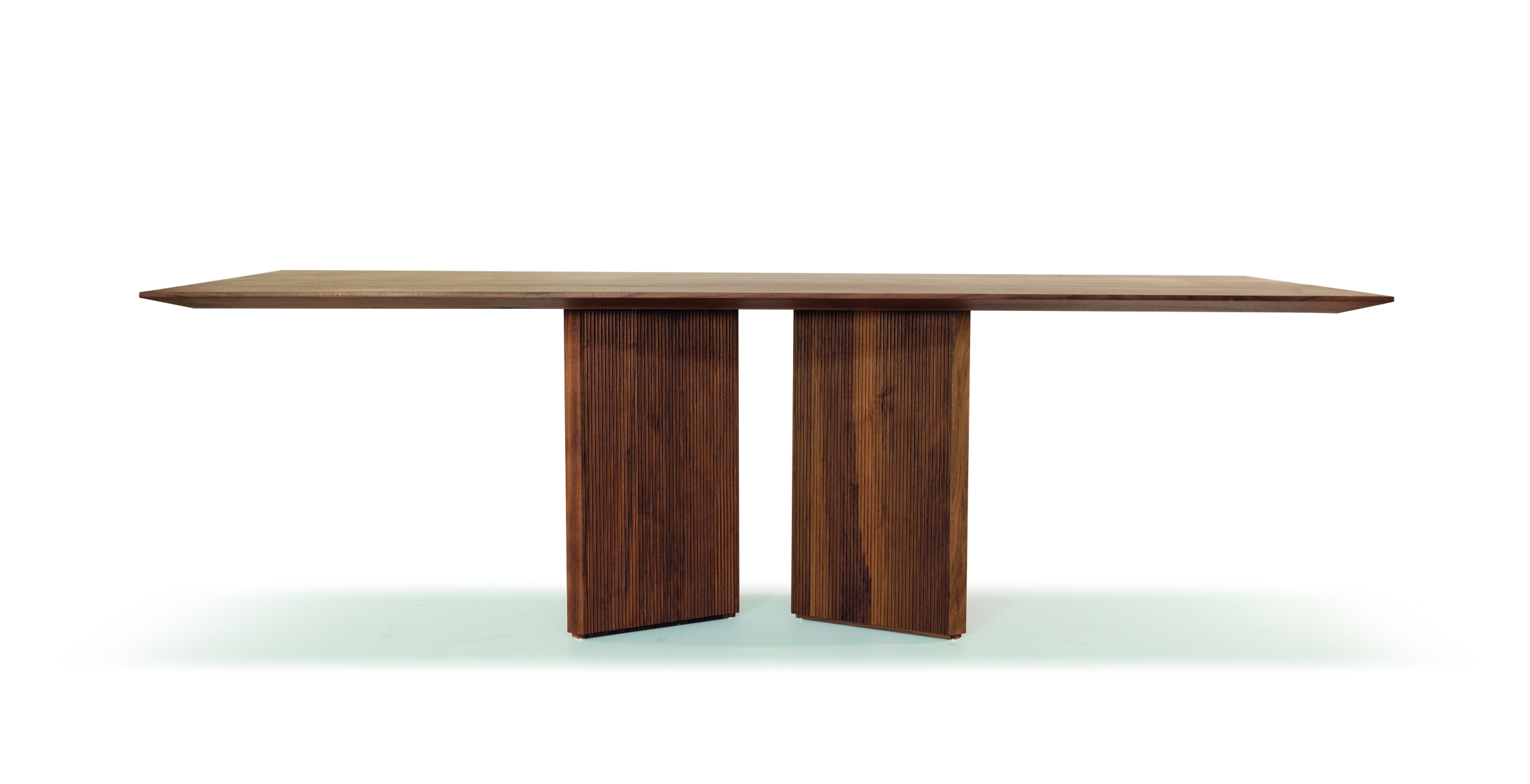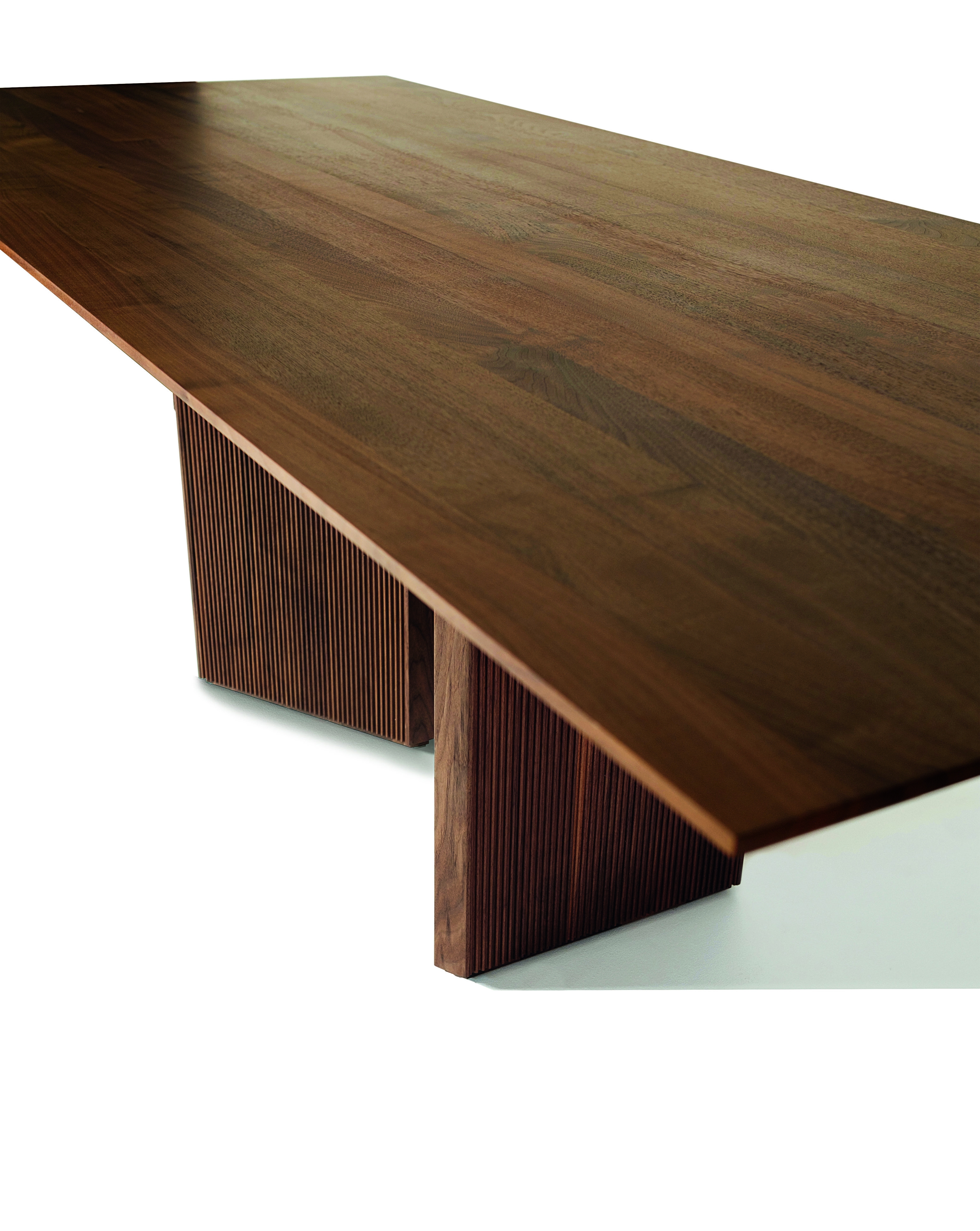 Revo table is part of a broader collection of pieces of furniture which comes from a precise indication by the company's owner: design it using only wood. It was a great challenge because it is not easy to give a formal balance to the different wooden elements so that they are both captivating and can generate a specific artisanal charm when you use or look at them. Simplicity, timeless elegance and cohesion with brand identity are the drivers that influenced the design which is characterized by the presence of two monolithic volumes with a triangular section whose morphology and position generates a positive tension between them. Their envelope is made of milled wood with a linear geometric pattern that makes the element dynamic by playing with light and shadow. The top is flared at the edges so as to make it as less impactful as possible and make it coherent with the rest of the table's design. Revo table embodies the main characteristics that represent Riva 1920 brand: timeless design, craftmanship, quality, tradition and sustainability.