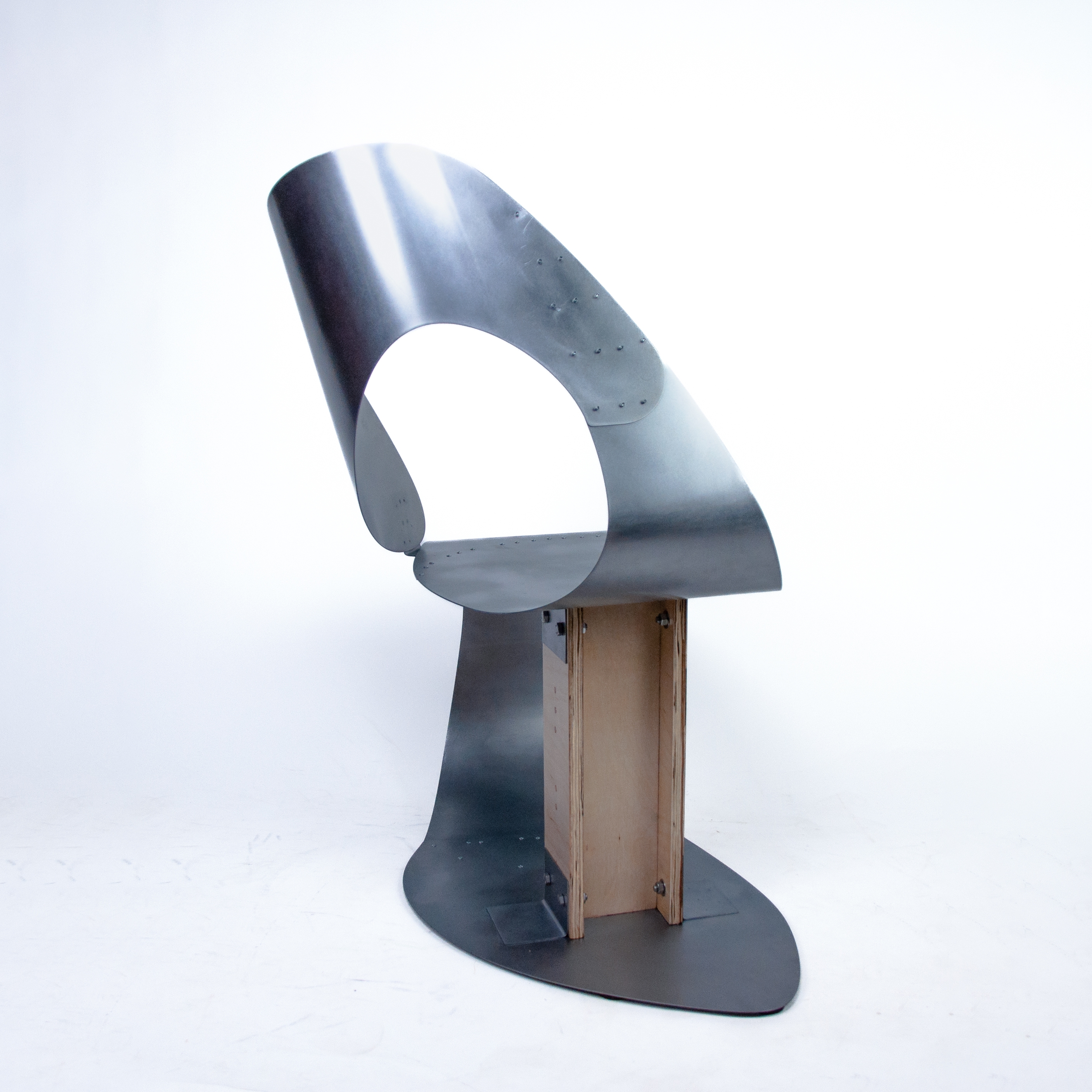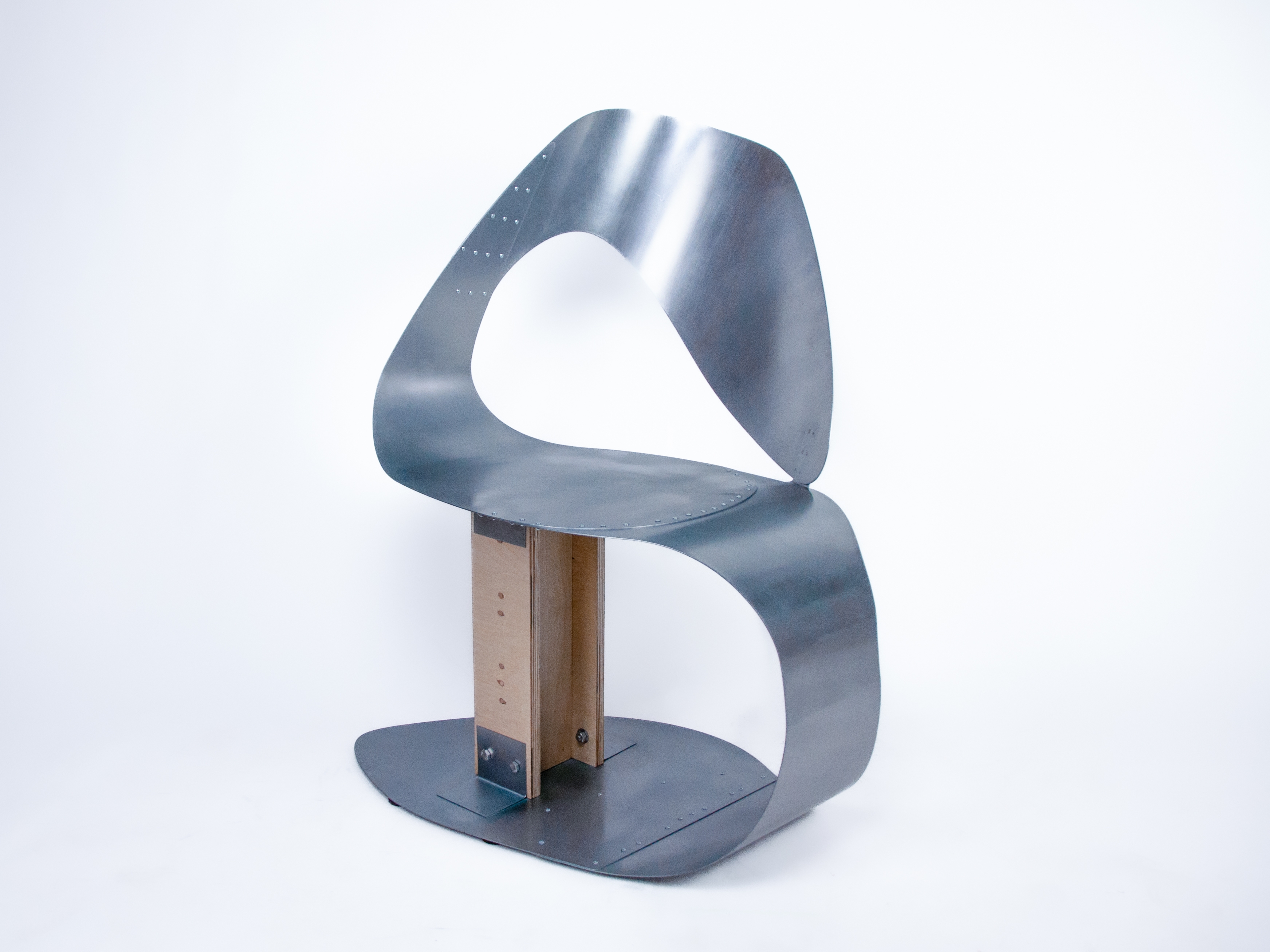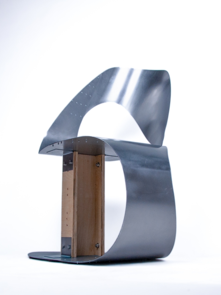 B-47 aims to embody the intricate play of distances in public spaces by manipulating sheet metal's curves and volume. The material choice represents the irritation of external intrusion into privacy: cold and hard, yet people still fall for its reflection on one's internality. Laser cutter, slip roll, and rivets divert the brutality into a gentle enclosure, demonstrating our effort to claim a personal zone in this shared world.
