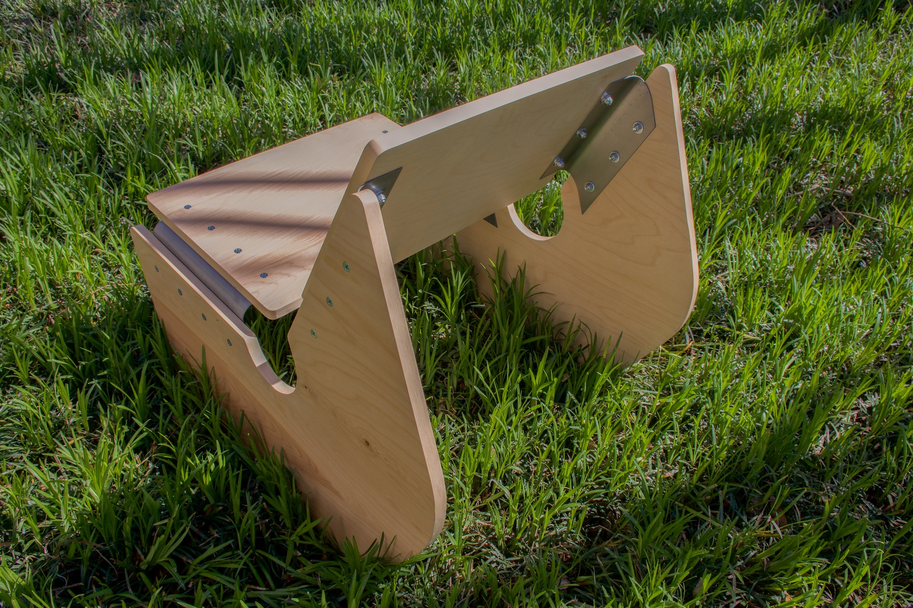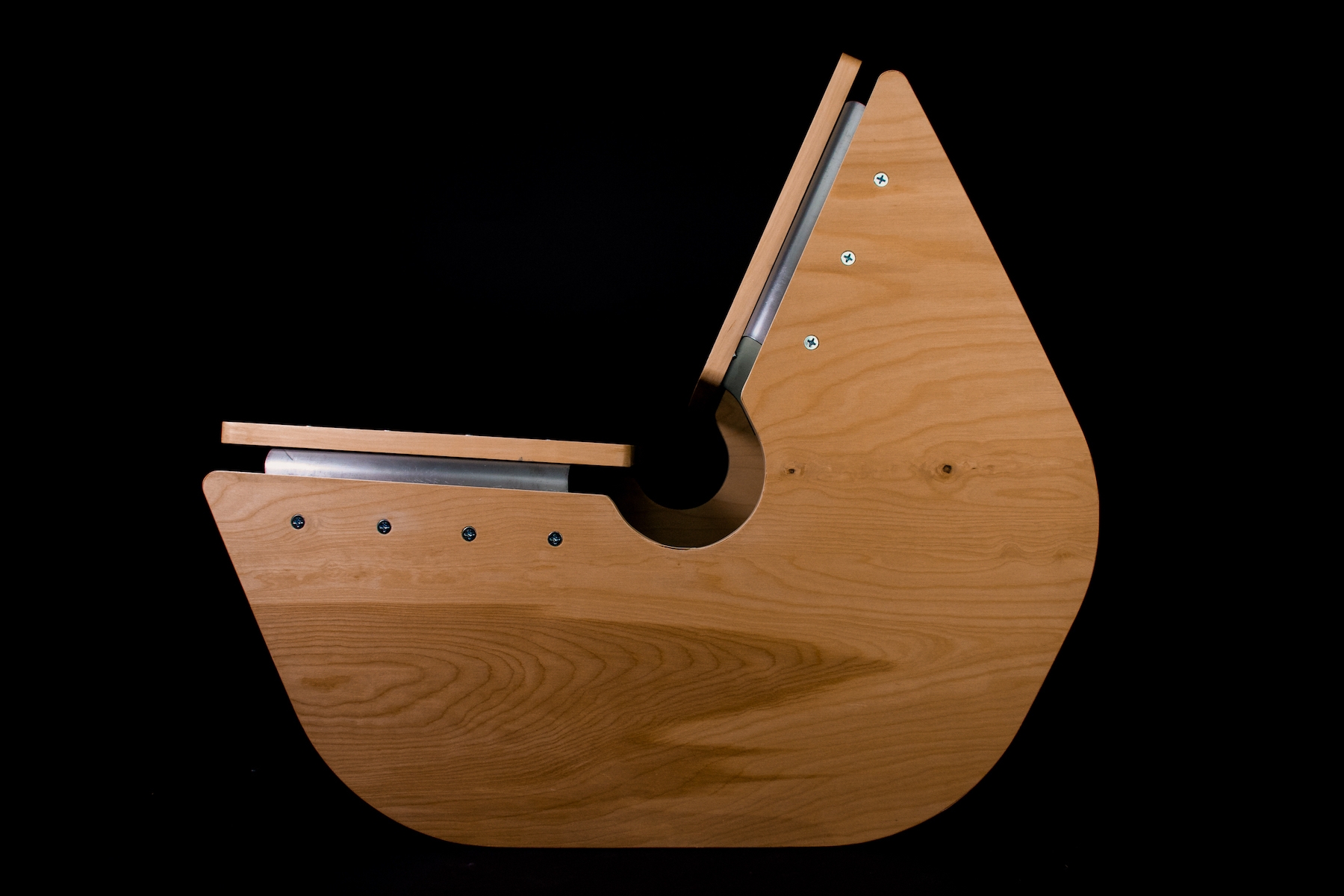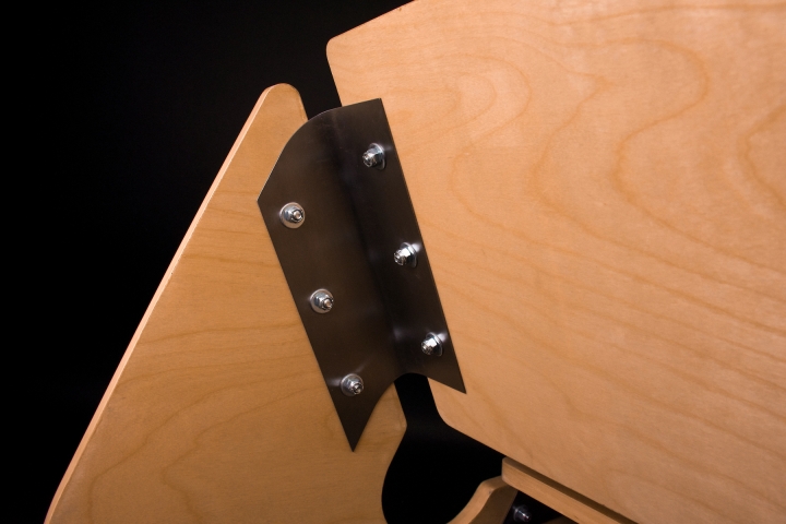 The shape harnesses the planar nature of a chair—abstracted to just a seat, back panel, and parallel legs, the structure of Hexa is composed of birch plywood cut into four geometric panels. Within the deliberate gaps, the bent steel joints become the focal point, and along with the machine screws, balance out the warm wood with an industrial edge.