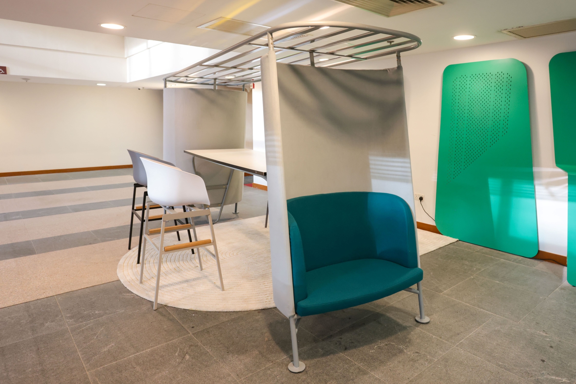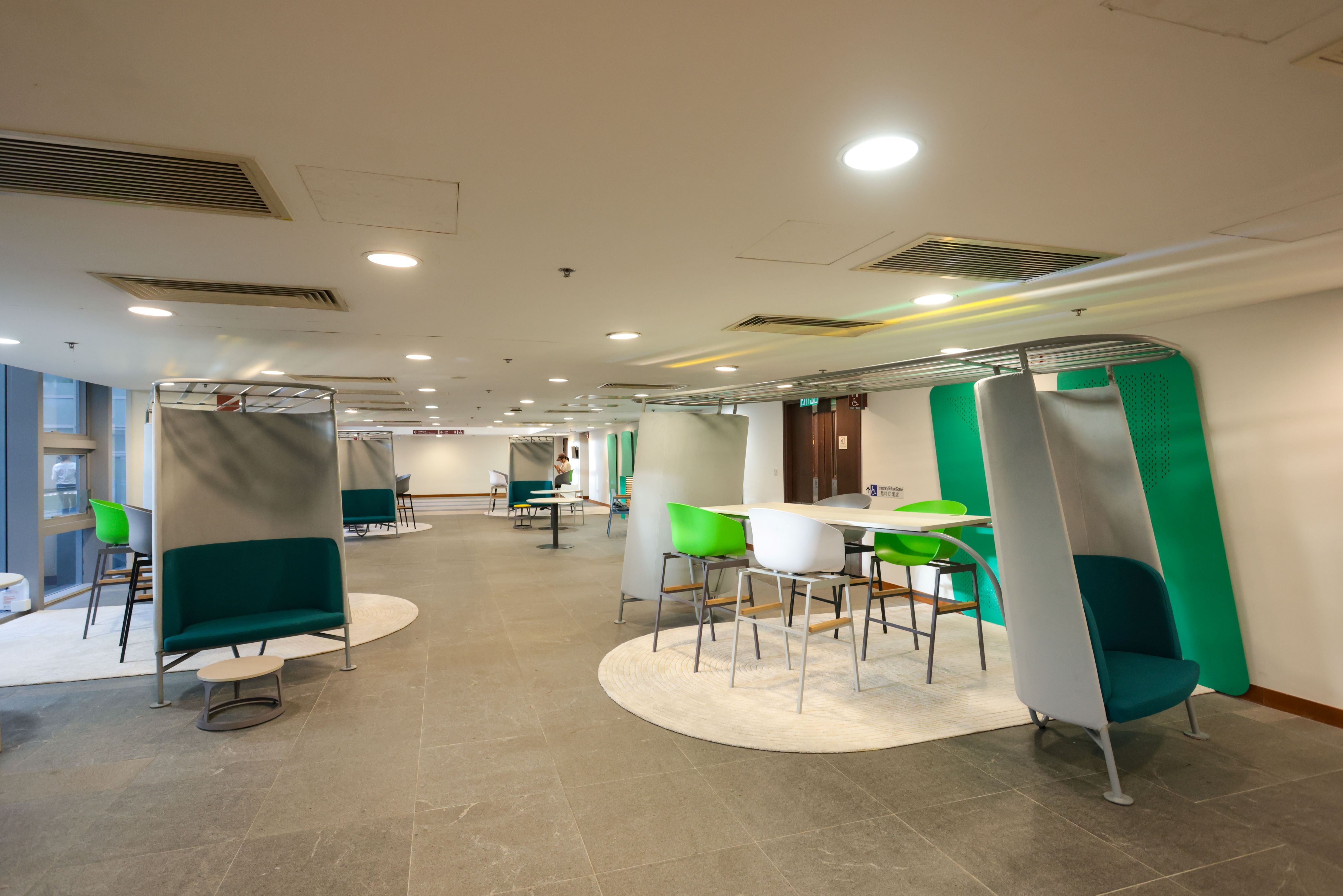 Recognising the scarcity of private space in public settings, Taan Tau ingeniously addresses this challenge by introducing a low settee on each end with sunshade and side panel provides comfort and acoustic shelter from the bustling atmosphere. In contrary, behind the shelter of the low settee is the upcycled table top that creates convenient space for users to stand or sit, encouraging a dynamic and engaging environment. At the top of Taan Tau’s frame are reflective colour mirror strips which create mood lighting effect for the Lounge Space.