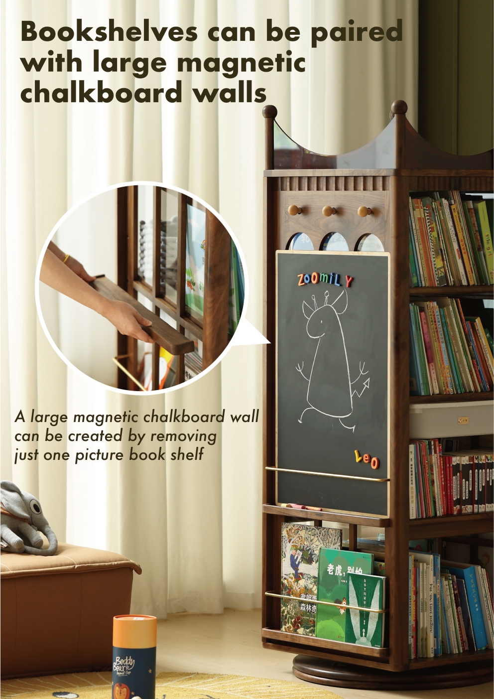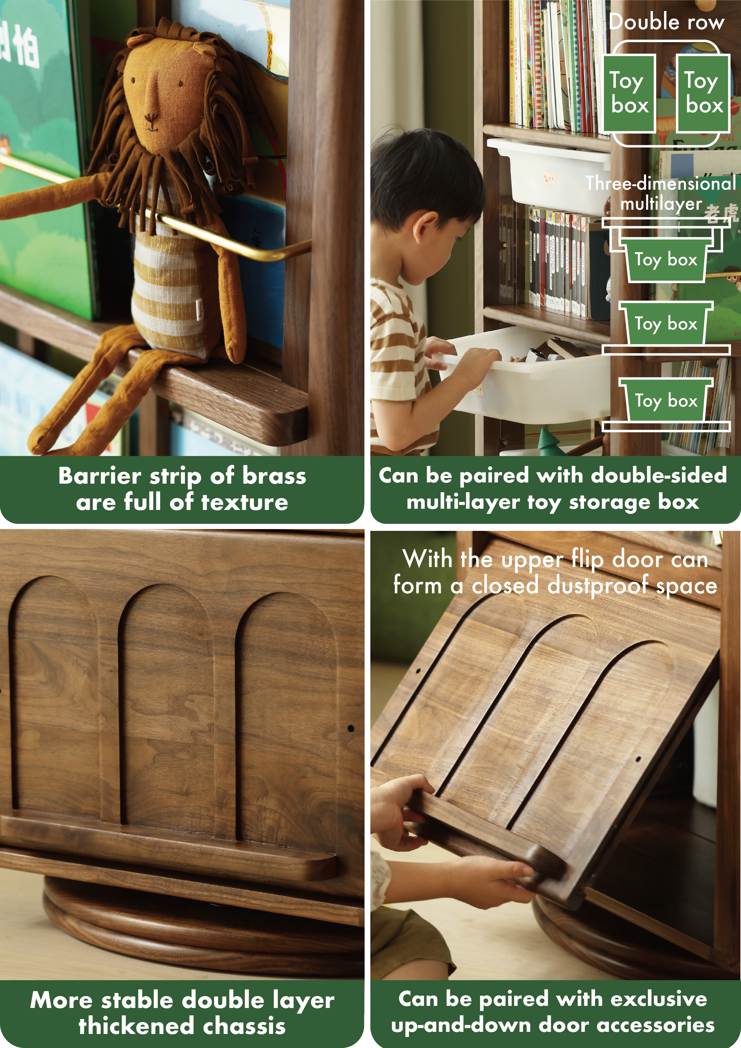 ? In the rotating shelf products, it is the first compatible with IKEA toy box, the first optional dustproof cabinet door. In addition, it can also be optional magnetic blackboard accessories.