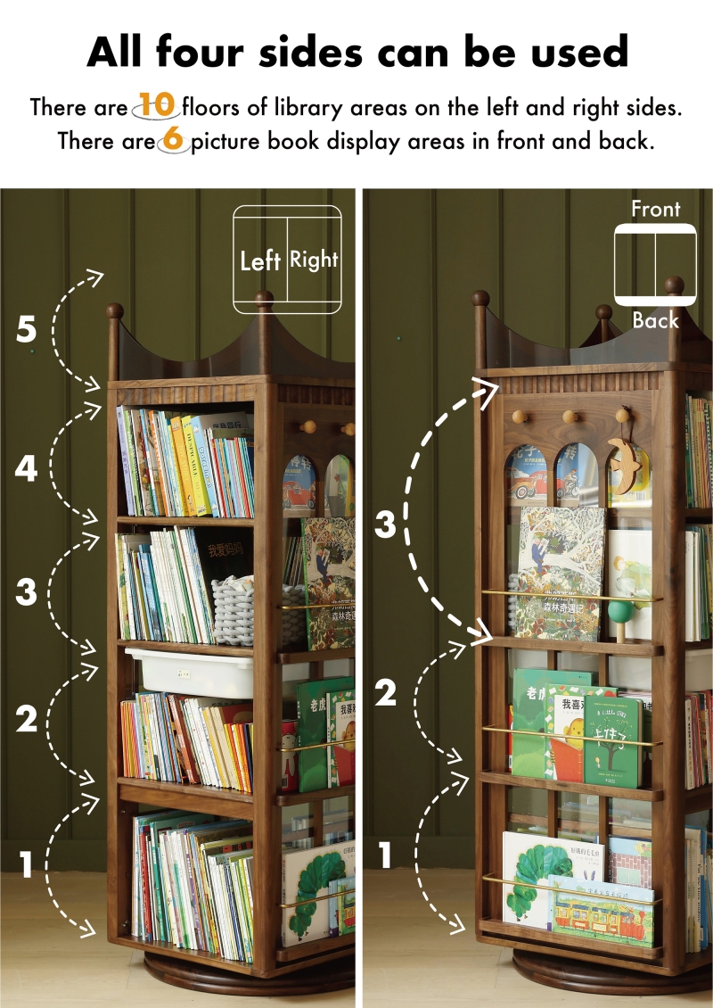 ? It can be used on all four sides, and can hold up to 1600+ picture books (according to 3mm thickness), which is far more than the previous rotating bookshelf.
