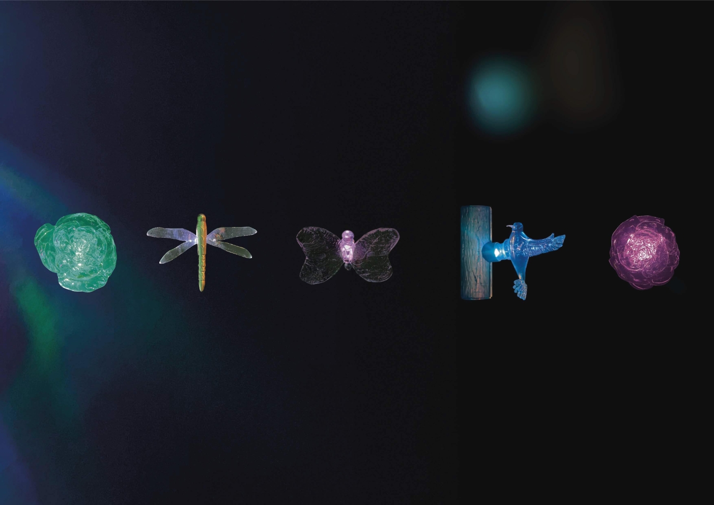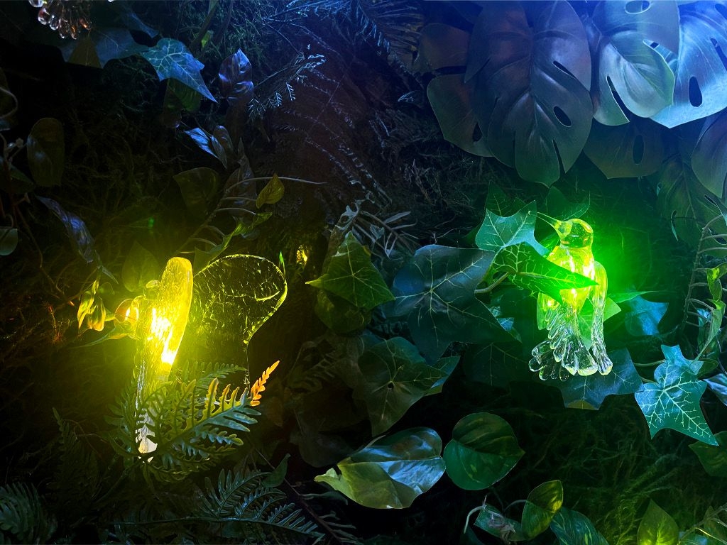 Crafted by hand using the ancient art of glass blowing, each piece has its own identity for the creation of unique spaces. Flowers, hummingbirds, butterflies, dragonflies, and tree trunks transport us to a dreamlike forest that reconnects us with nature.