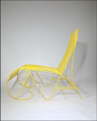 The 3-quarter-inch steel rods are shaped into dynamic contours using bending technique and the MIG welding method, forming a bold yet organic silhouette. The rods arc smoothly to emulate the flow of cresting waves while maintaining a sleek, sophisticated style. The piece is then powder coated in a vibrant yellow hue, also paying homage to Ghana's vibrant coastline and creating an eye-catching look. The combination of steel, sweeping shapes, and coloration allows this lounge chair to make a striking statement while blending harmoniously into varied places and spaces.