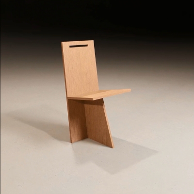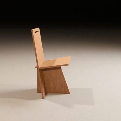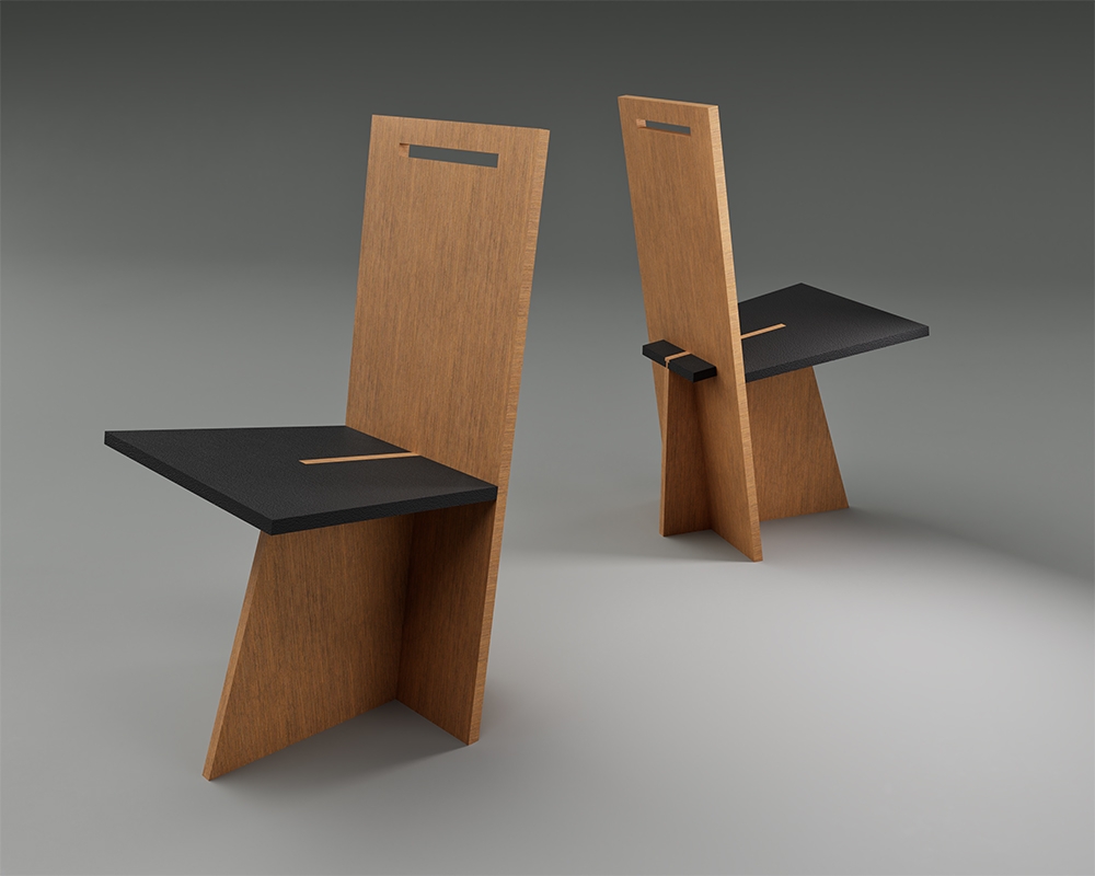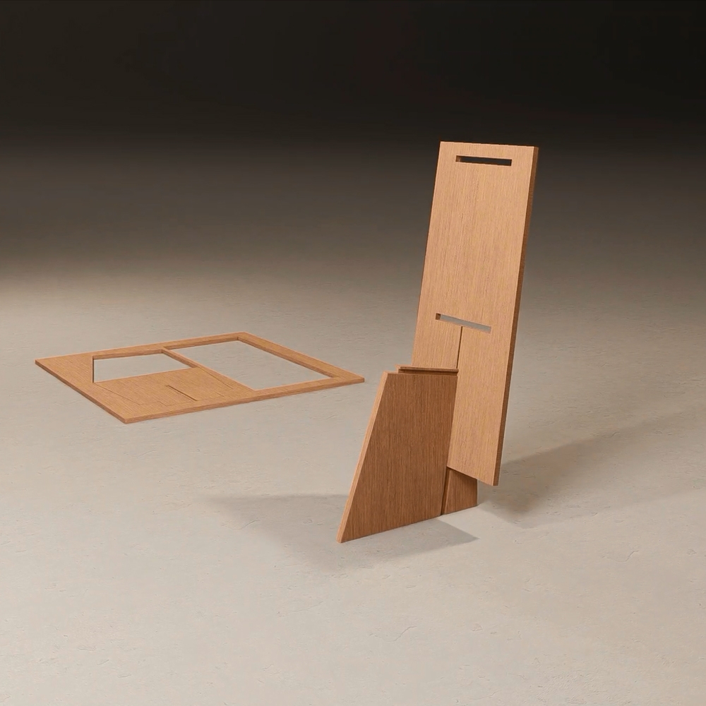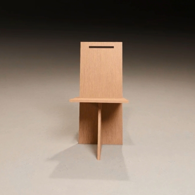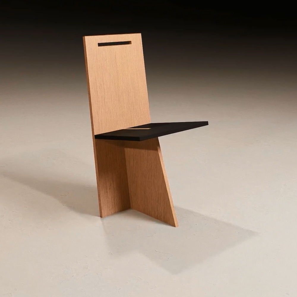 Sahm is constructed of three machine-cut pieces of wood. The idea was to design a chair which would be both rational sustainable and expressive. Construction and design or engineering and aesthetic, are equated with a minimum of visible creative effort, so that it is designed by an impression of simplicity even though the system behind it is highly complex. The various parts are connected in such a way that the overall construction appears self-contained. However, to ensure that no clearly delineated space is created, the elements are locked into each other with simple joints. Each part slips beyond the particulate configuration to which it belongs. The complexity of the construction is matched by its engineering principles. The seat and keel are of similar dimensions so when stacking vertically they equal the back in height. Each chair is cut from a single sheet of plywood. The chair has dovetail joinery where the seat meets the keel with a slip joint where the back engages the seat and keel. The chair is designed for easy shipping and assemblage.