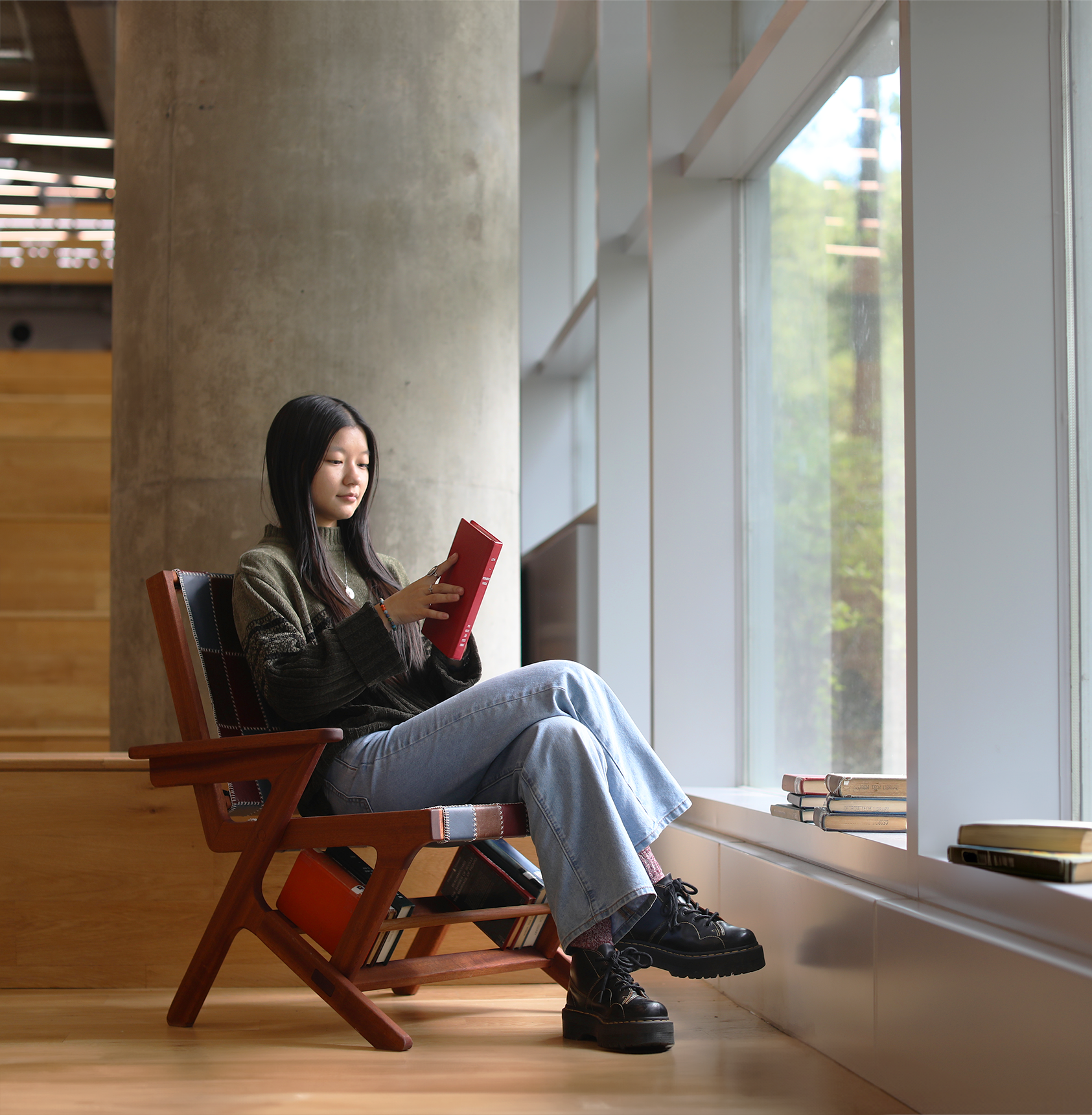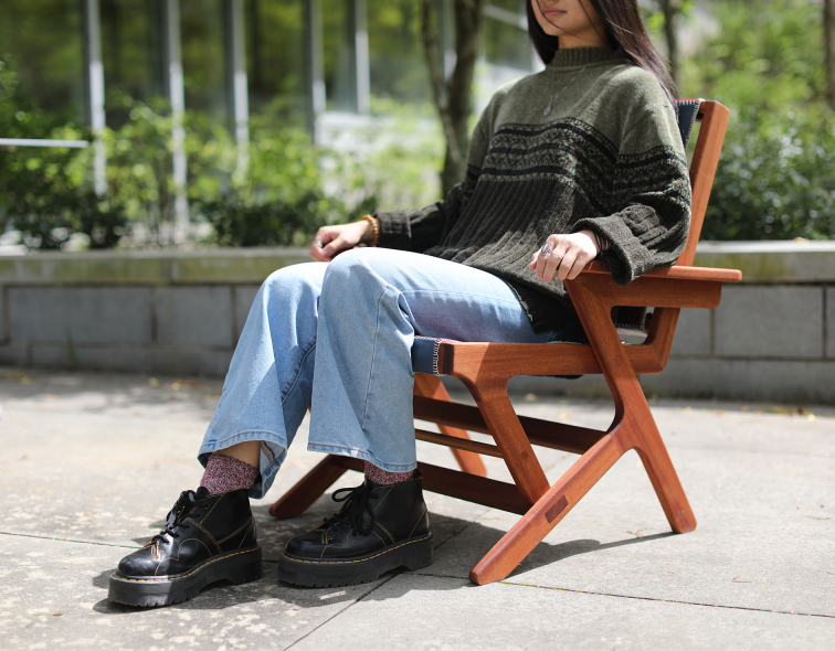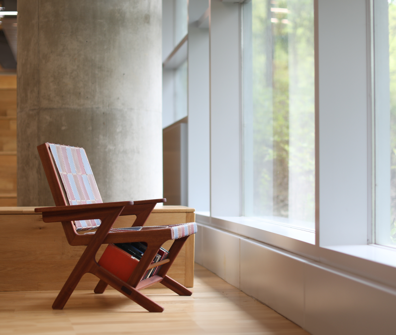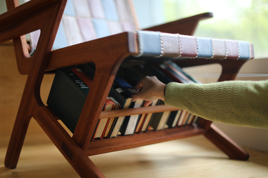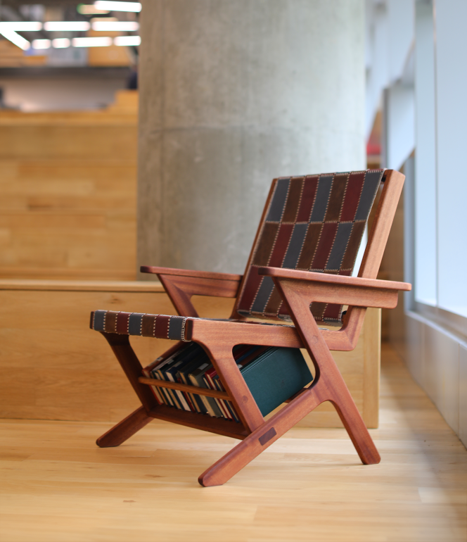The Patina Chair is a sapele wood lounge chair that merges timeless charm and modern functionality. Drawing inspiration from mid-century modern and eclectic style, this chair features dynamic lines, clean curves, and thoughtful craftsmanship. Incorporated into the base of the chair is a built-in bookshelf that integrates form with function and nods towards the mid-century modern and eclectic inspiration.