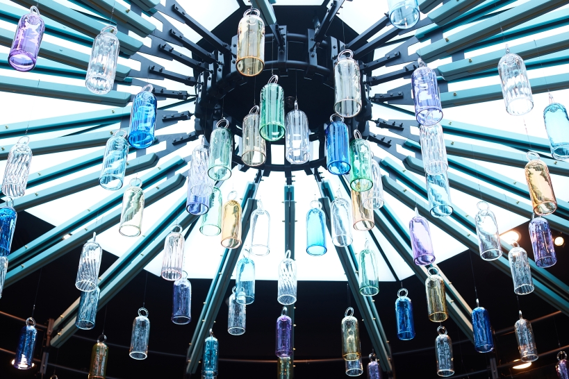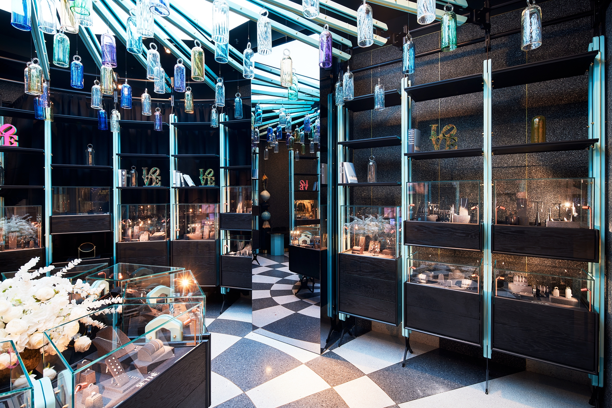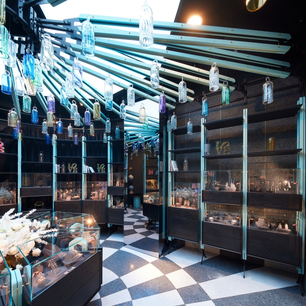 The buildup began with the monochromatic terrazzo floor - a mosaic of black and white inspired by the timeless elegance of Italy in the 60’s and ended with a touch of authenticity given by 120 hand-blown glass bells suspended above. Made of recovered remnants from other projects, these bells were initially designed to overlay the jewelry on the shelves.
