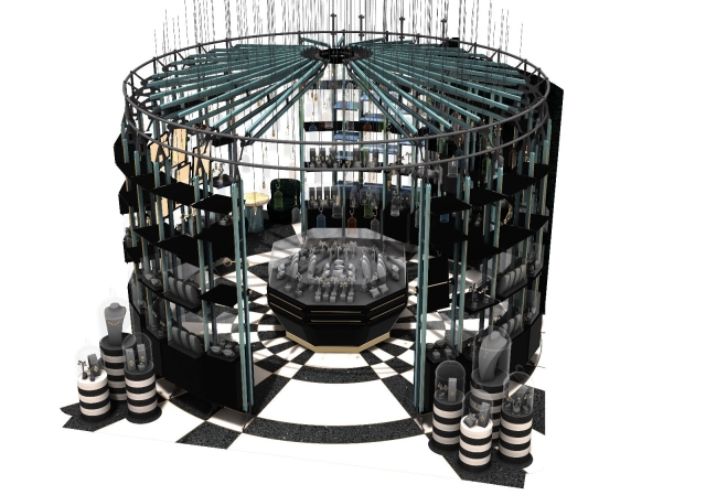 The interior is made of utmost quality materials such as terrazzo, aged brass, rustic oak, and solid black-painted wood, in order to blur the lines between the opulence of luxury diamonds and the concept of a pop-up design.