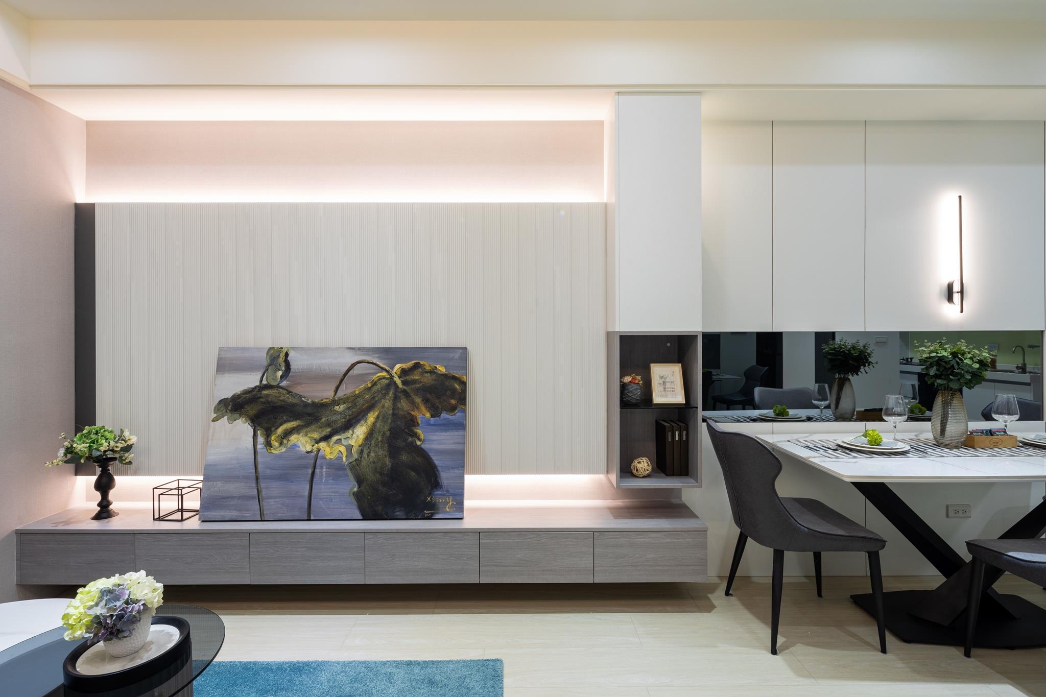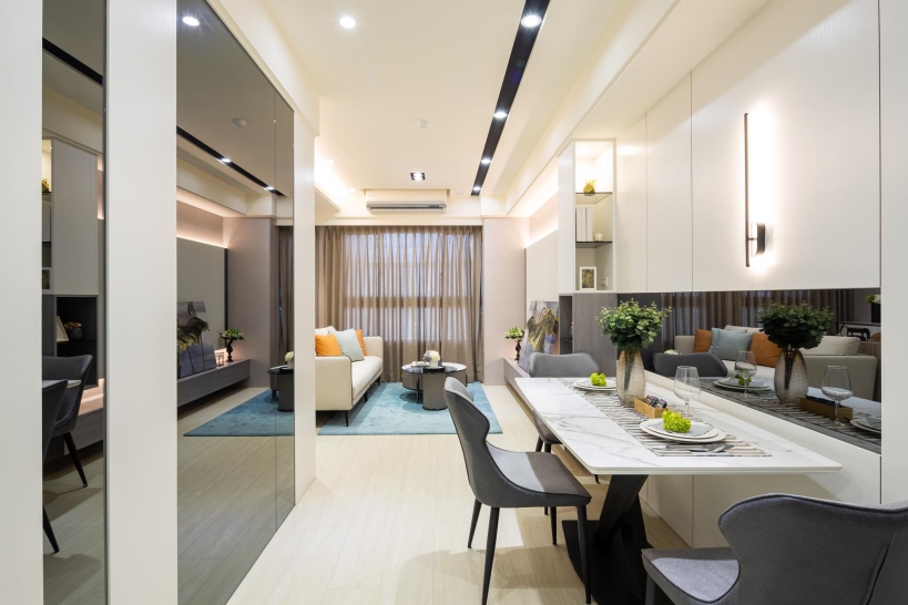 Crafted to optimize movement, a suspended tall cabinet stands out in the entrance foyer, complemented by lighting for ambiance and functionality. Warm wood panels and gracefully curved gray mirrors, accented by decorative columns, guide the eye to the living and dining areas. Gray mirrors and beige panels add depth and openness, defining areas and enhancing spatial dynamics.