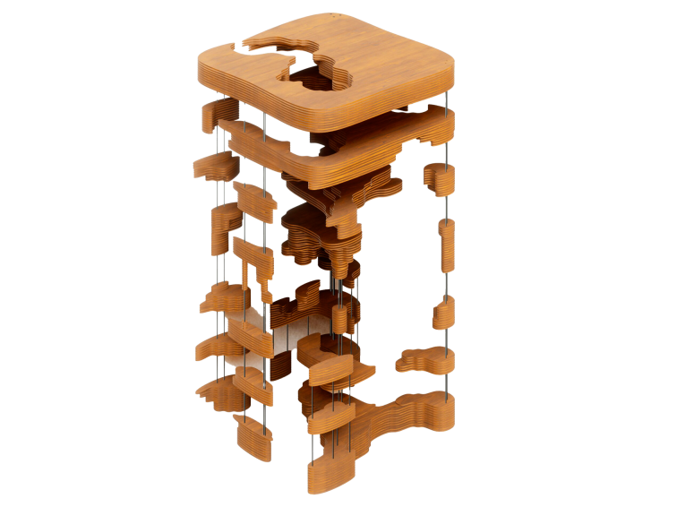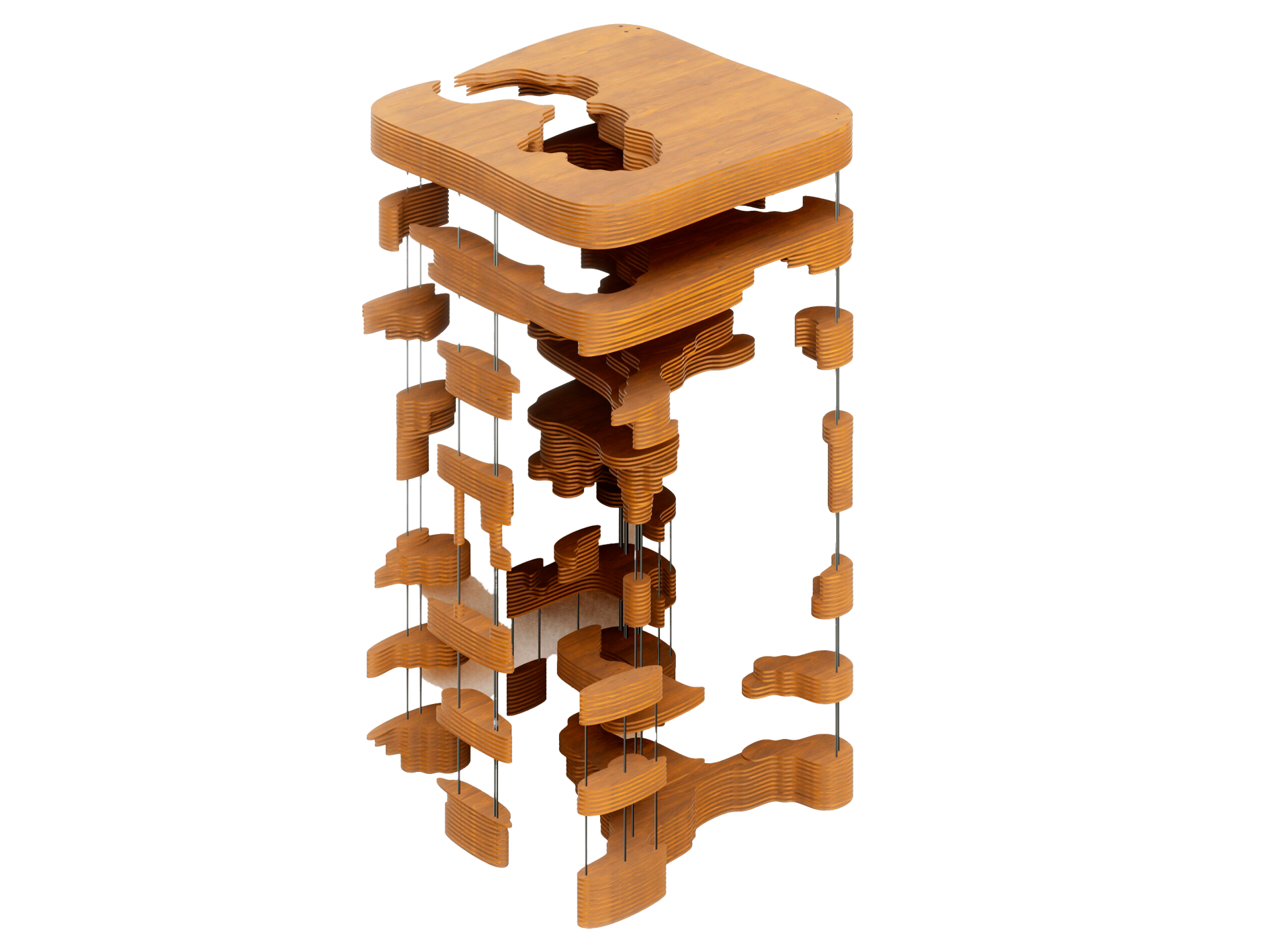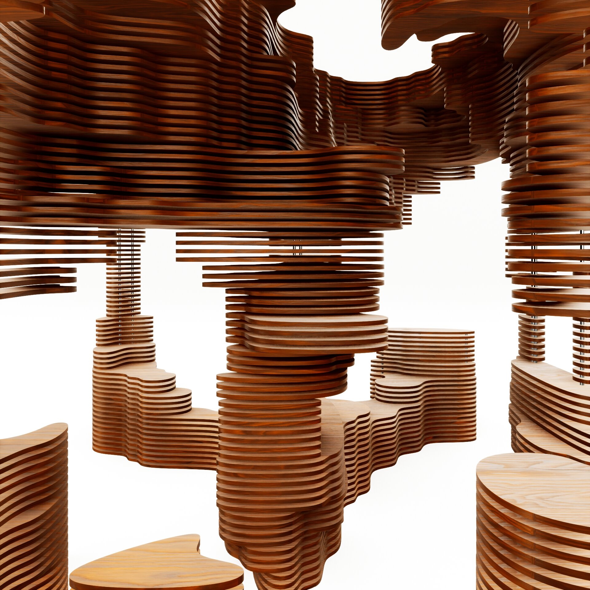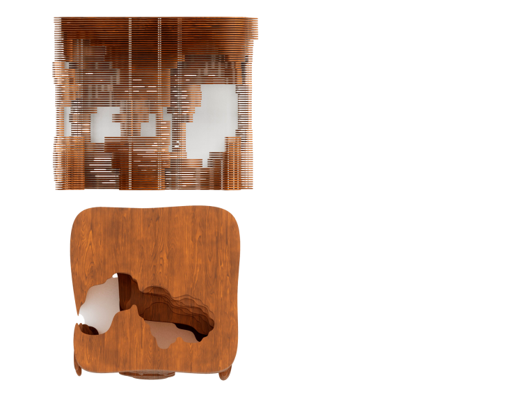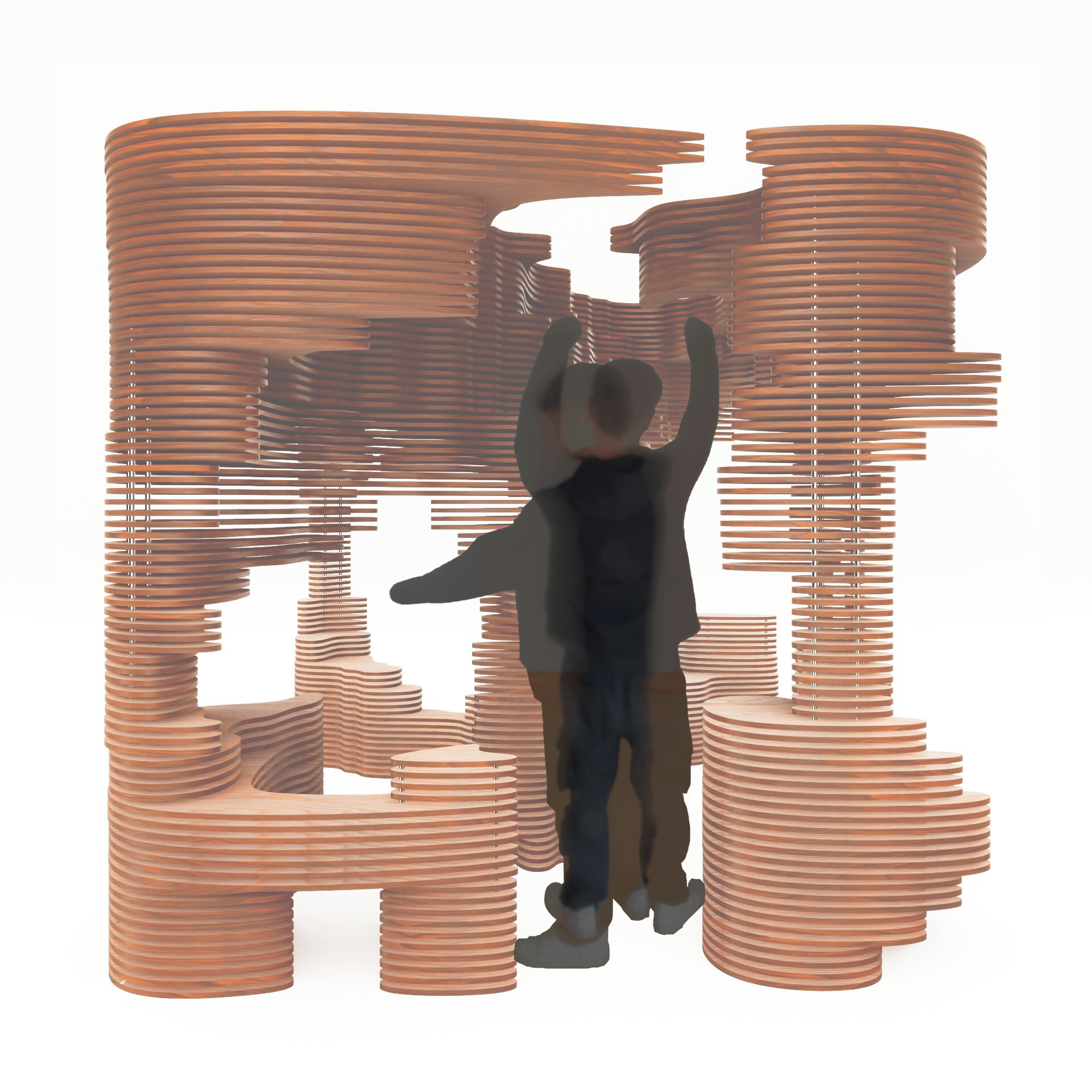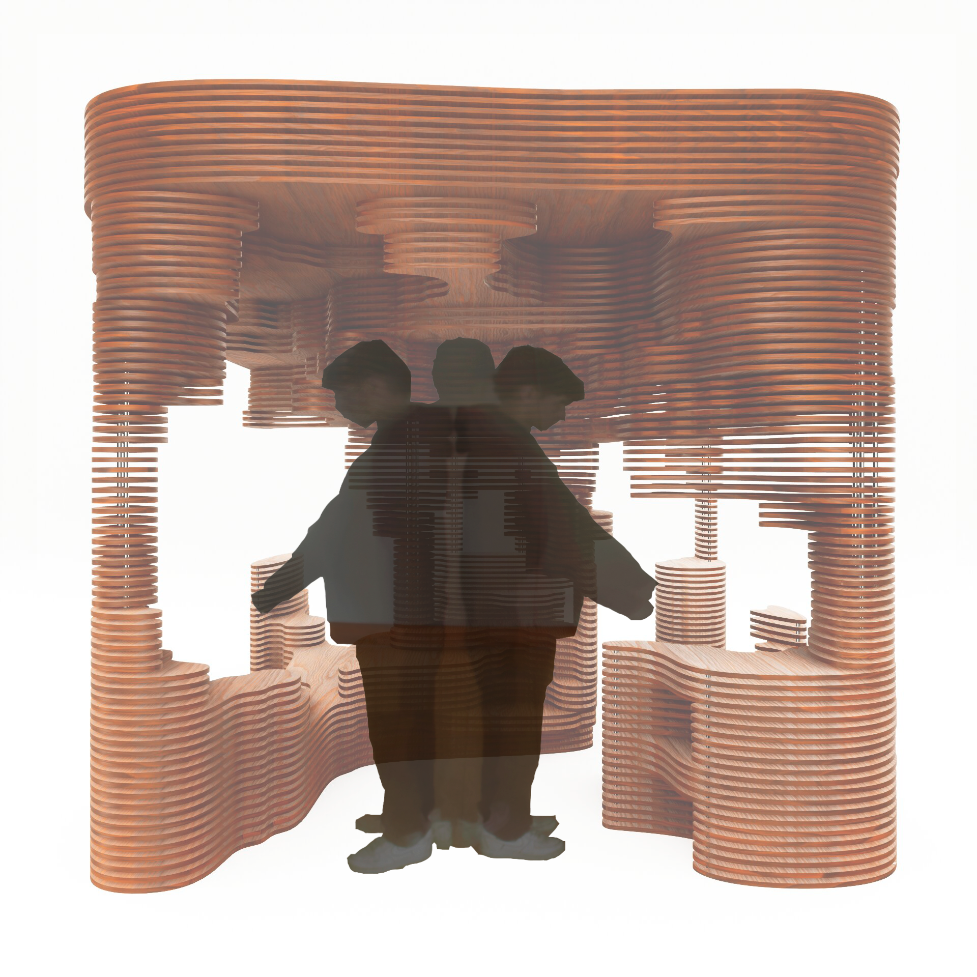 Immersive closet that reinterprets the experience of dressing as a ritual, integrating the concept of a "temple for dressing." The project aims to showcase clothing as works of art rather than hiding them. Each garment becomes part of a personal gallery, demanding an interior design that presents them attractively. Moreover, this closet is not just functional but also interacts with its surroundings. Our inspiration for the shape comes from the erosion of rocks. Thus, the user acts as the erosive agent, much like nature sculpts rocks over time.