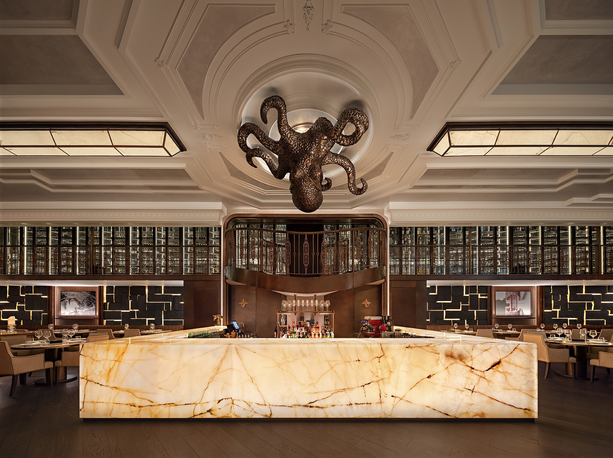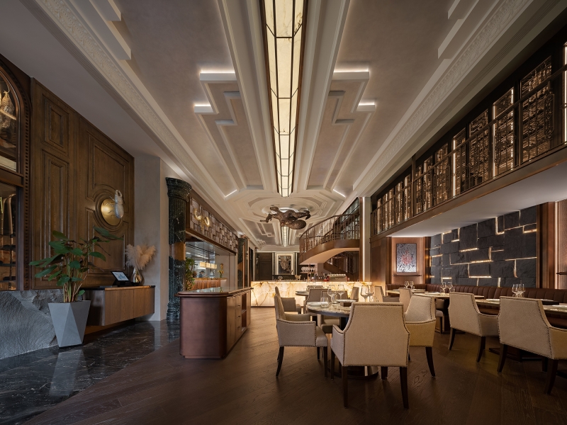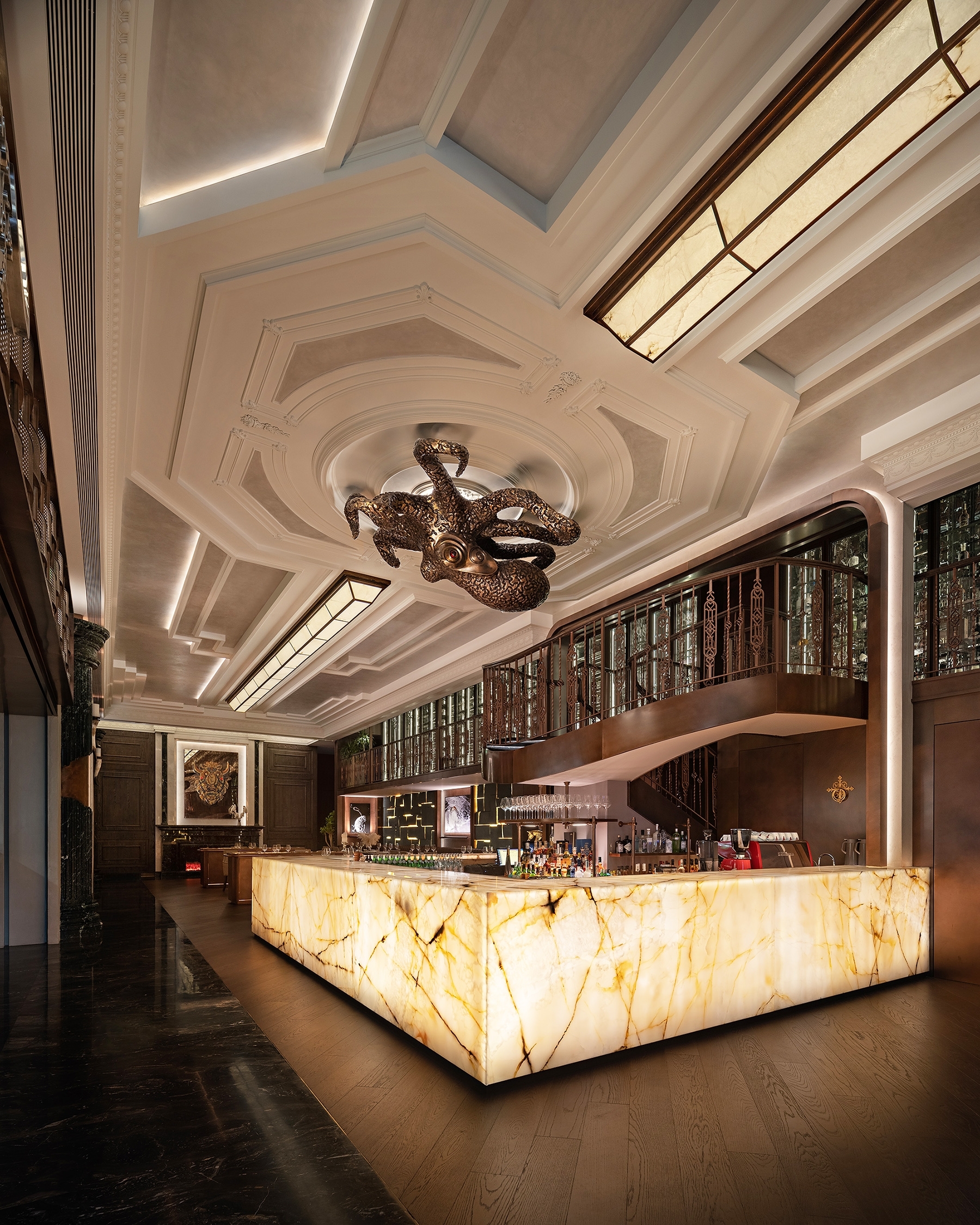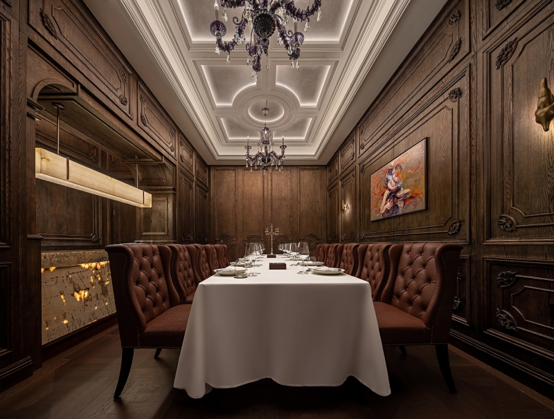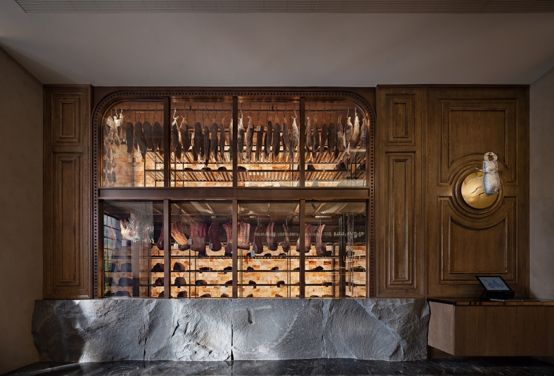 Main design features include the double-height dry-aging room, the “octopus” translucent central bar, a generous open kitchen, a mezzanine wine showcase, 5 private VIP rooms and the main dining area with a ceiling height of 5 meters. To achieve the customized, genuine expression of all installations and materials, numerous pieces require specialized manufacturing techniques at specific facilities throughout the country.