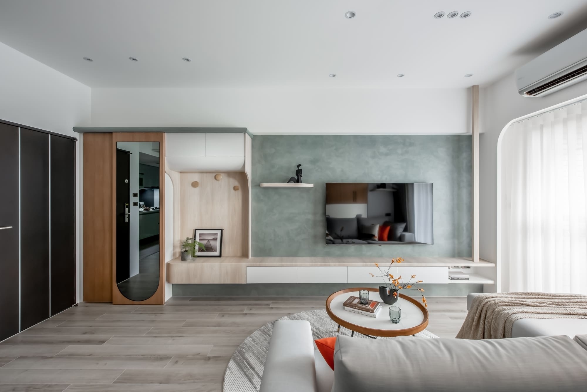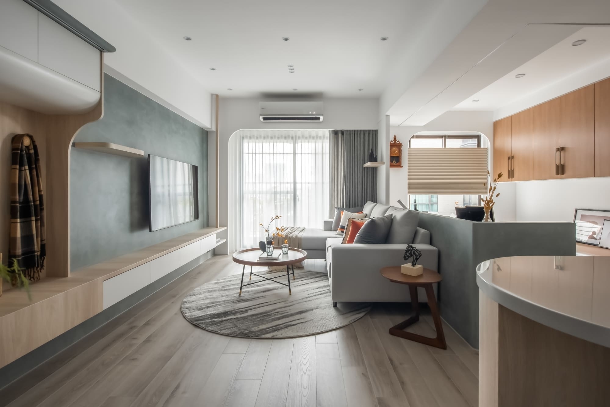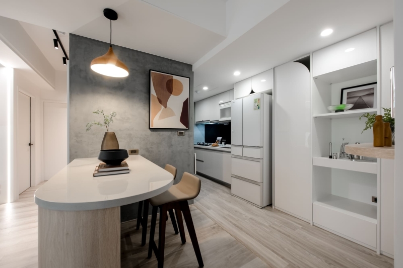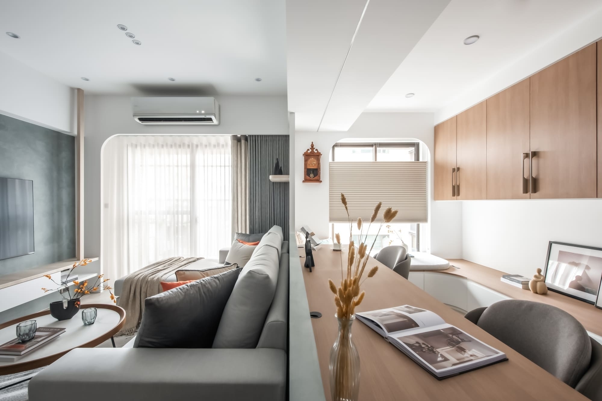 When you enter the designer's space, you'll immediately notice the open layout. The living room, dining room, kitchen, and study are all connected, creating a spacious area for the family to connect and communicate. The open space creates emotional closeness, and the wooden shoe cabinet and grey-blue TV wall in the living room blend seamlessly, creating a consistent design that distinguishes the functional spaces by colour. The study behind the sofa is decorated with warm wood, making it an ideal spot for quiet reading. Additionally, the dining table doubles as storage in the dining area, providing a multi-functional space for the family to utilize.