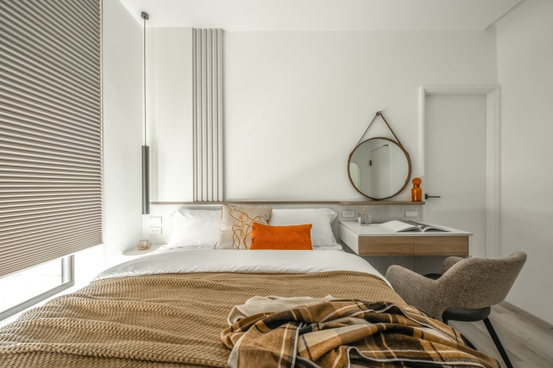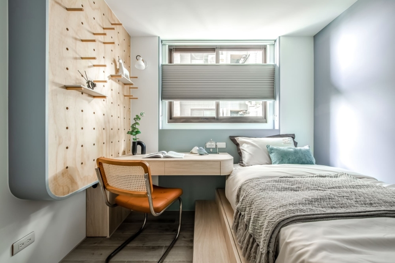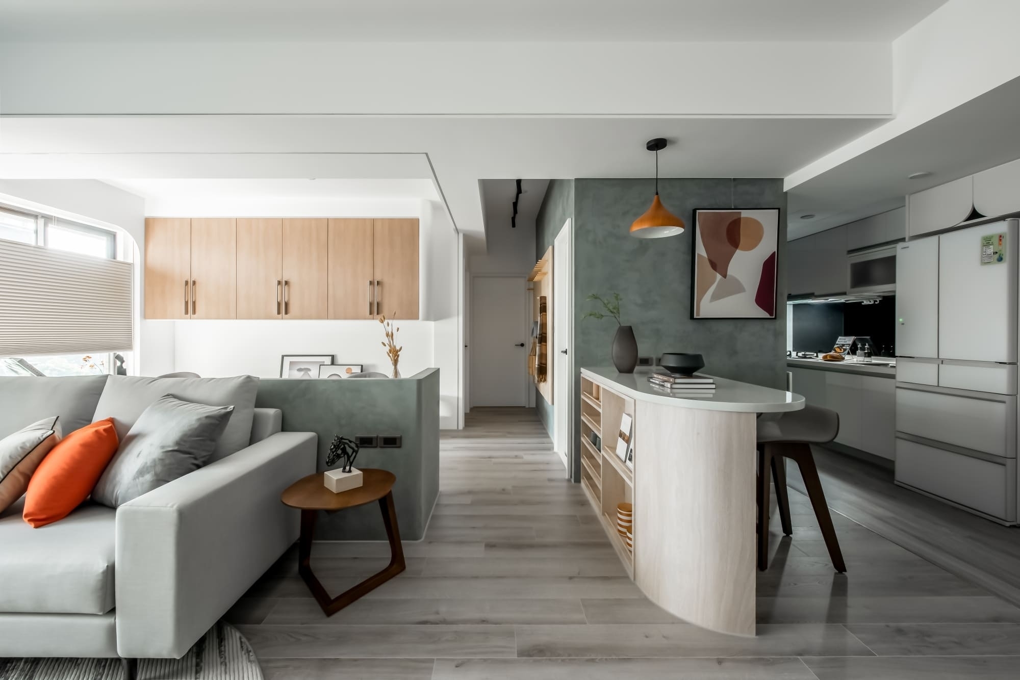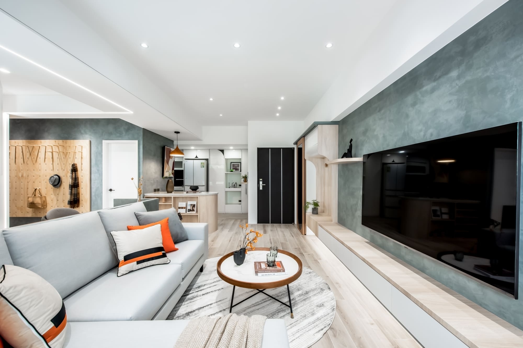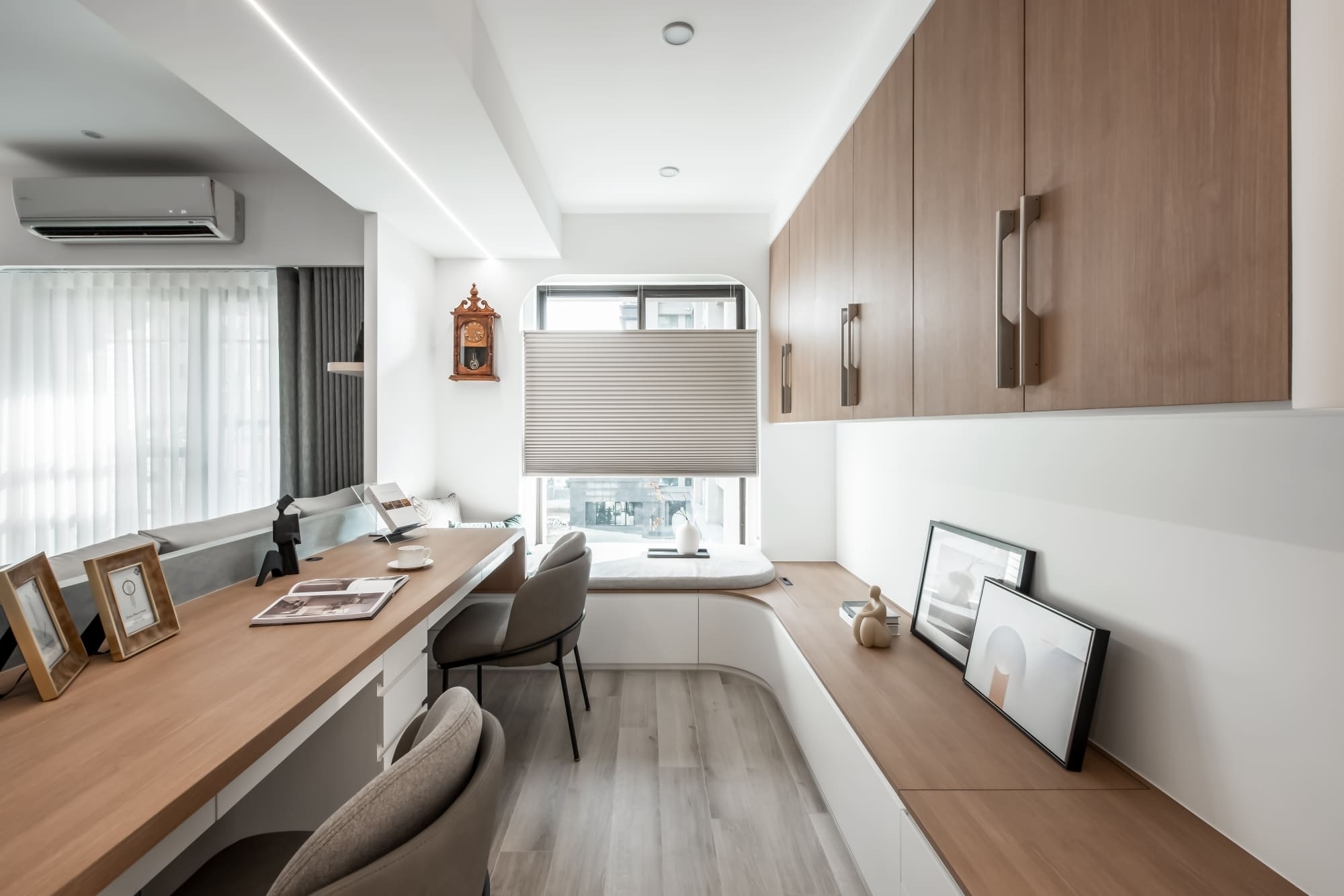When you enter the designer's space, you'll immediately notice the open layout. The living room, dining room, kitchen, and study are all connected, creating a spacious area for the family to connect and communicate. The open space creates emotional closeness, and the wooden shoe cabinet and grey-blue TV wall in the living room blend seamlessly, creating a consistent design that distinguishes the functional spaces by colour. The study behind the sofa is decorated with warm wood, making it an ideal spot for quiet reading. Additionally, the dining table doubles as storage in the dining area, providing a multi-functional space for the family to utilize.