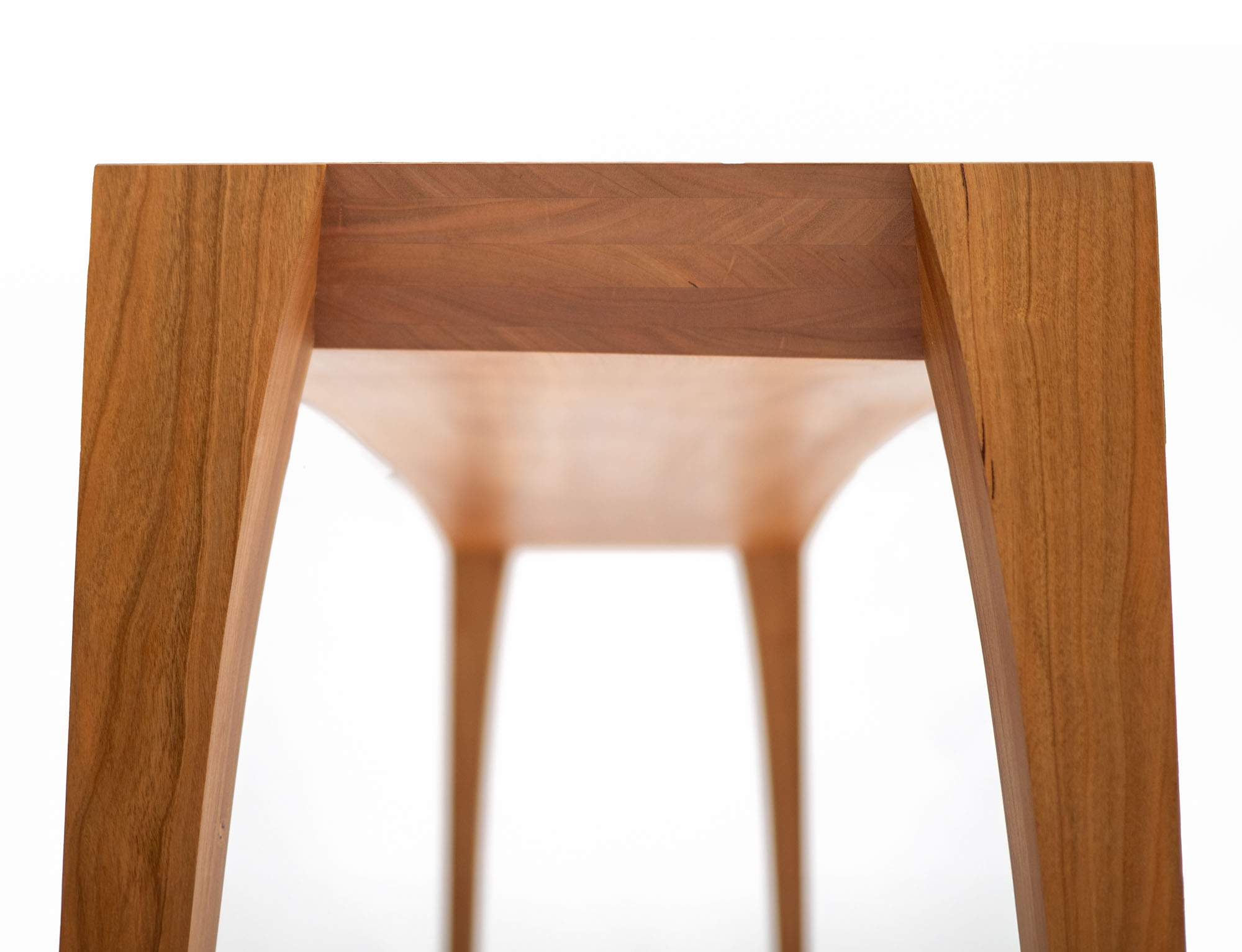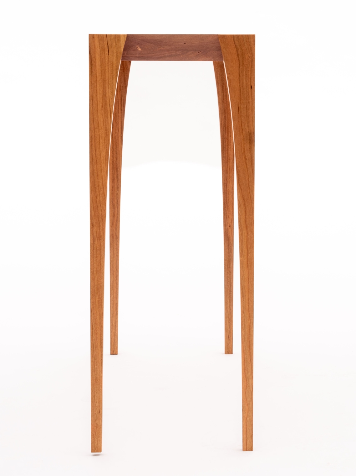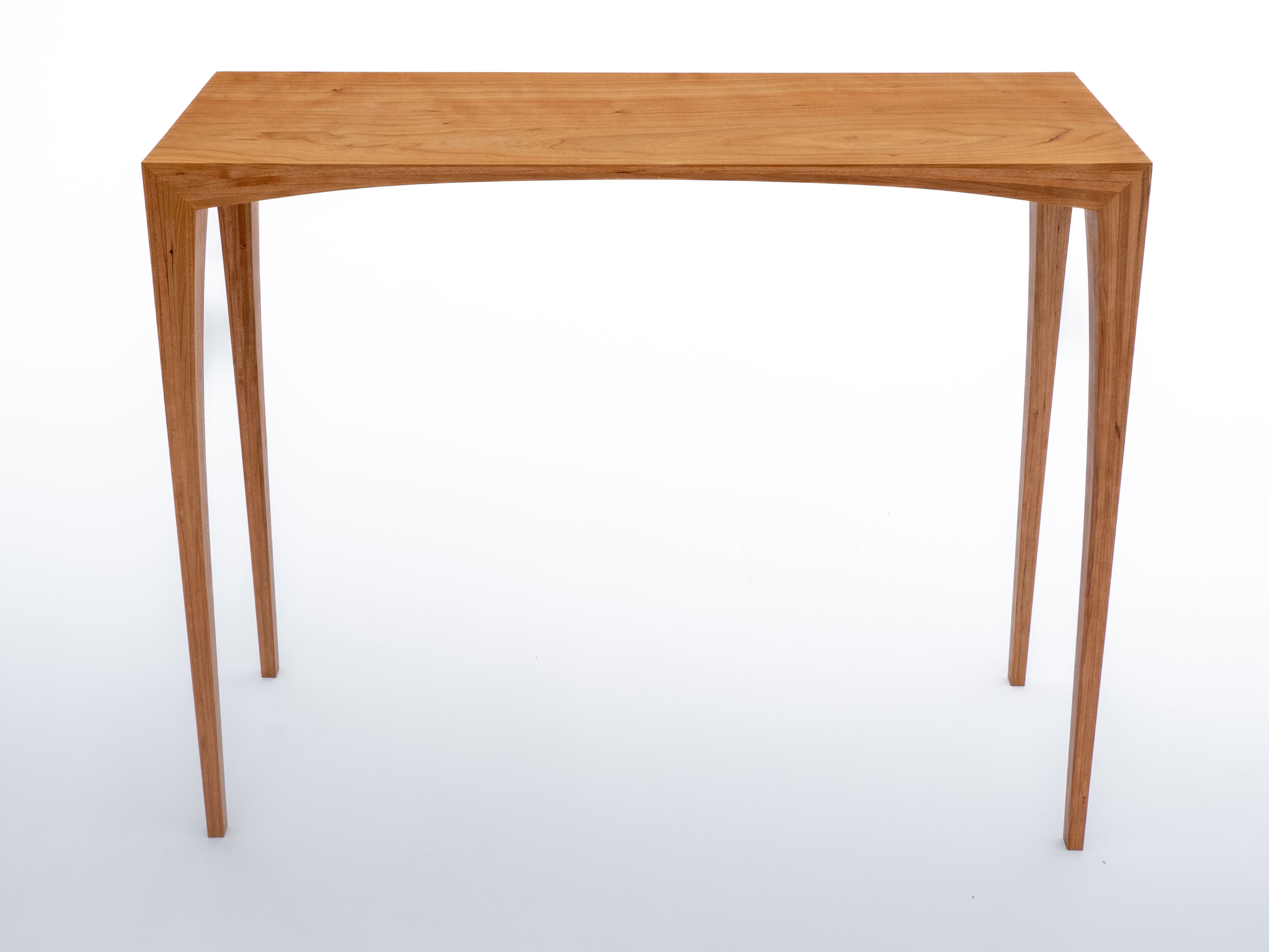 The idea for this side table originated from a pencil sketch. The table’s focal point became the miter joint between the top and the legs, while the subtle curves enhanced the table’s sophistication. I became so enamored with this table that I could not resist building it. I built the table using bent tapered laminations, which allowed me to experiment with the limits of the process and the material. I wanted to see how thin I could make the top and legs while making the table solid and rigid enough for daily use. The result? I will let you decide…