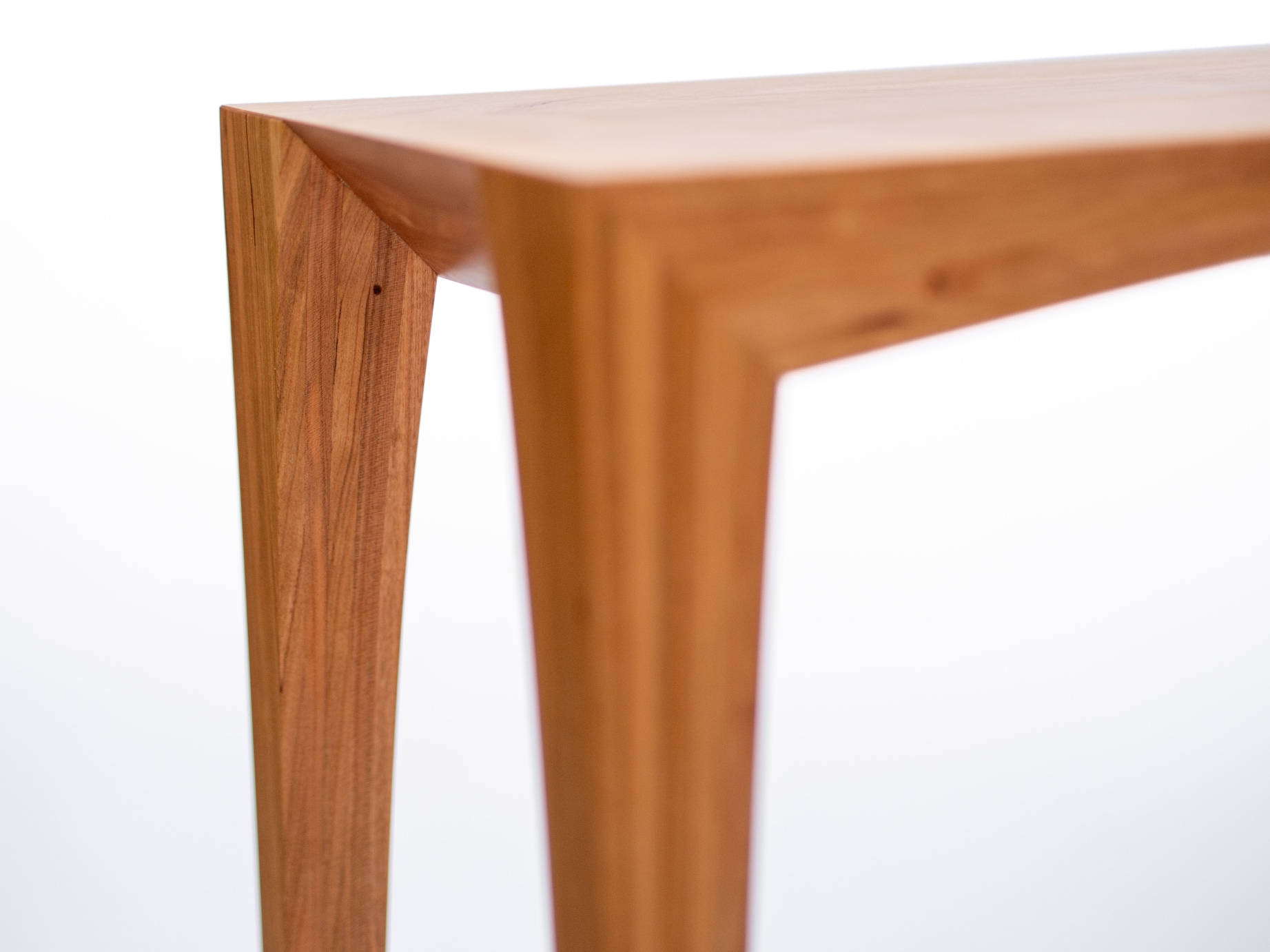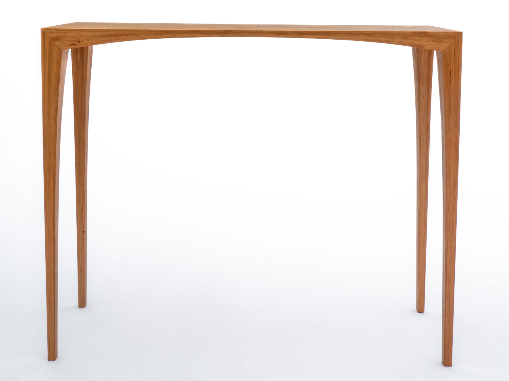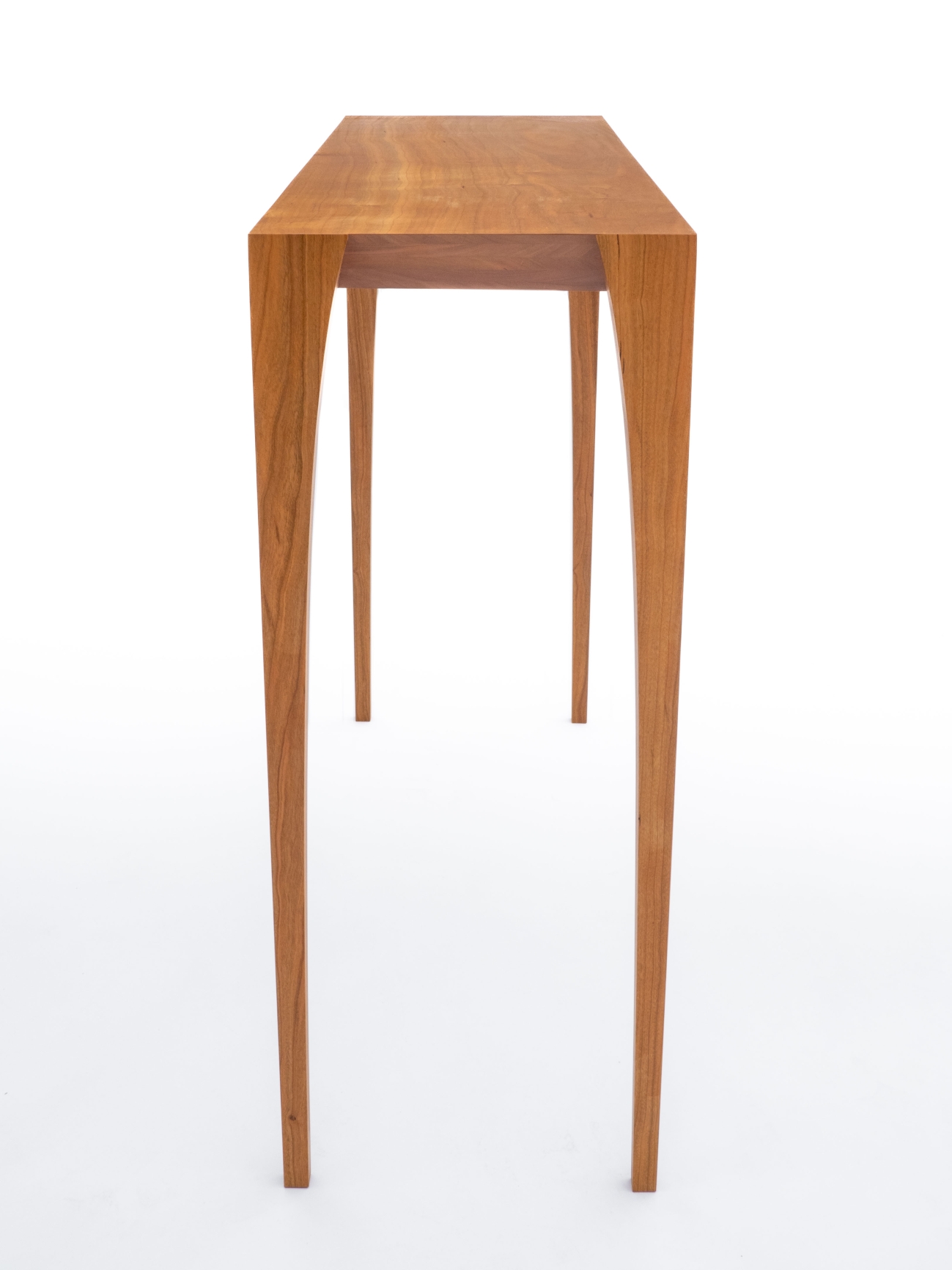 The idea for this side table originated from a pencil sketch. The table’s focal point became the miter joint between the top and the legs, while the subtle curves enhanced the table’s sophistication. I became so enamored with this table that I could not resist building it. I built the table using bent tapered laminations, which allowed me to experiment with the limits of the process and the material. I wanted to see how thin I could make the top and legs while making the table solid and rigid enough for daily use. The result? I will let you decide…